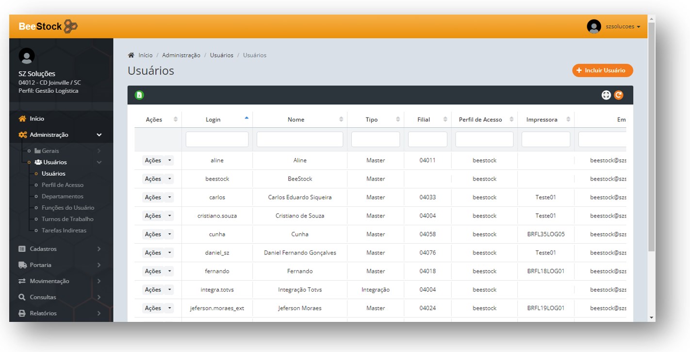 Located in the Administration > Users > Users menu, this screen will list all users registered in the system as well as their access parameters.