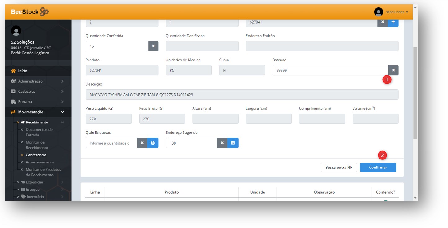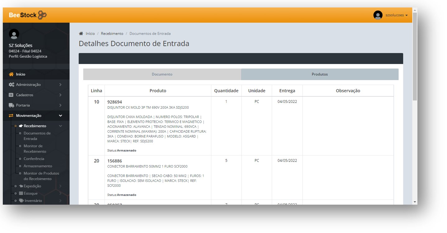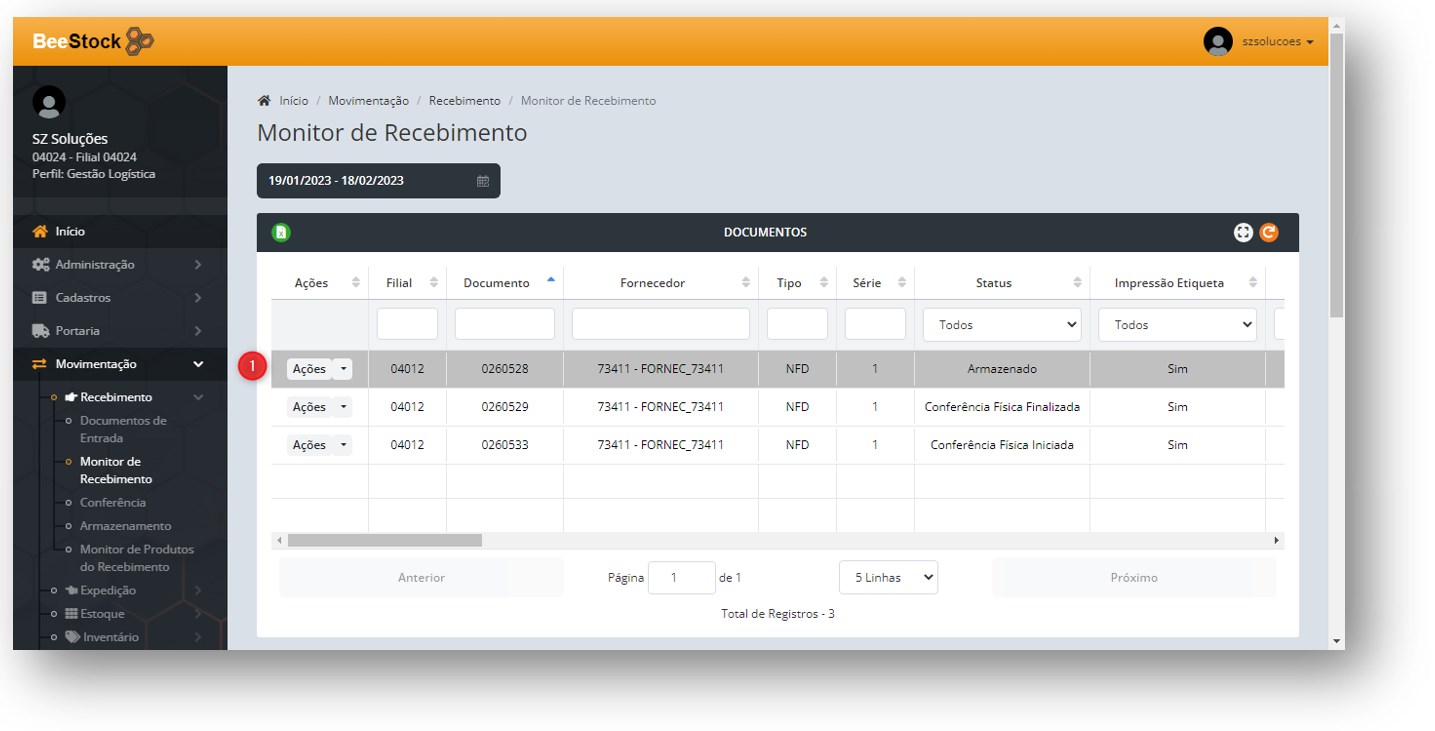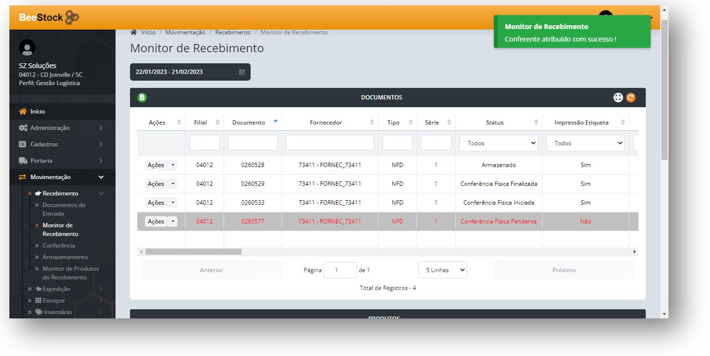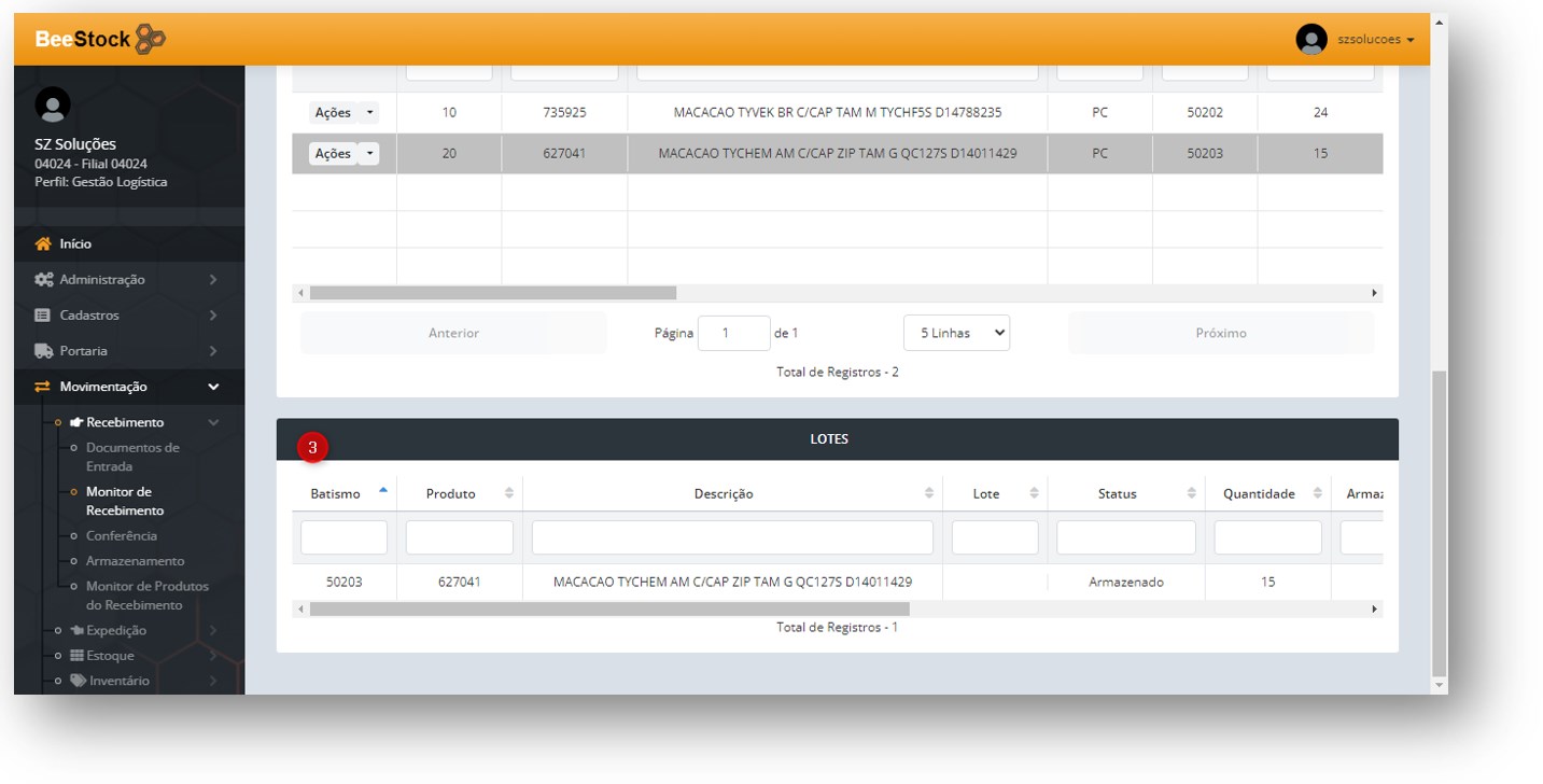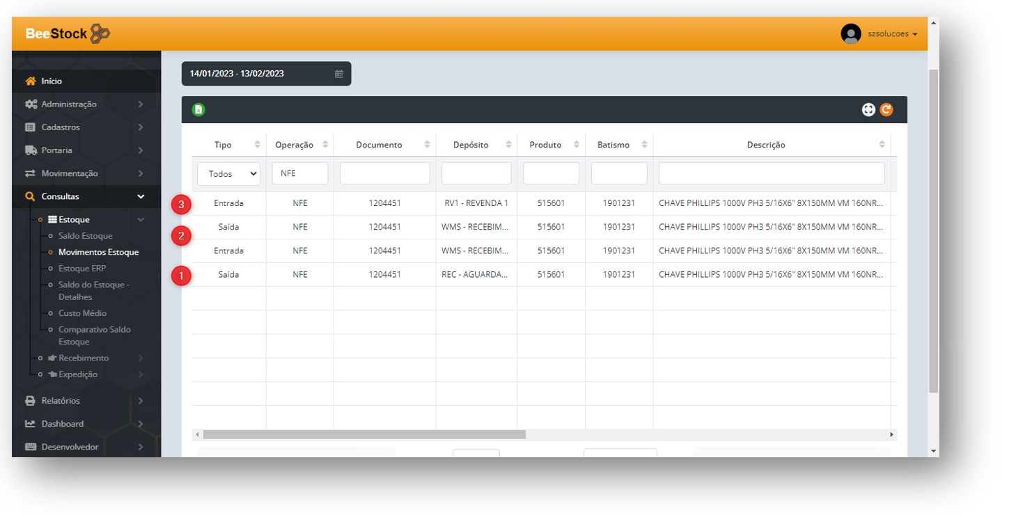 In this example, we see the receipt process, where an NFE moves from the REC warehouse to WMS and, after the receipt process, goes to the RV1 warehouse: