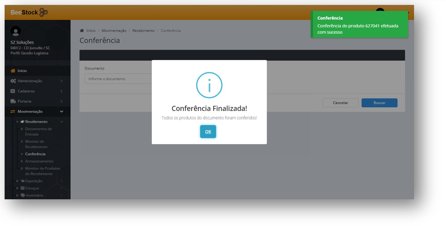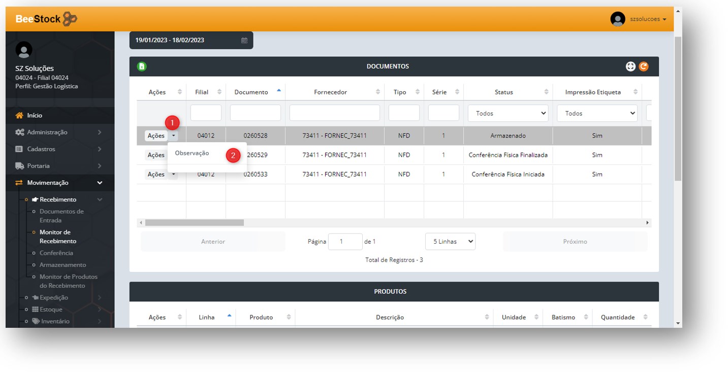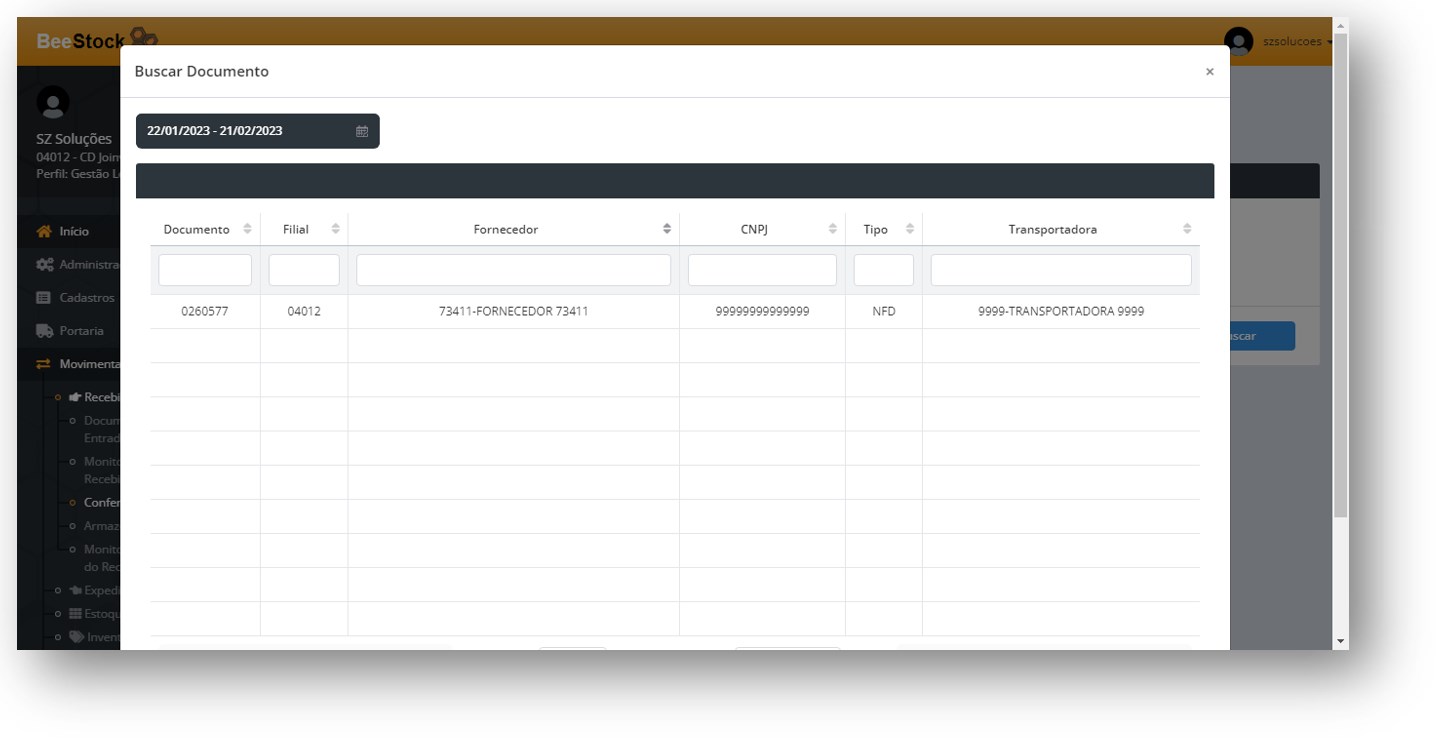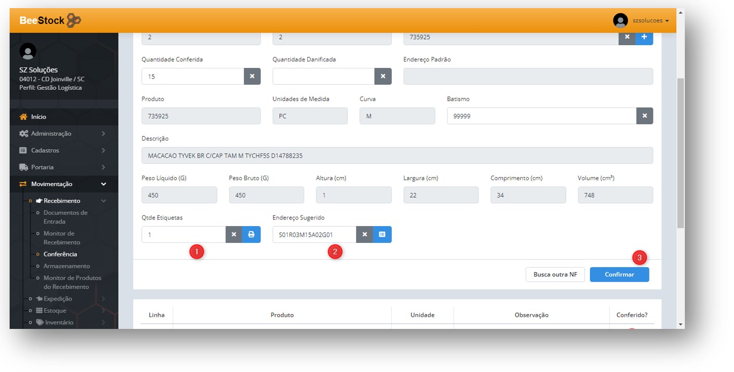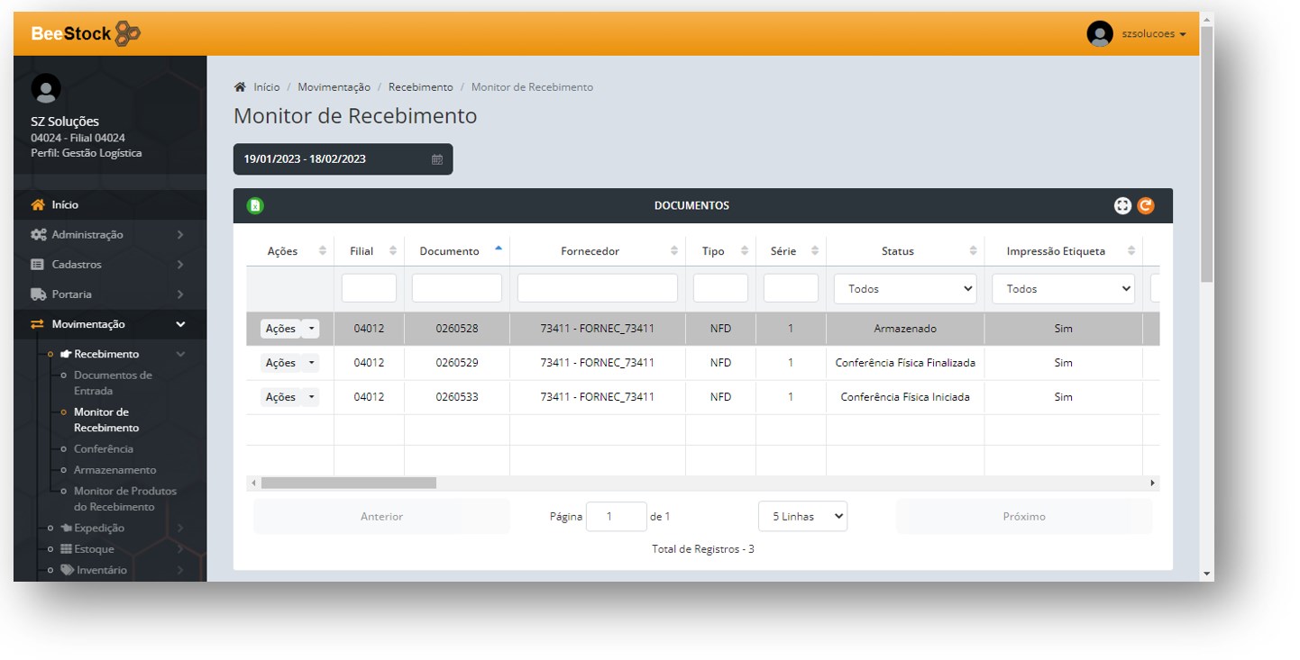 In this example, we see the receipt process, where an NFE moves from the REC warehouse to WMS and, after the receipt process, goes to the RV1 warehouse:
