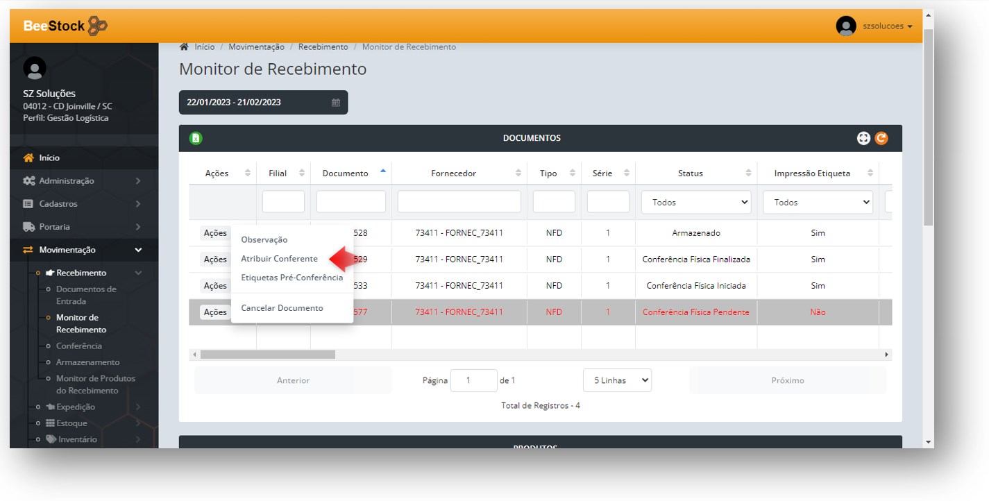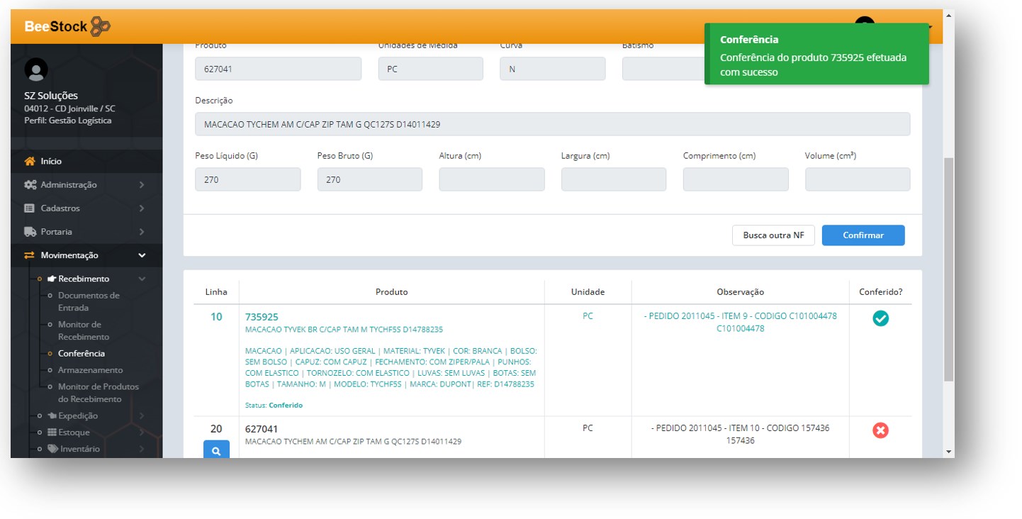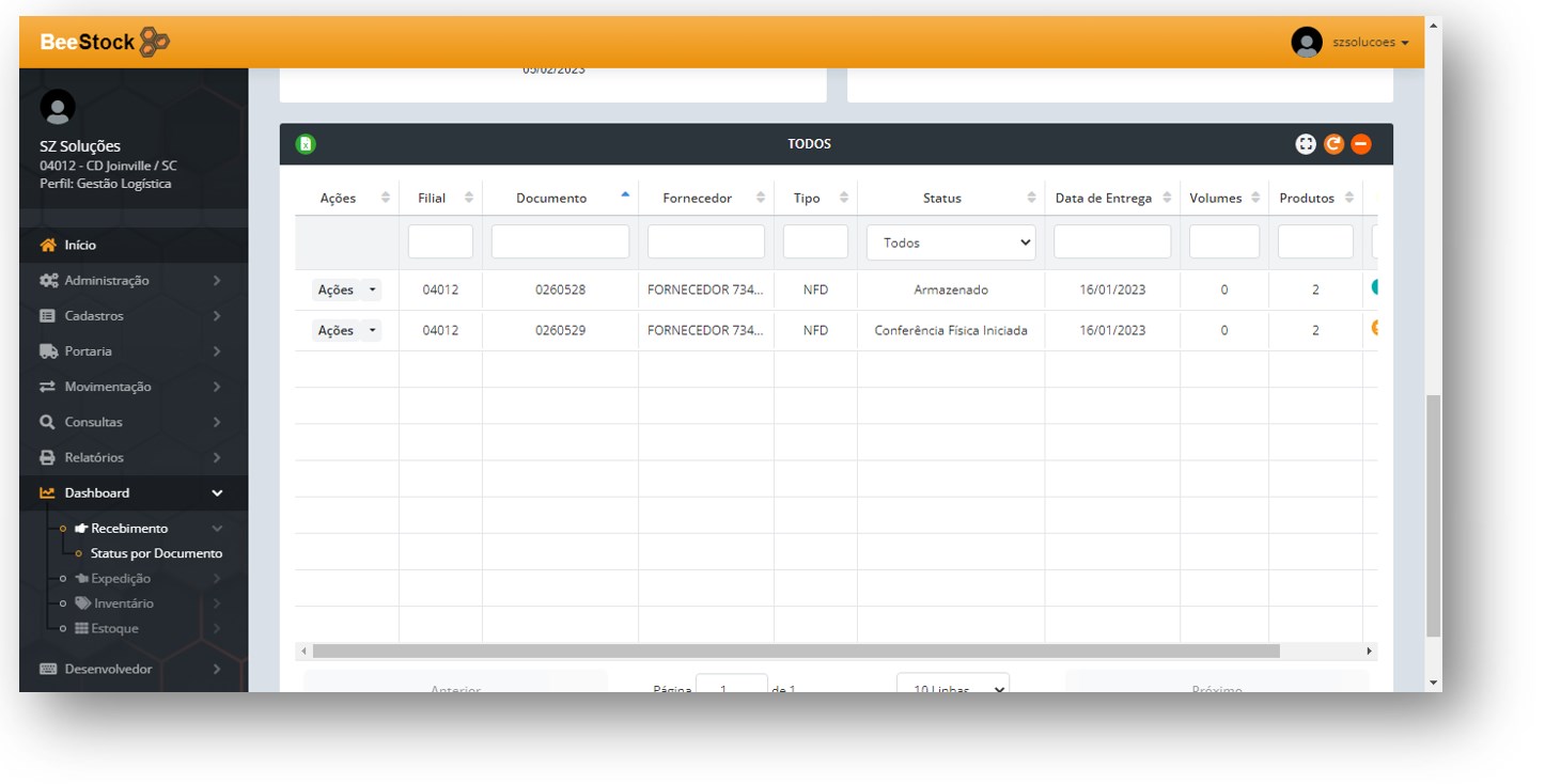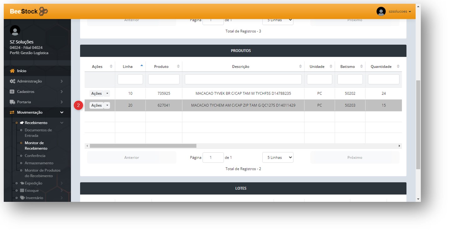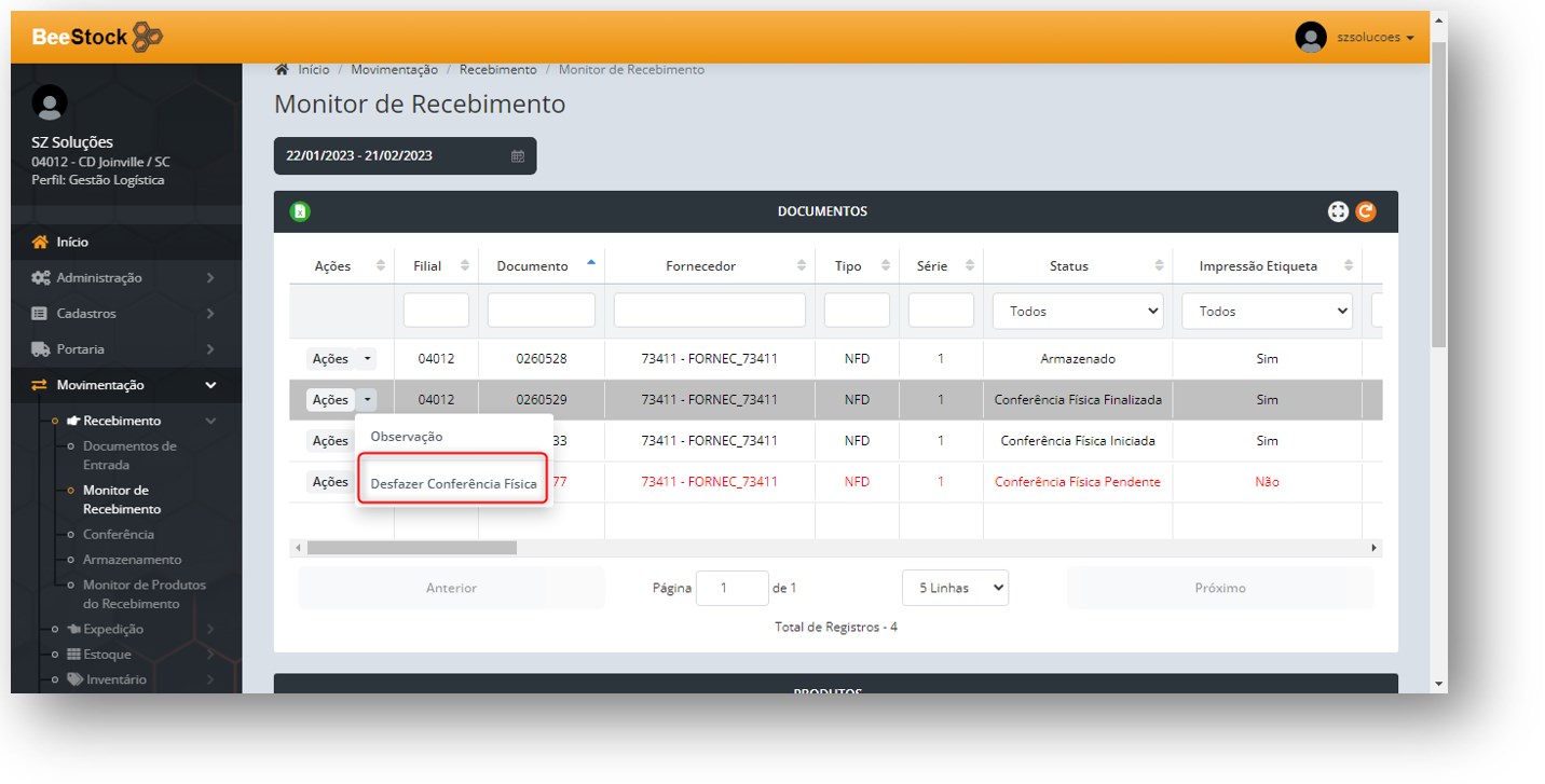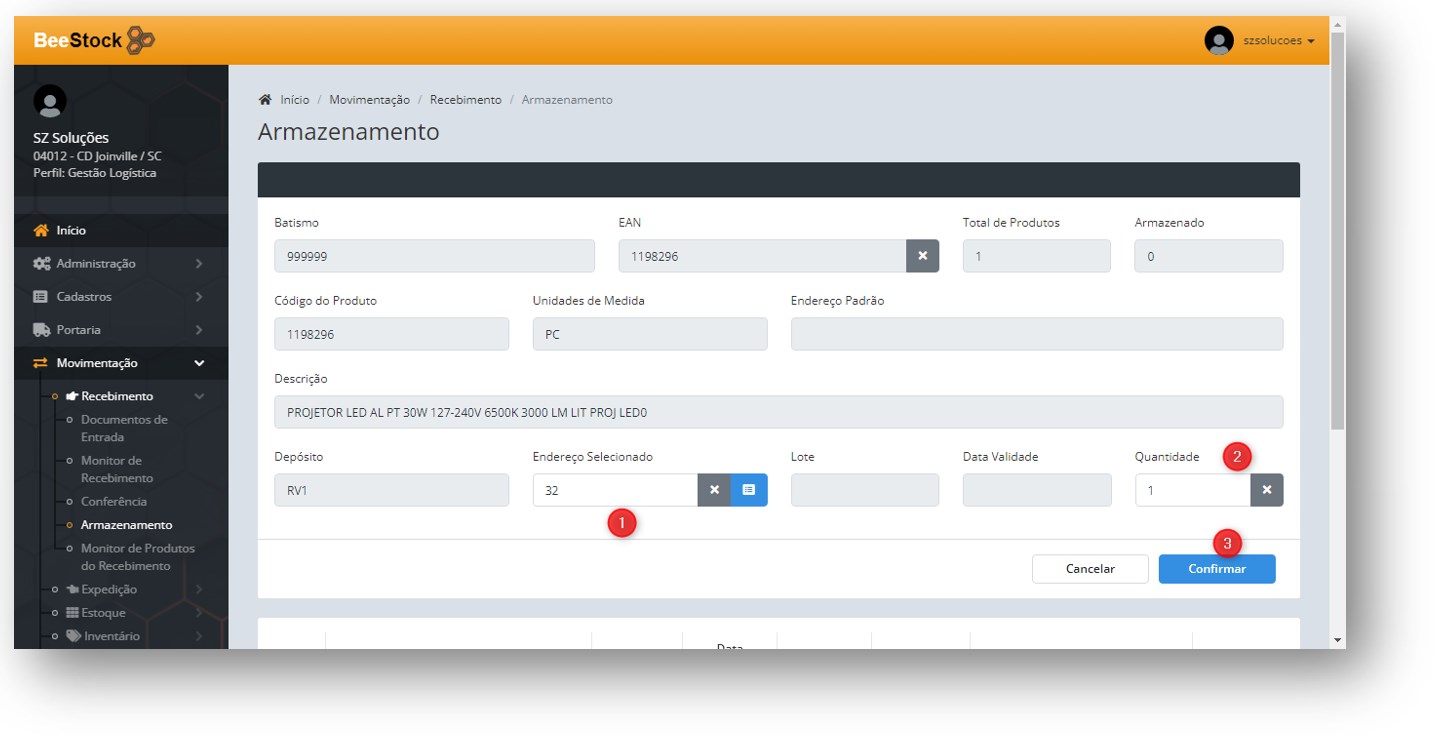 In this example, we see the receipt process, where an NFE moves from the REC warehouse to WMS and, after the receipt process, goes to the RV1 warehouse: