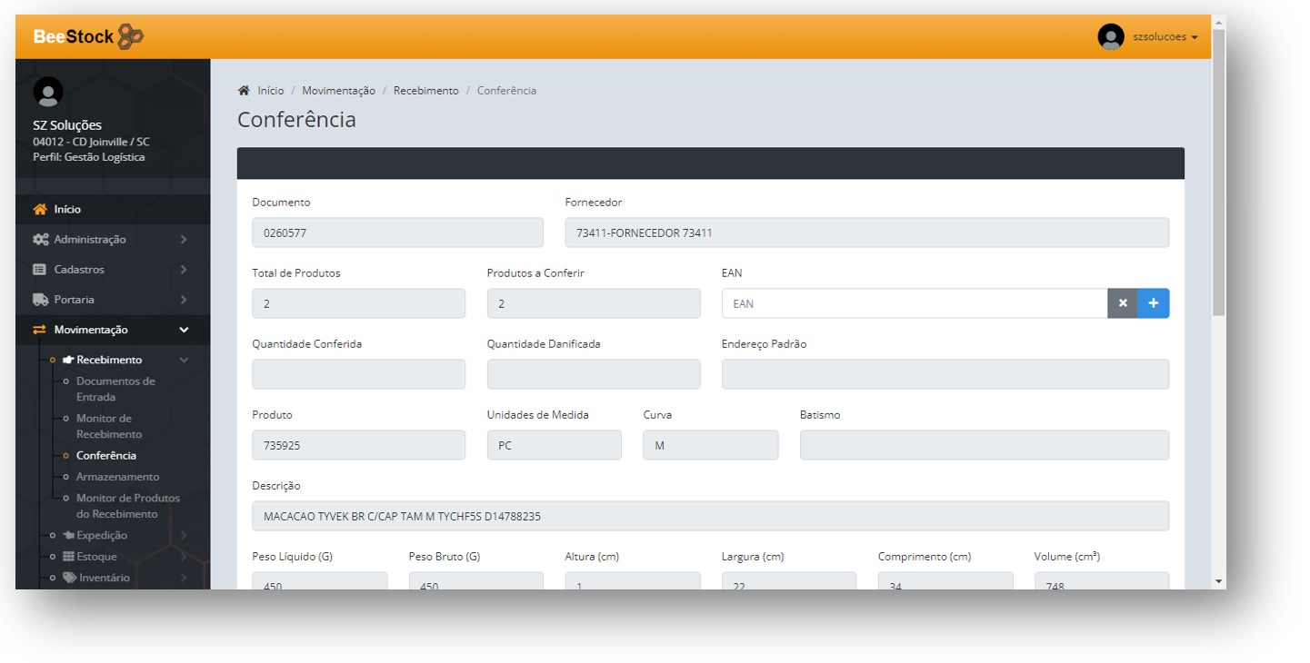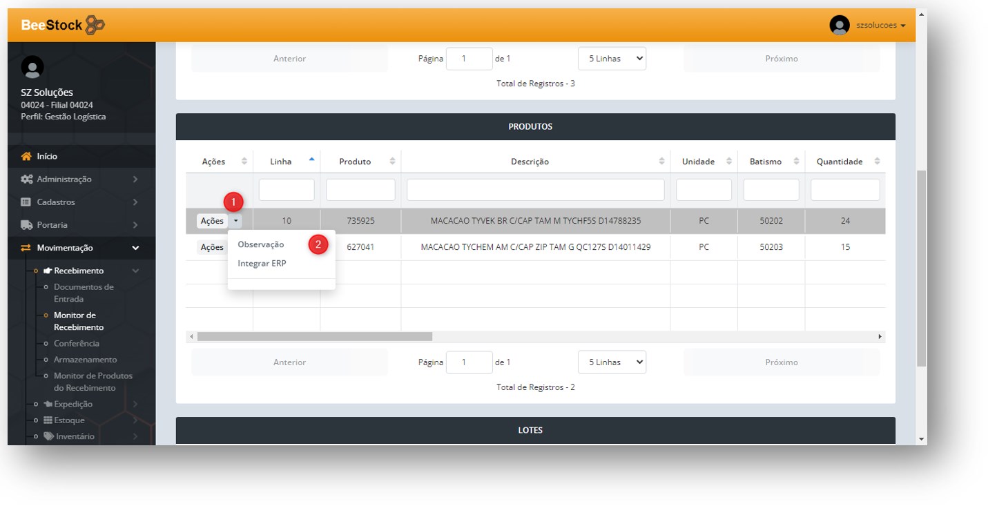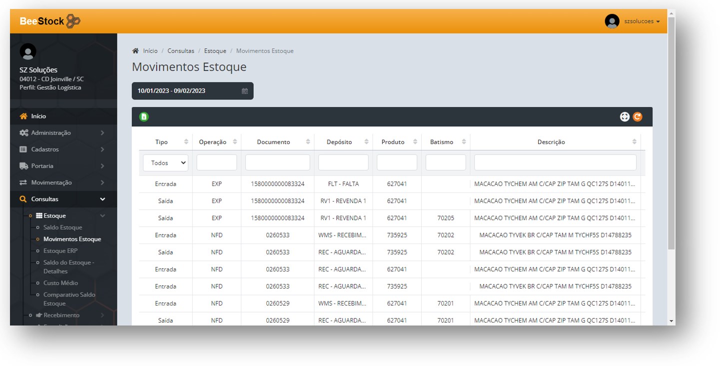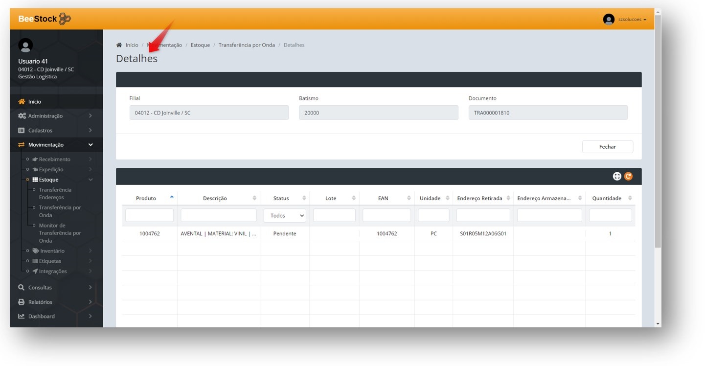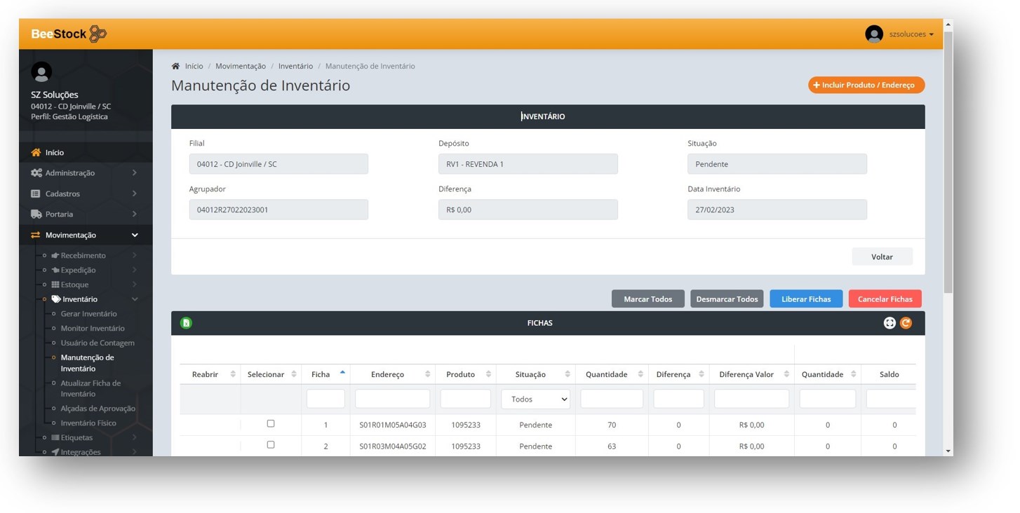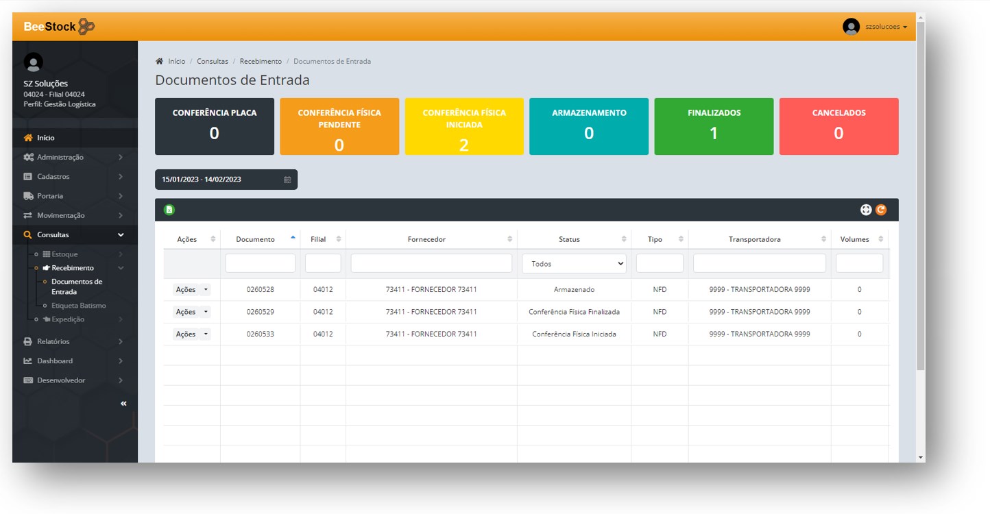 In this example, we see the receipt process, where an NFE moves from the REC warehouse to WMS and, after the receipt process, goes to the RV1 warehouse: