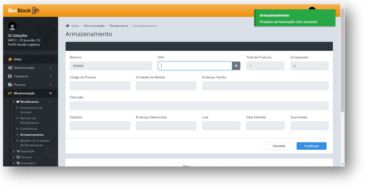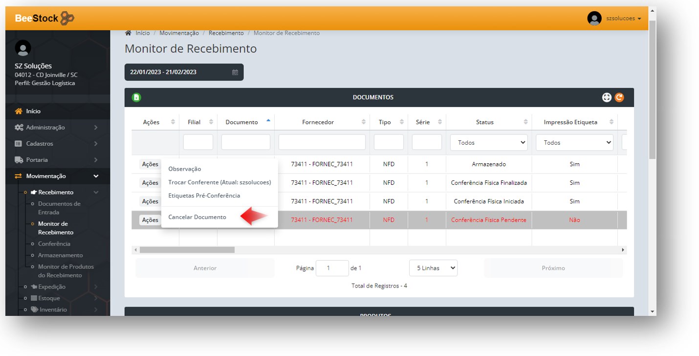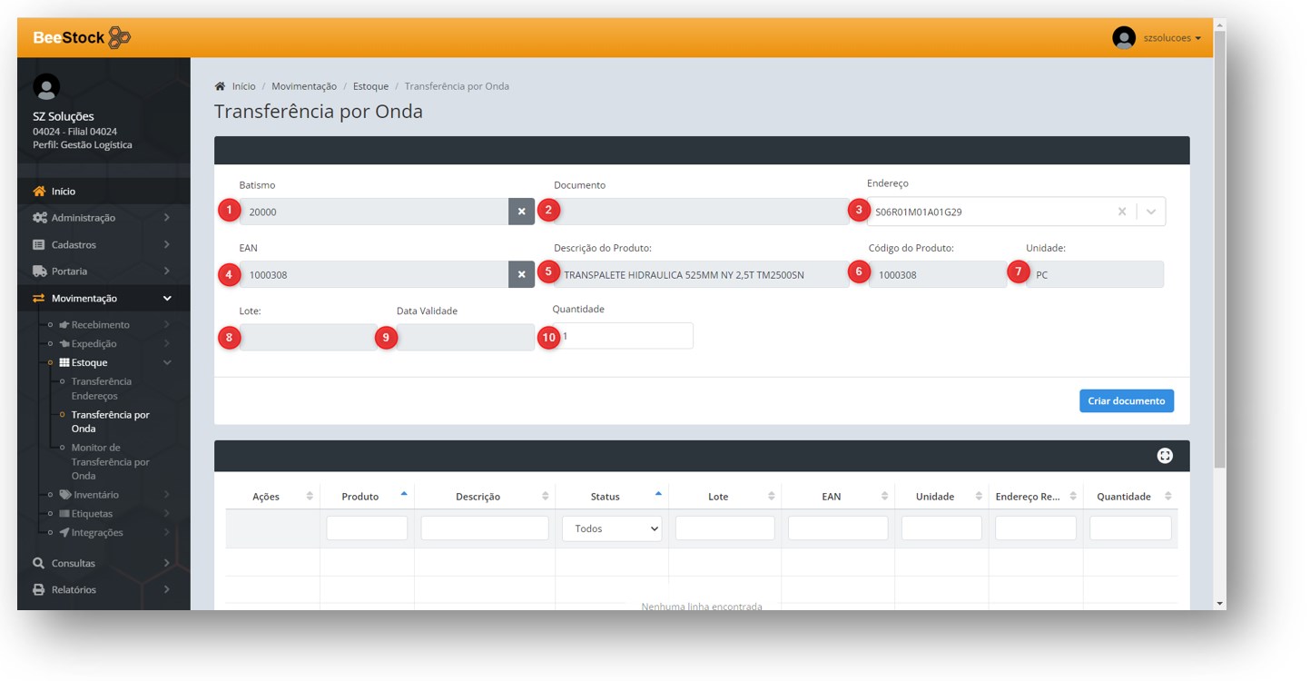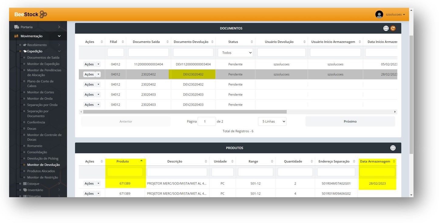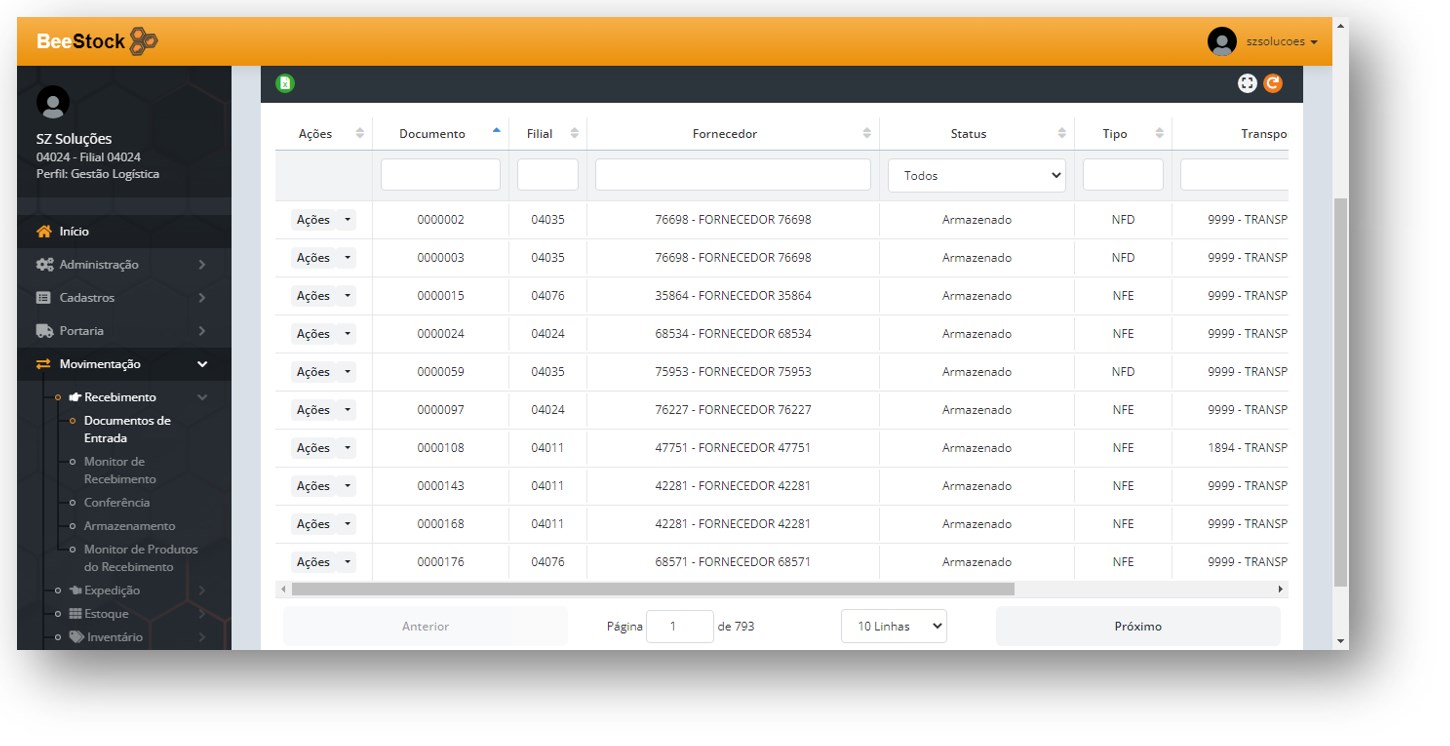 In this example, we see the receipt process, where an NFE moves from the REC warehouse to WMS and, after the receipt process, goes to the RV1 warehouse: