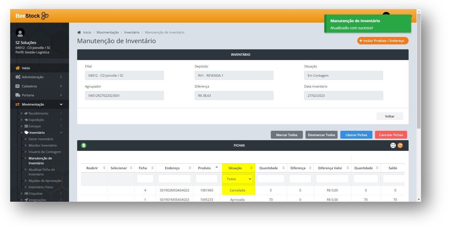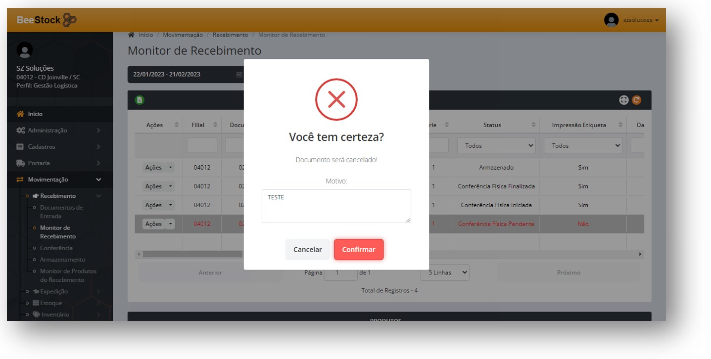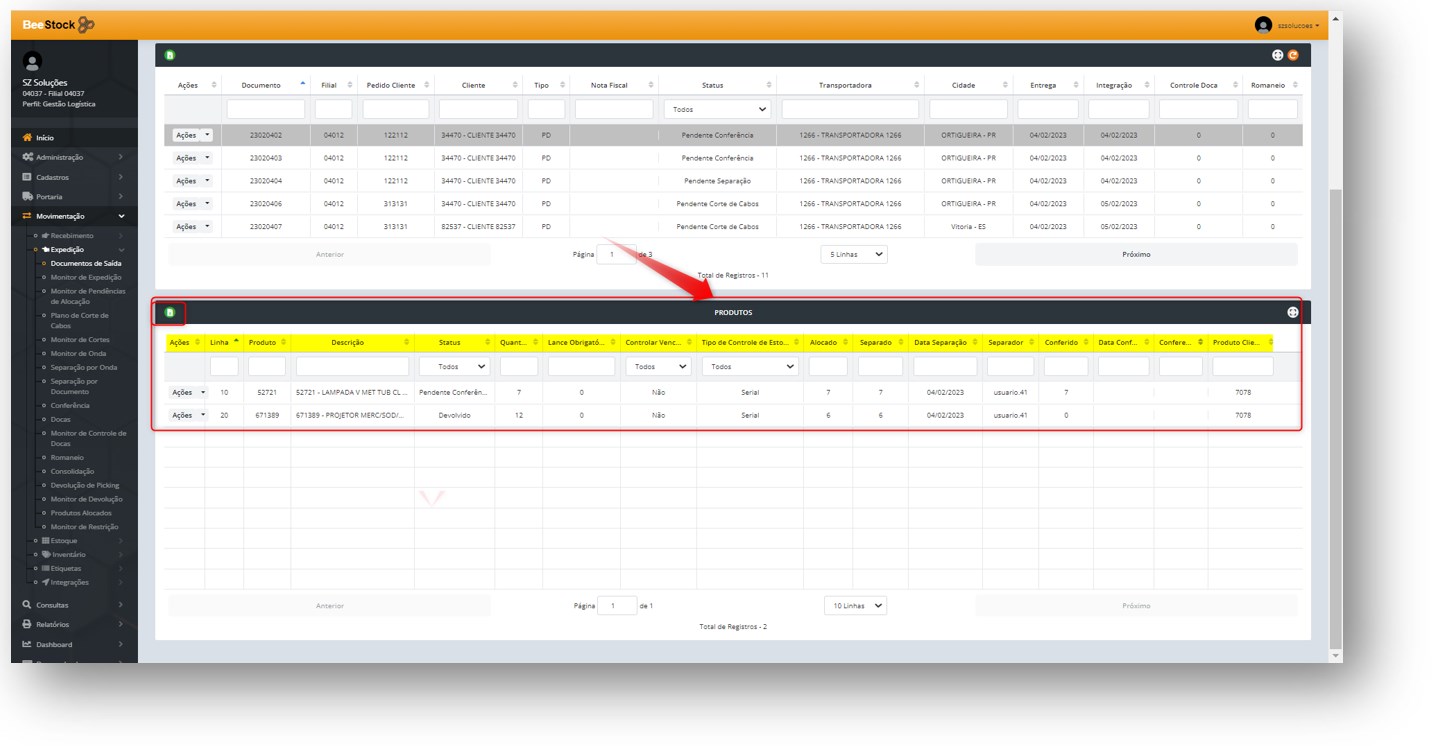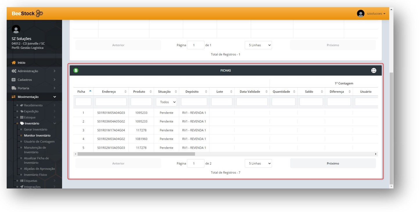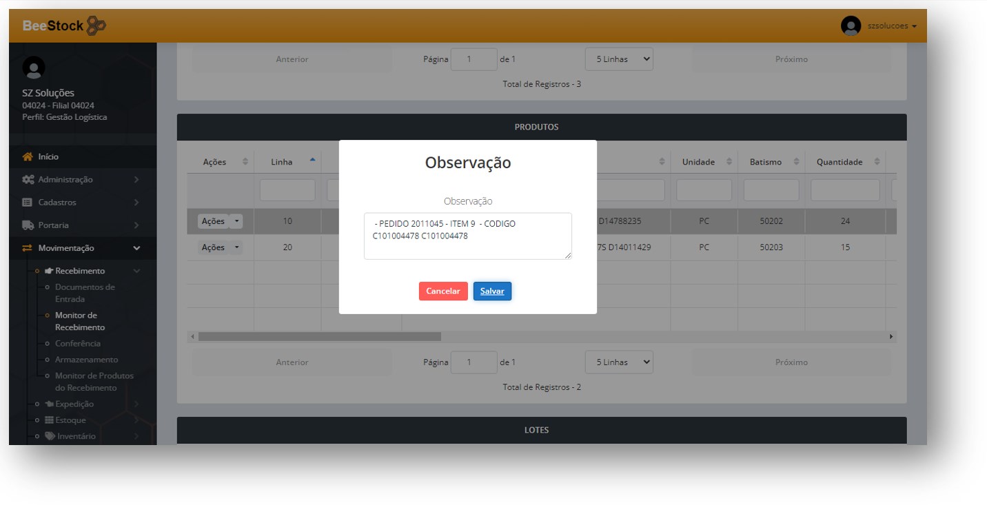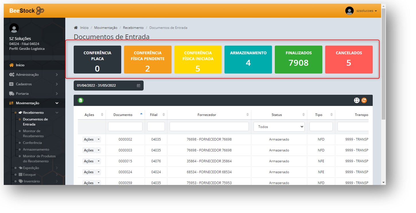 In this example, we see the receipt process, where an NFE moves from the REC warehouse to WMS and, after the receipt process, goes to the RV1 warehouse: