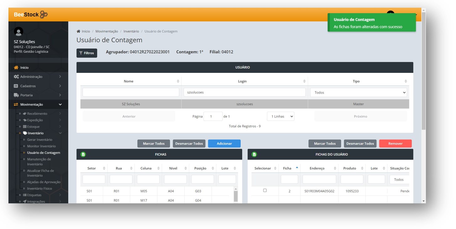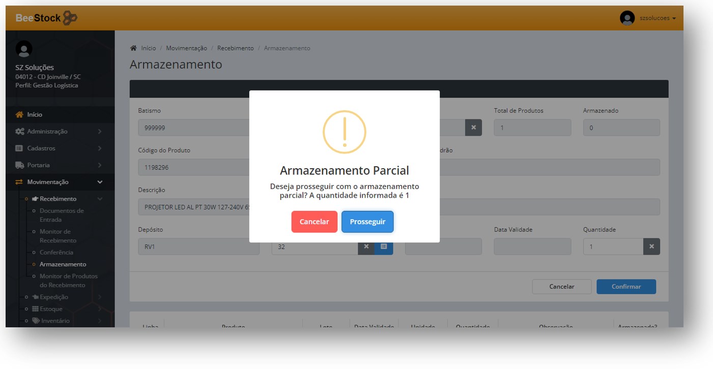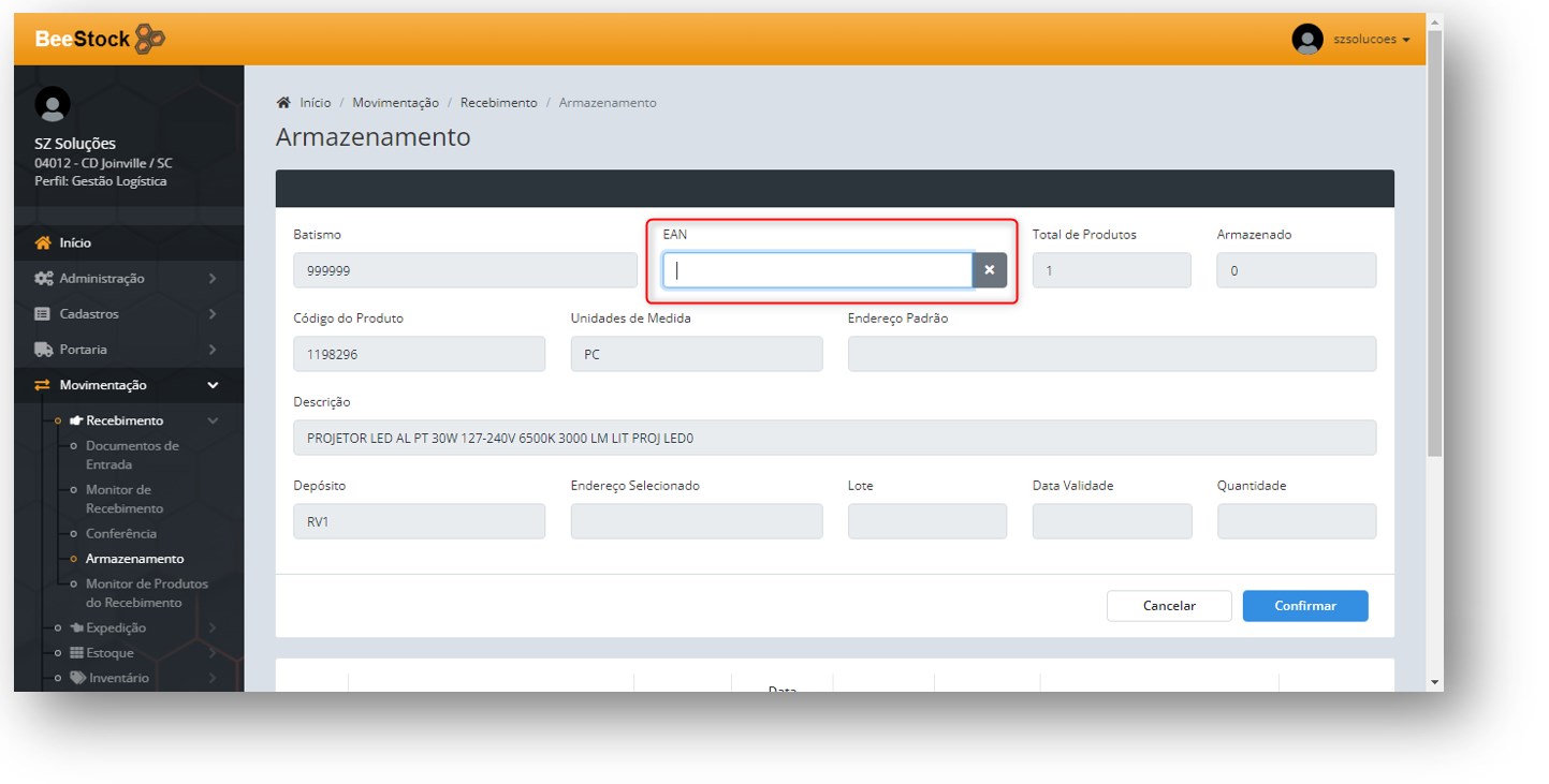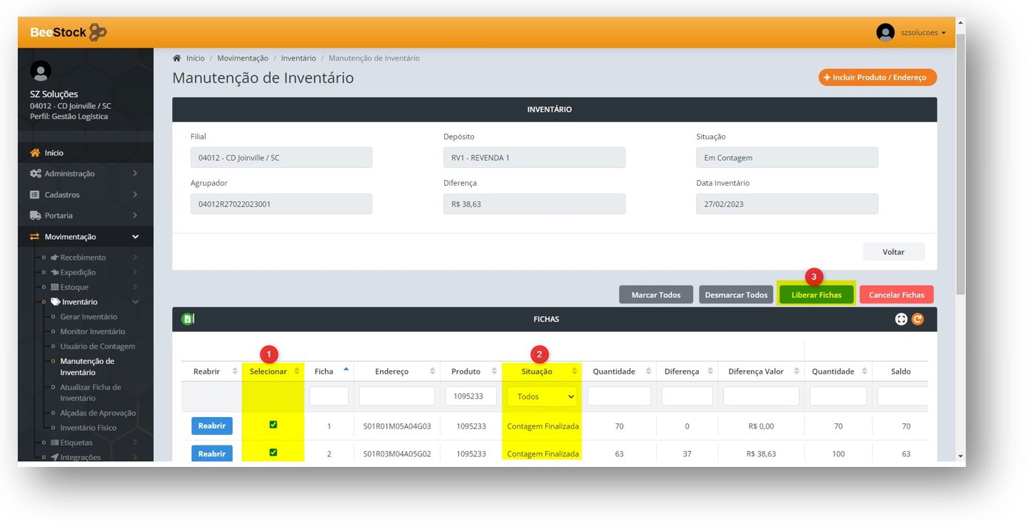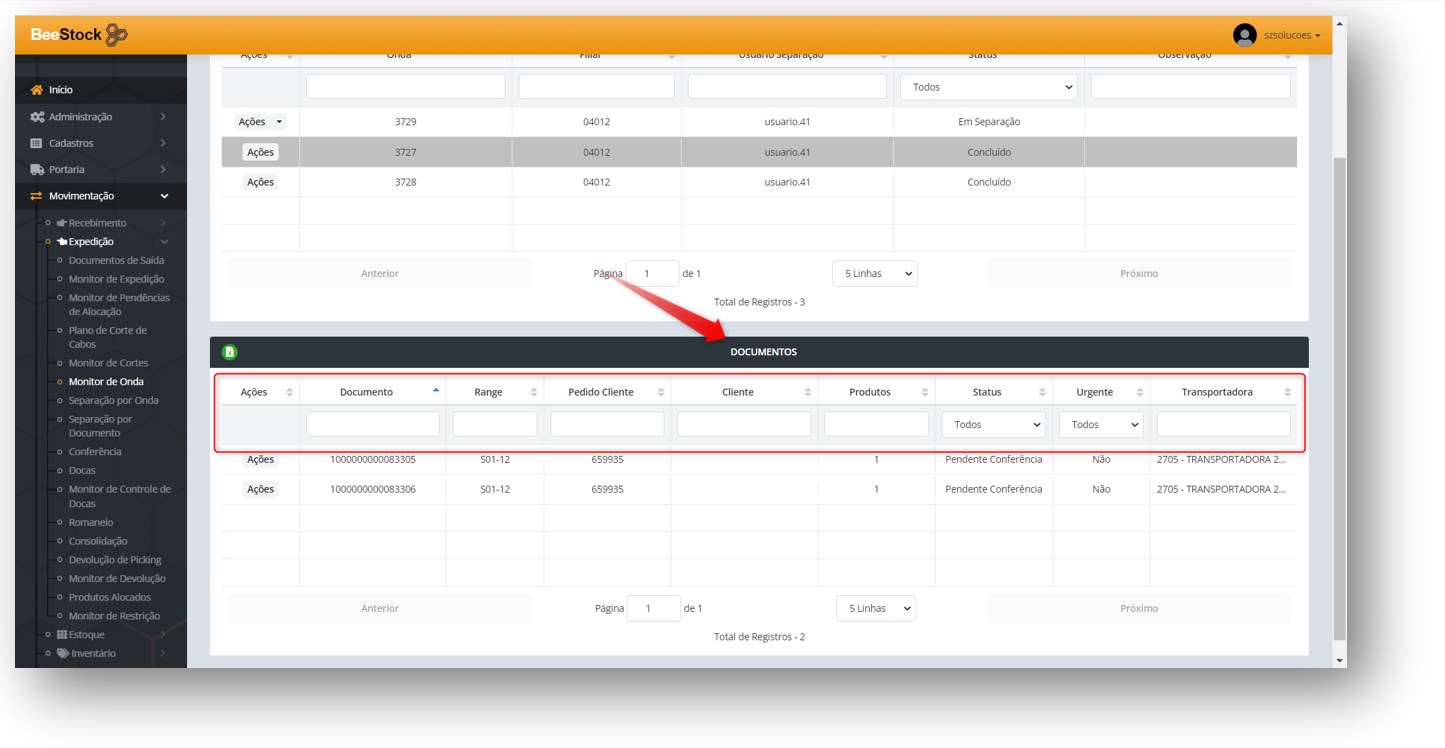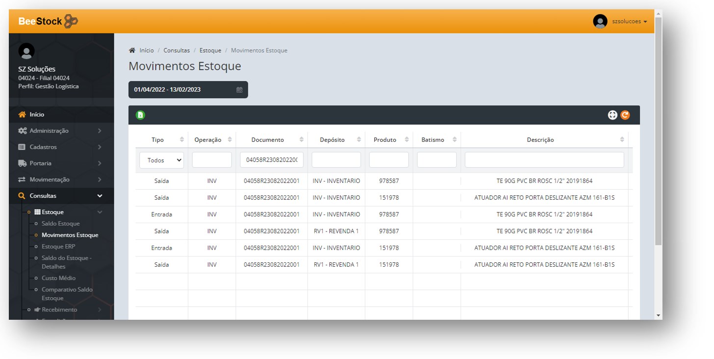 In this example, we see the receipt process, where an NFE moves from the REC warehouse to WMS and, after the receipt process, goes to the RV1 warehouse:
