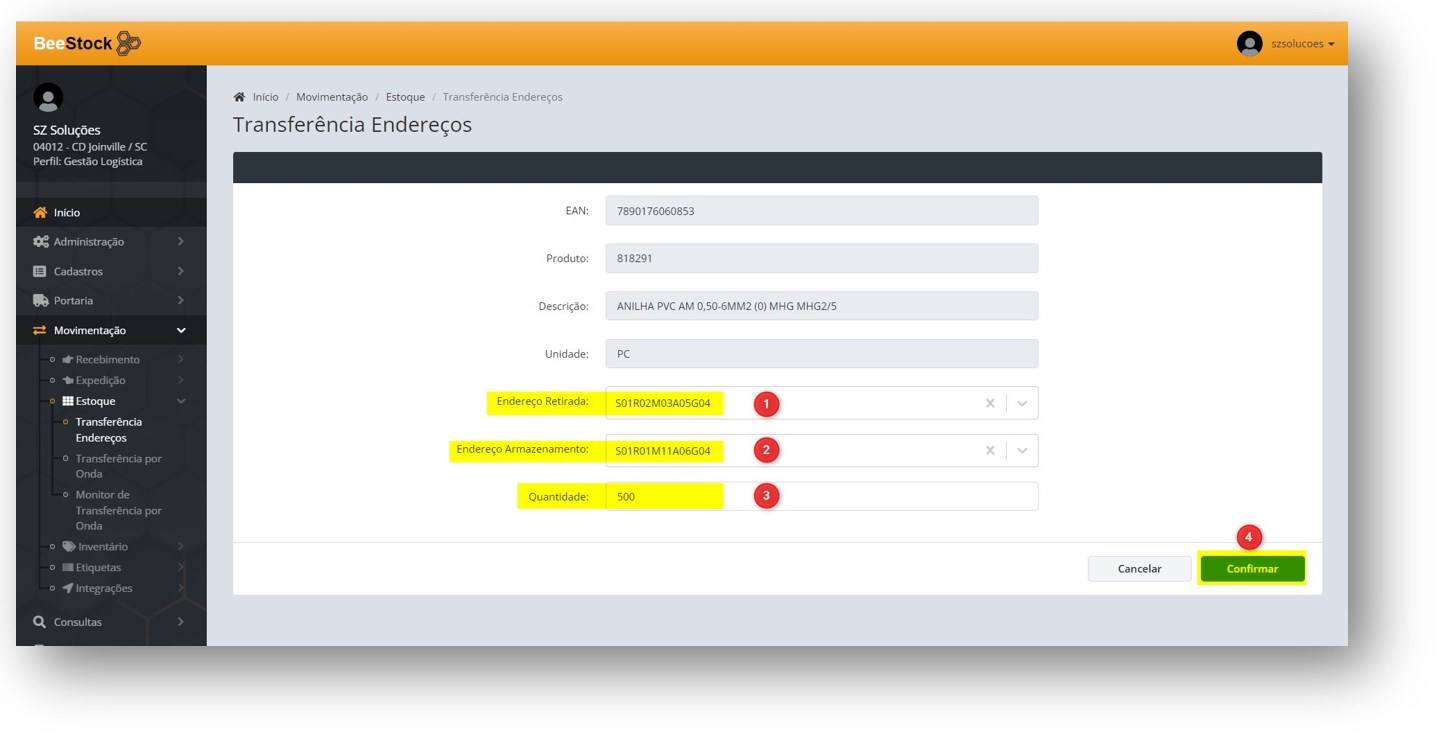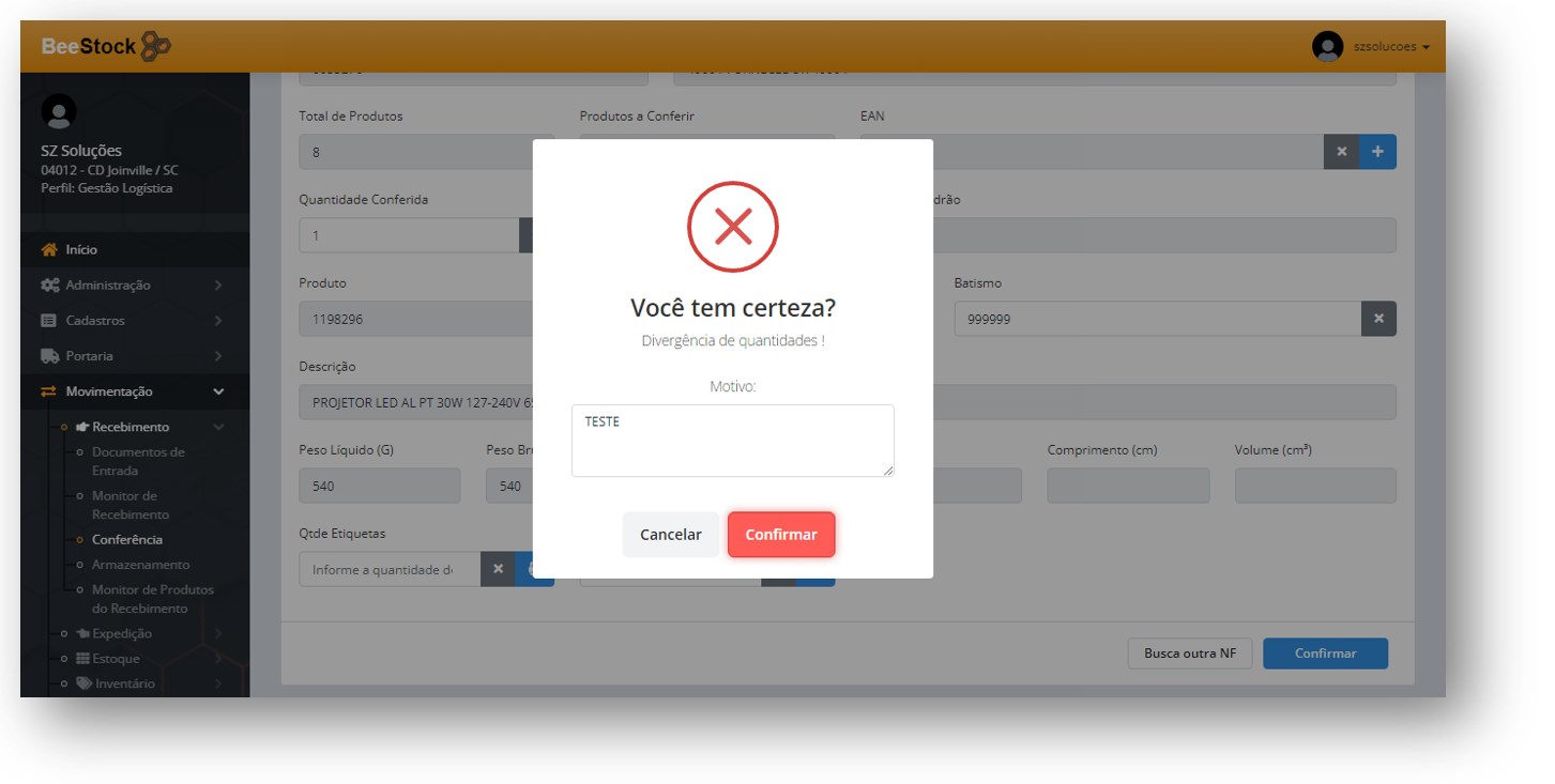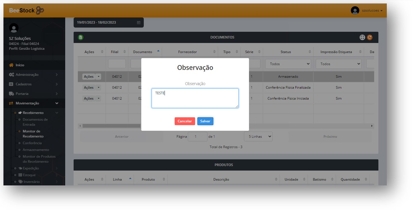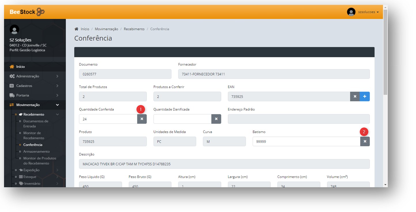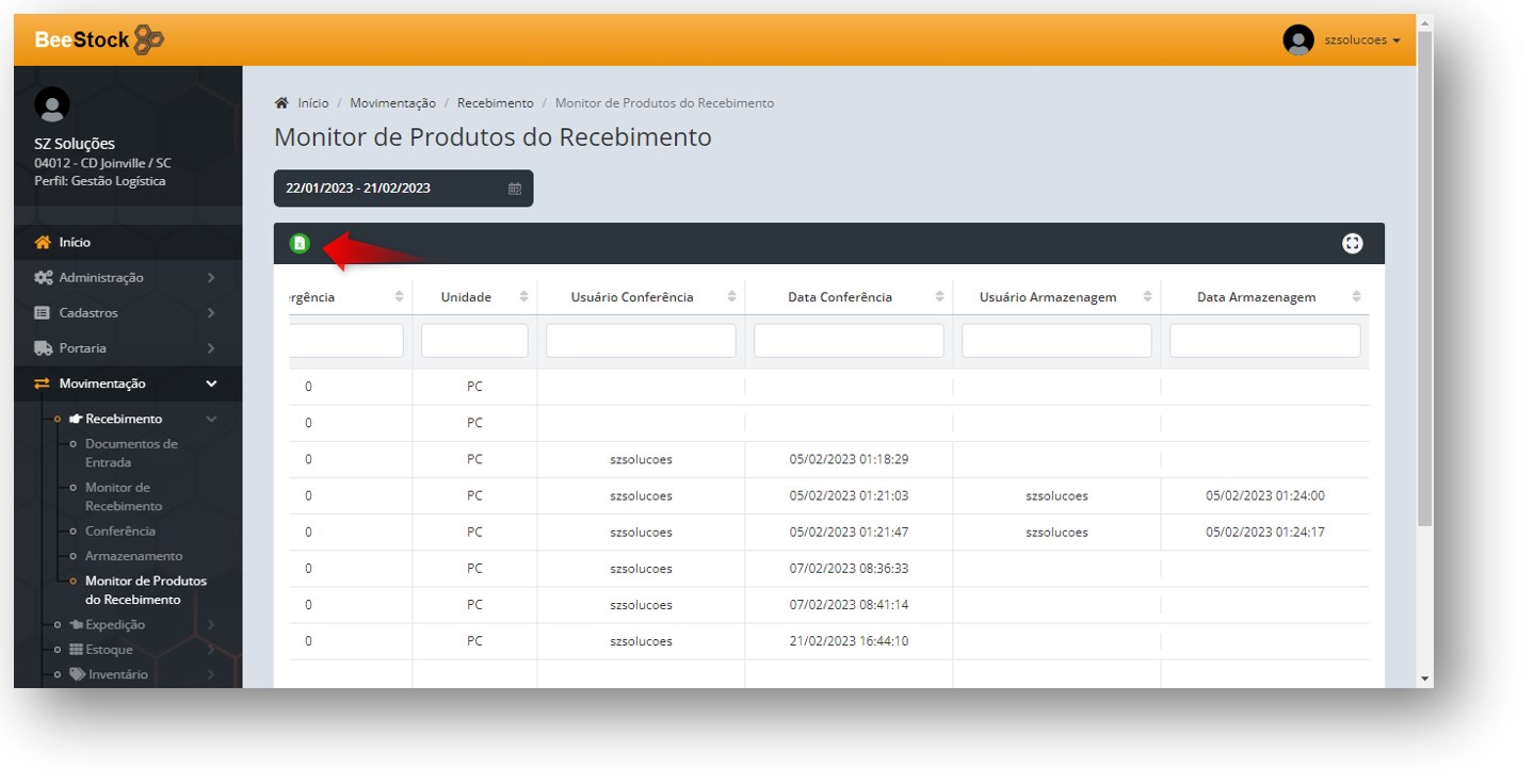 In this example, we see the receipt process, where an NFE moves from the REC warehouse to WMS and, after the receipt process, goes to the RV1 warehouse:
