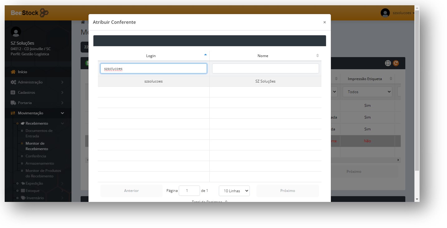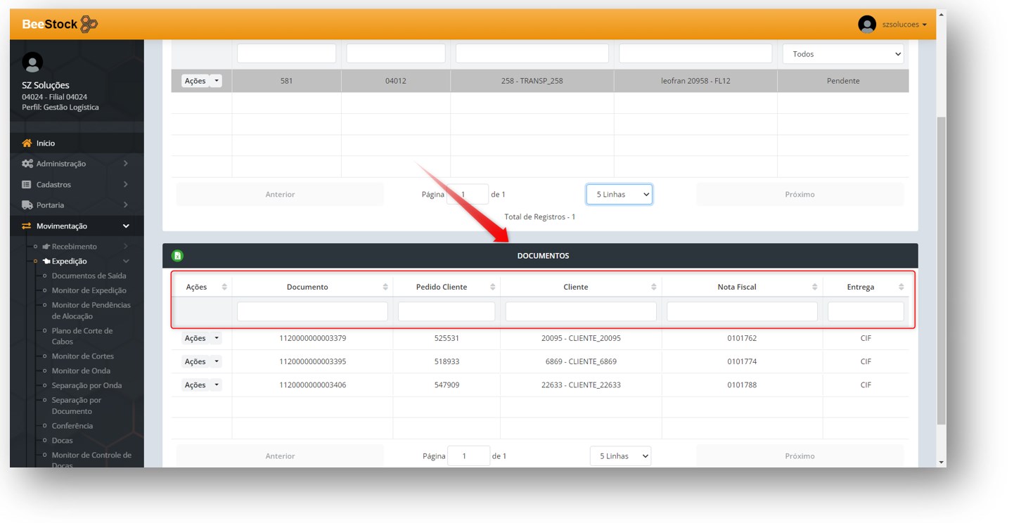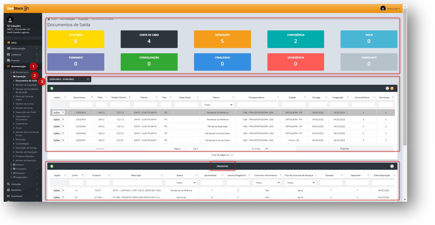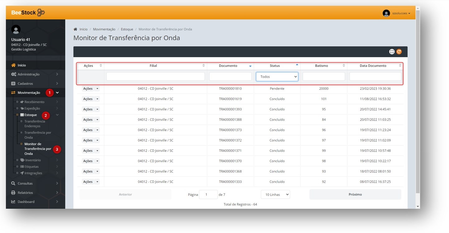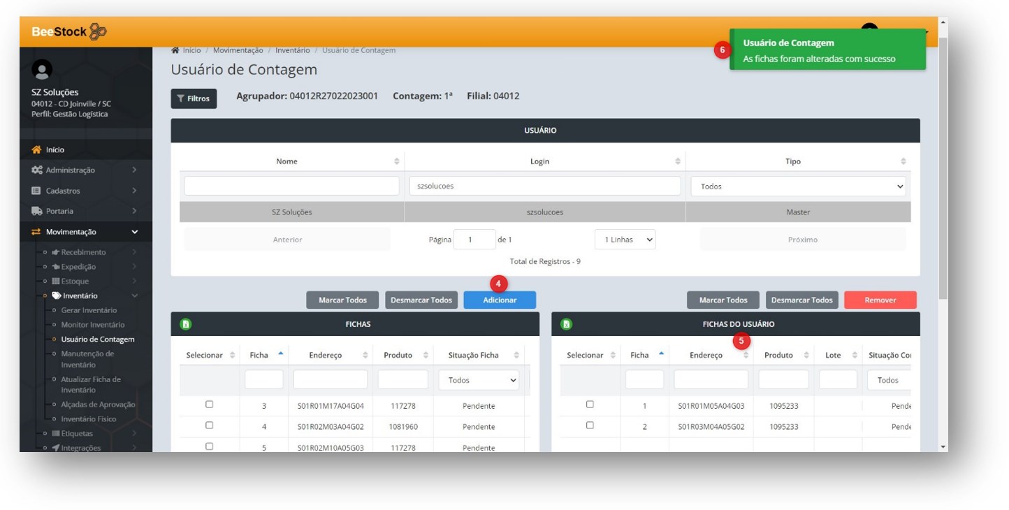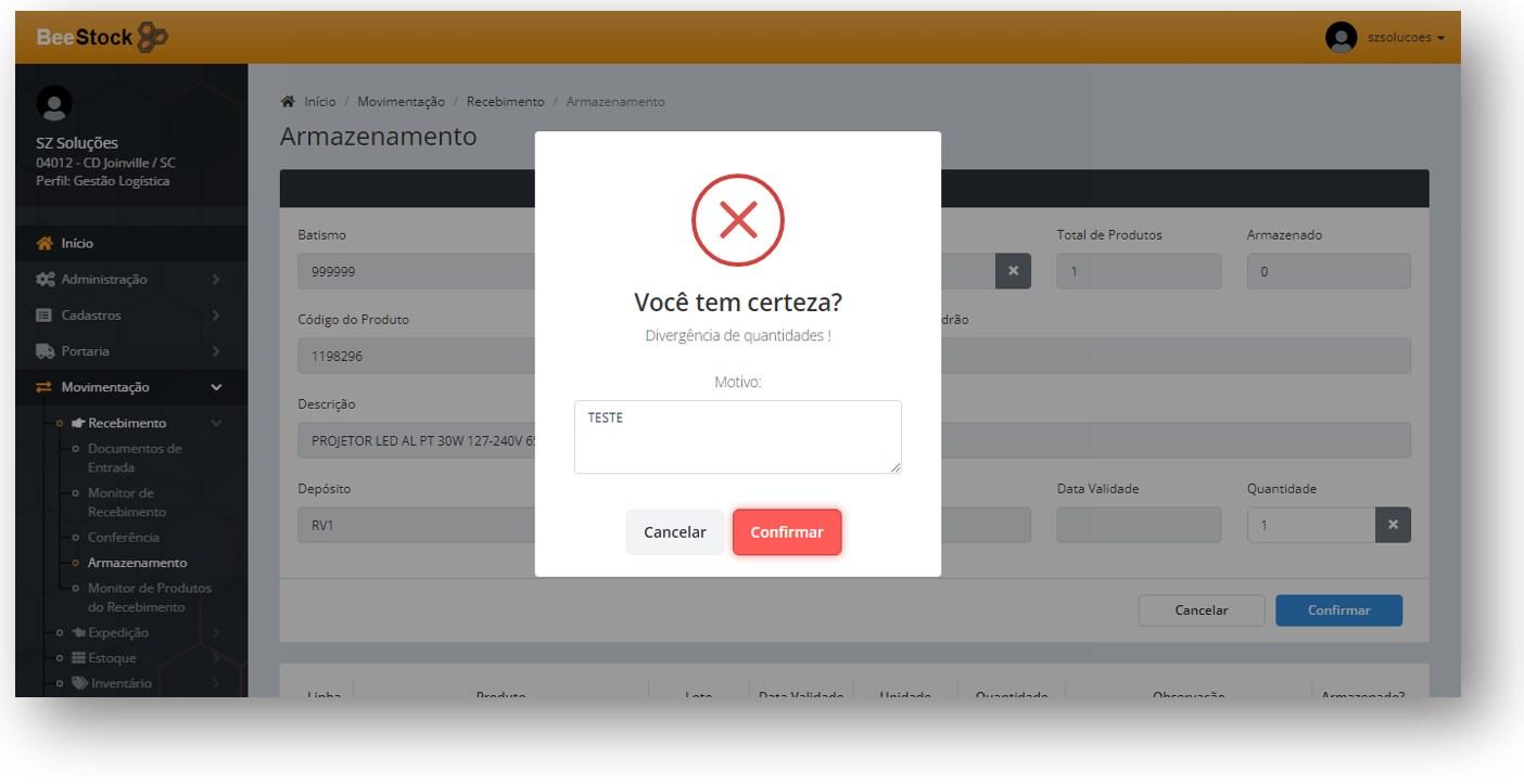 In this example, we see the receipt process, where an NFE moves from the REC warehouse to WMS and, after the receipt process, goes to the RV1 warehouse: