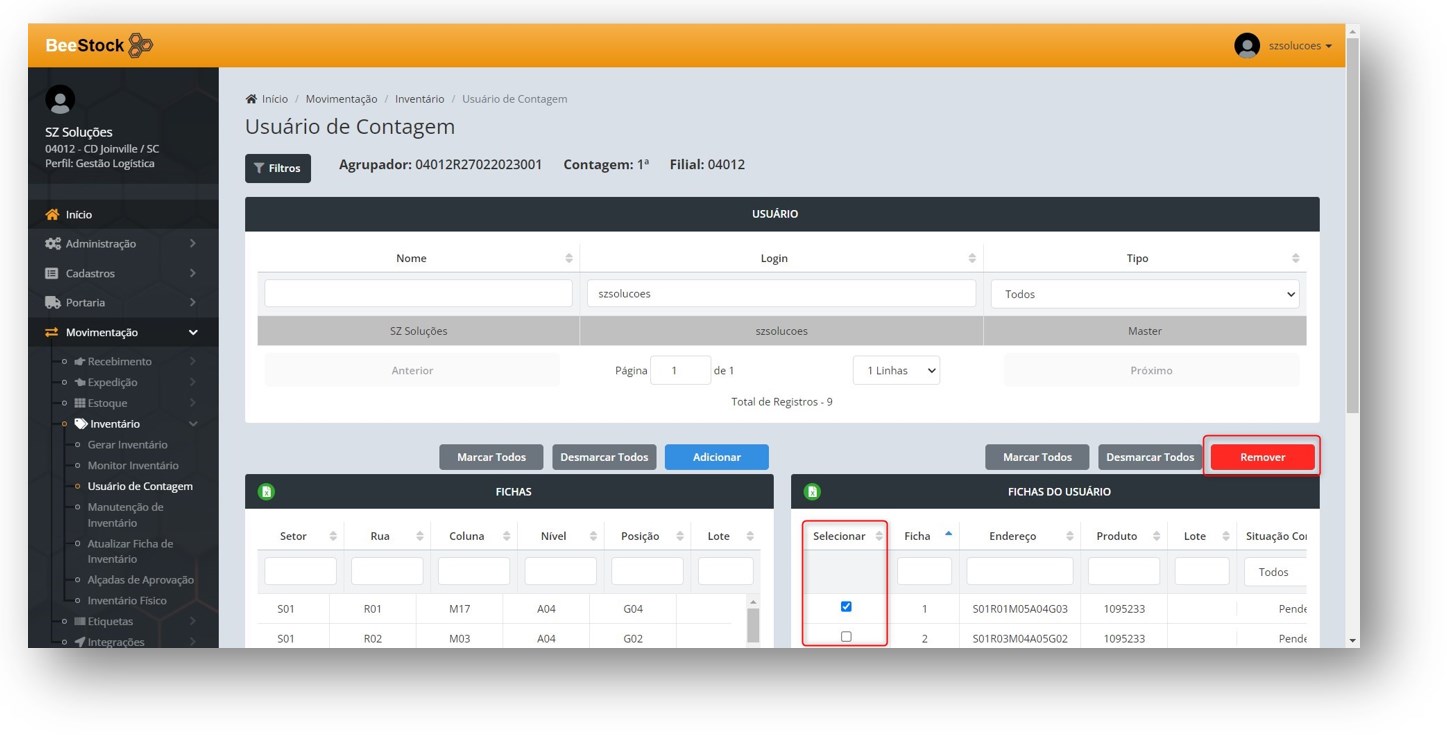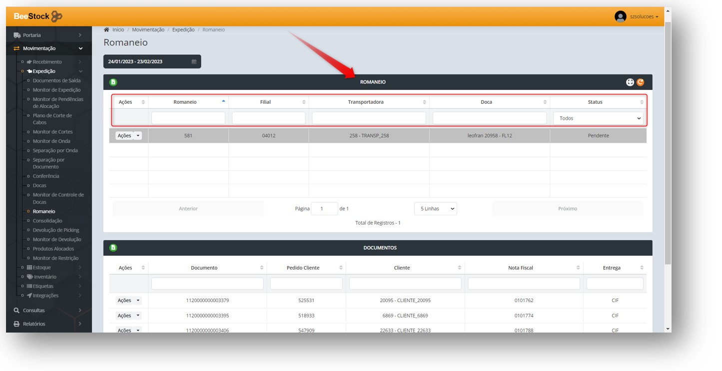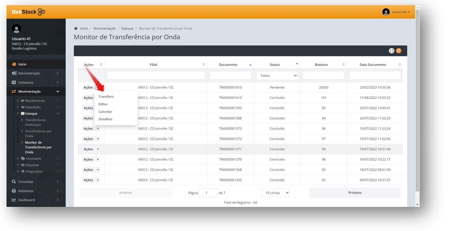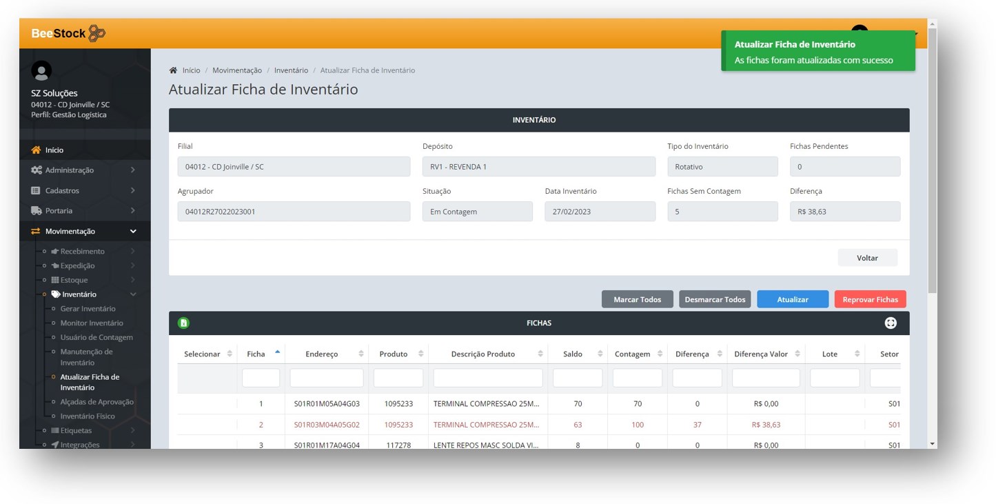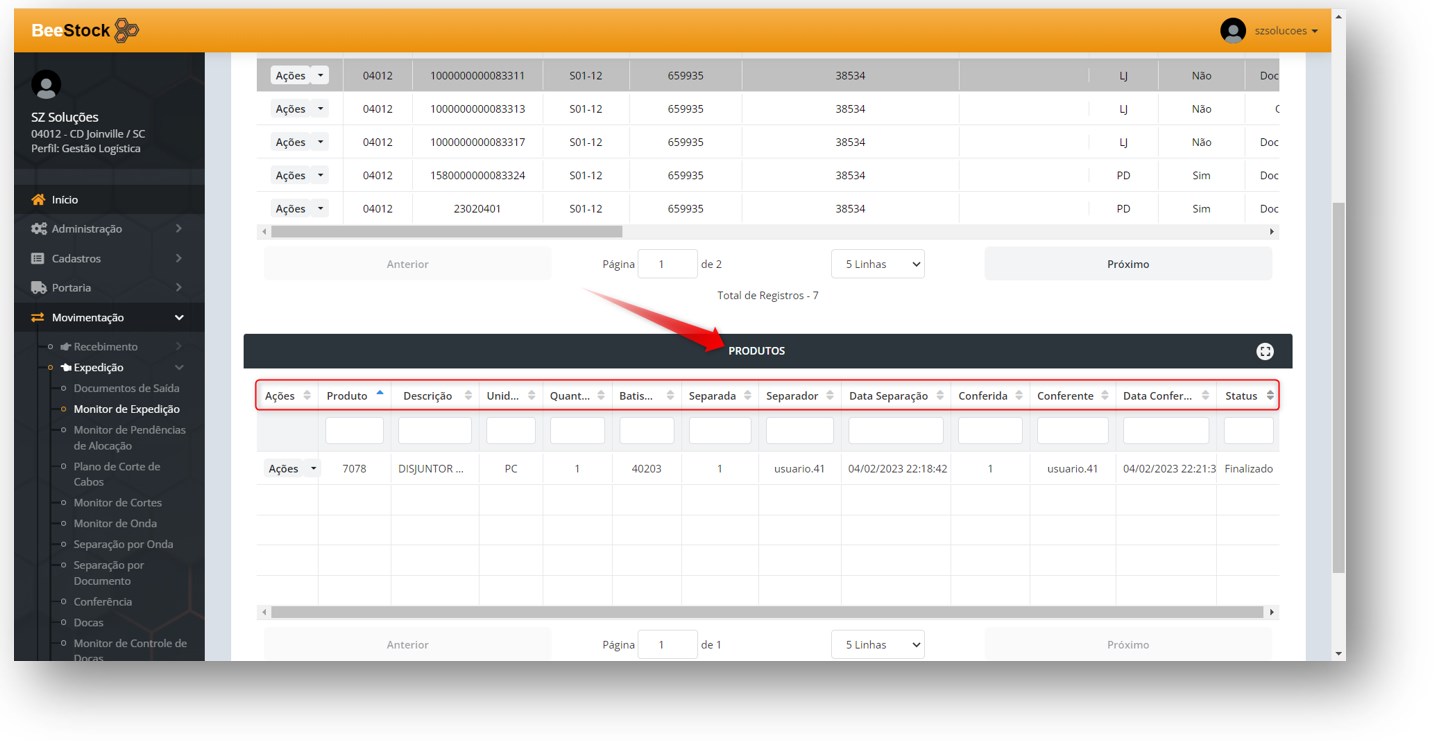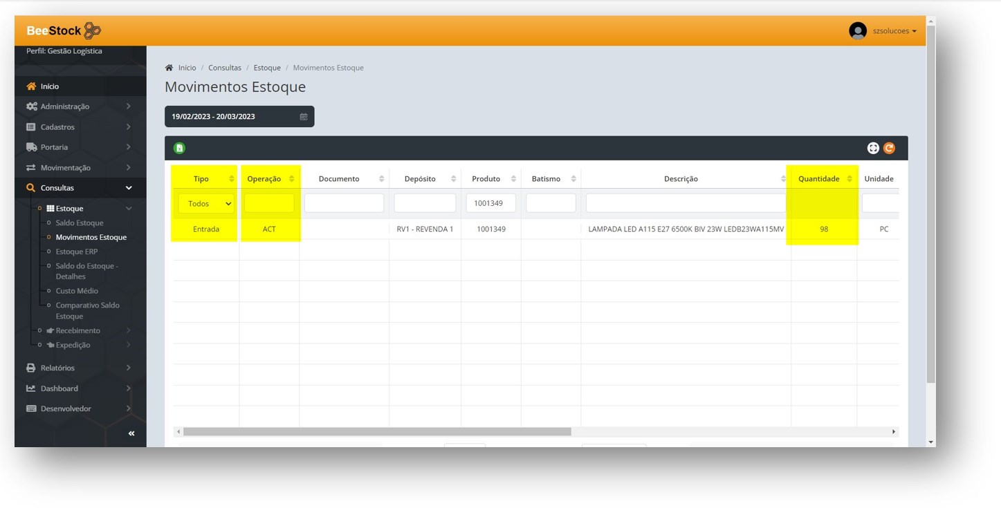 In this example, we see the receipt process, where an NFE moves from the REC warehouse to WMS and, after the receipt process, goes to the RV1 warehouse: