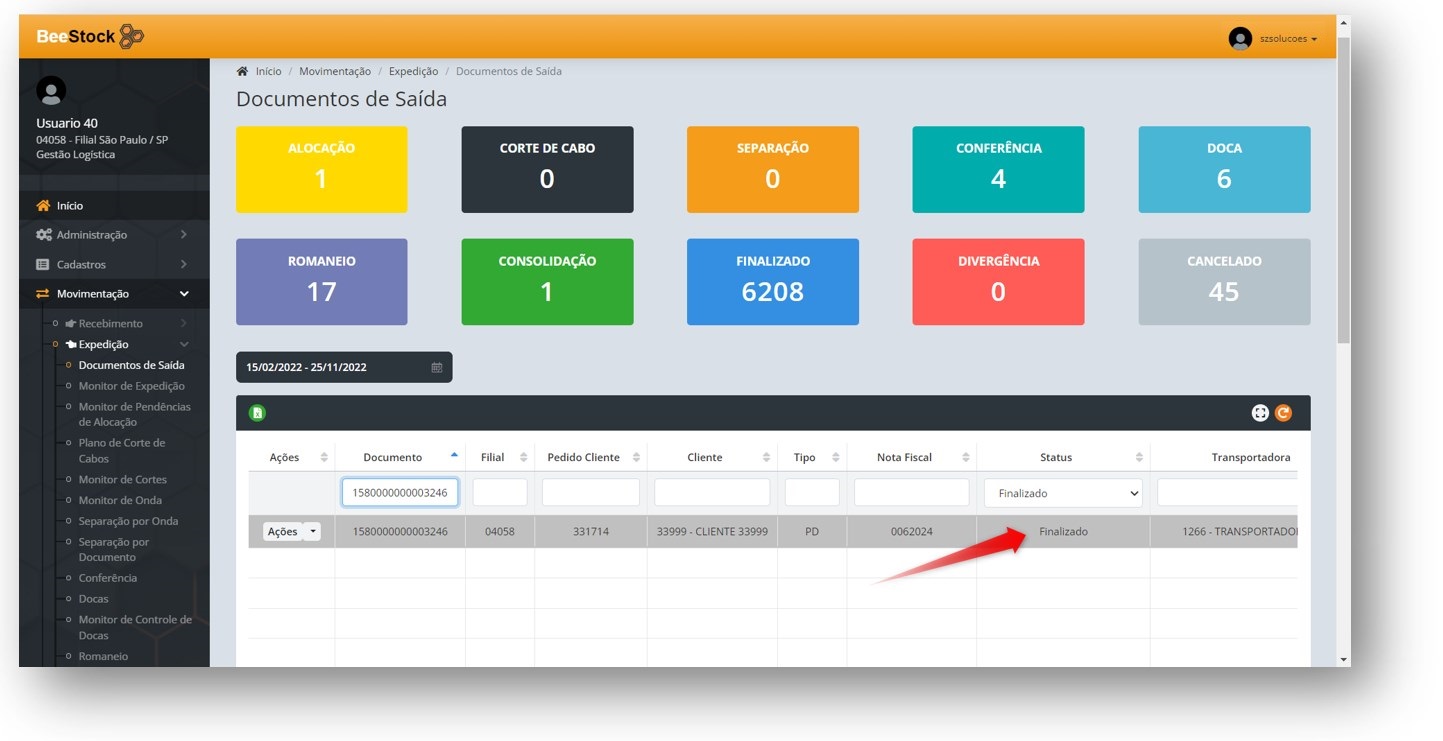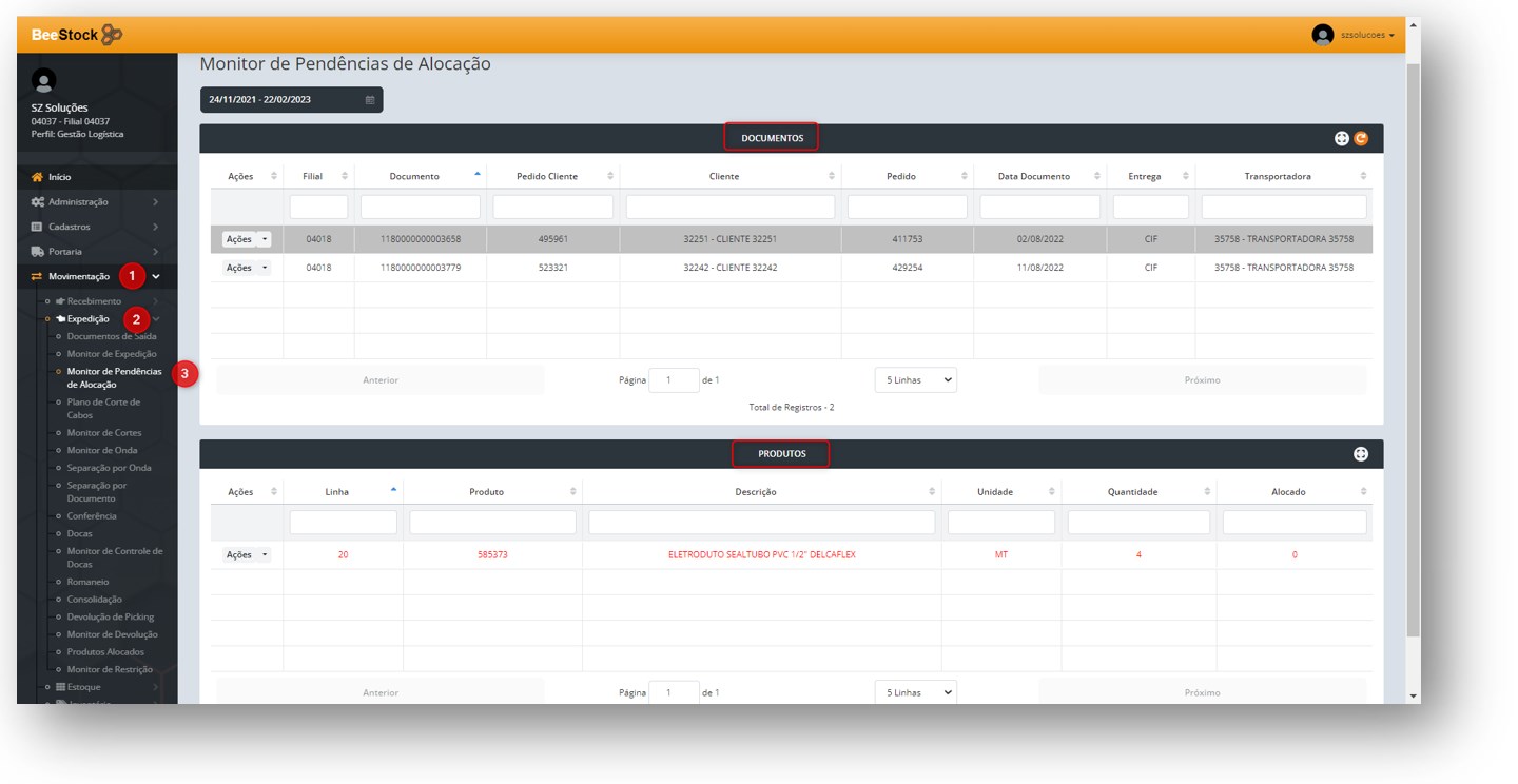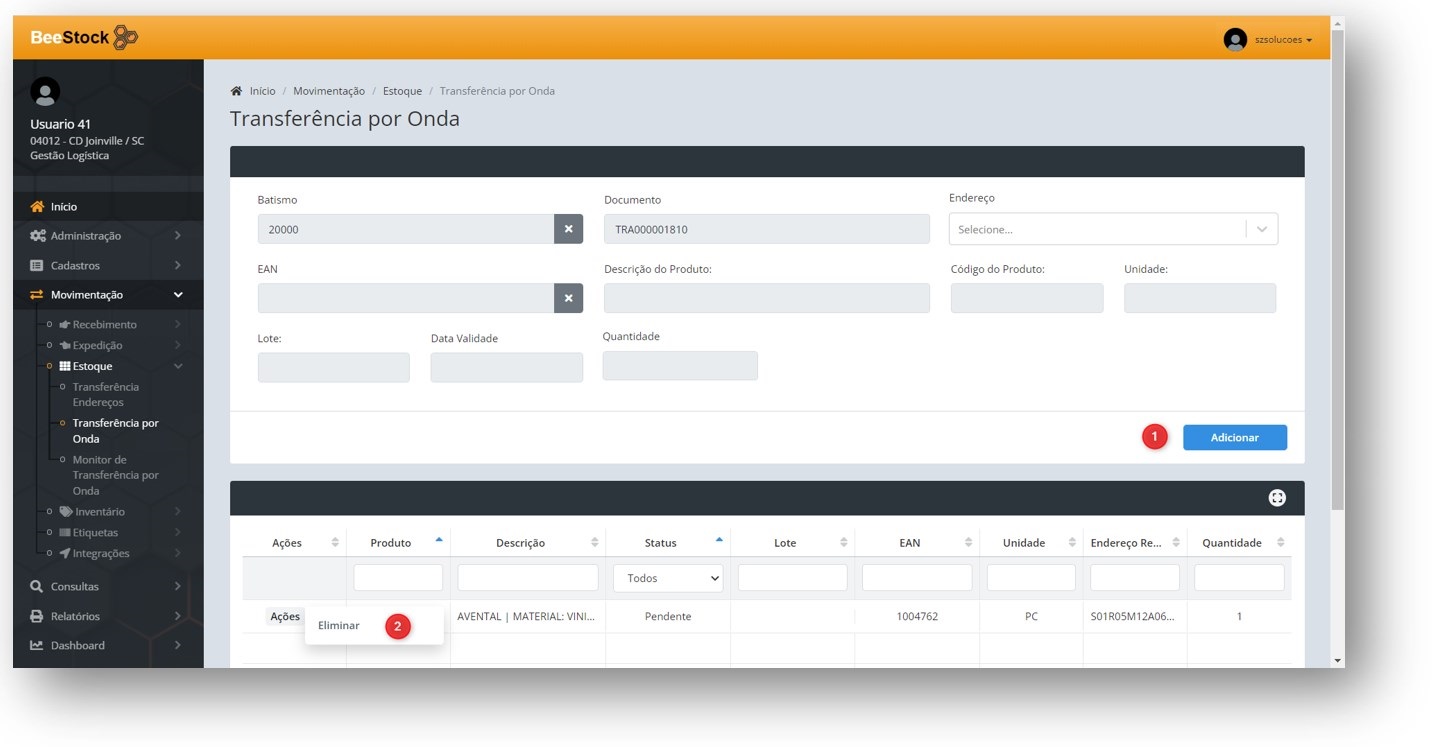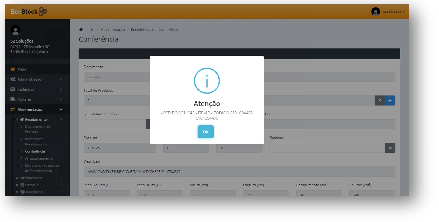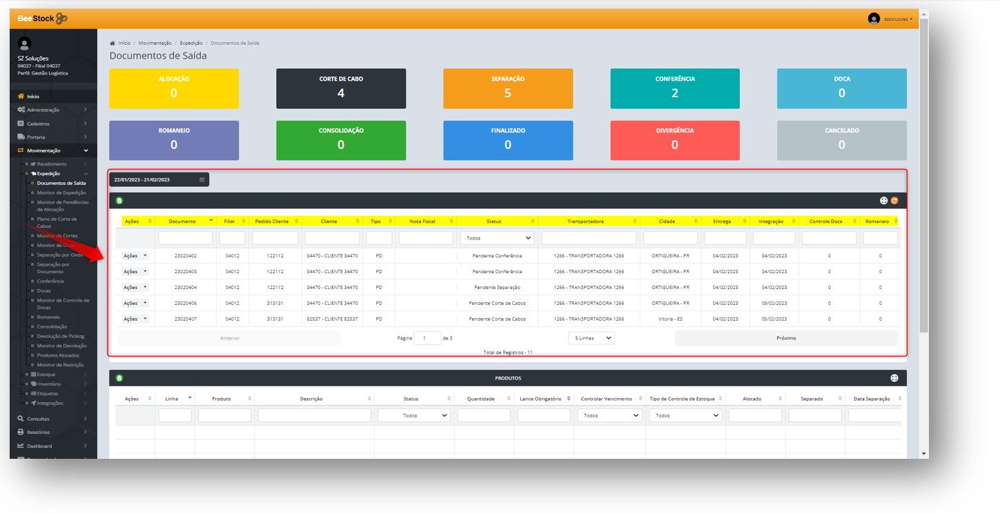 In this example, we see the receipt process, where an NFE moves from the REC warehouse to WMS and, after the receipt process, goes to the RV1 warehouse: