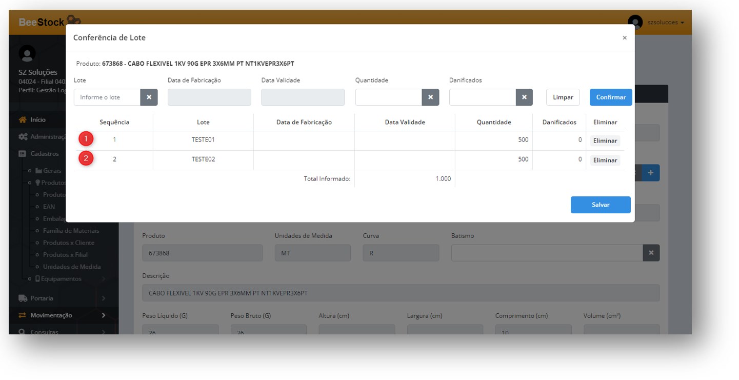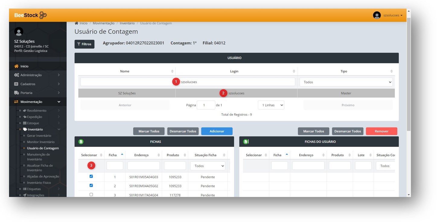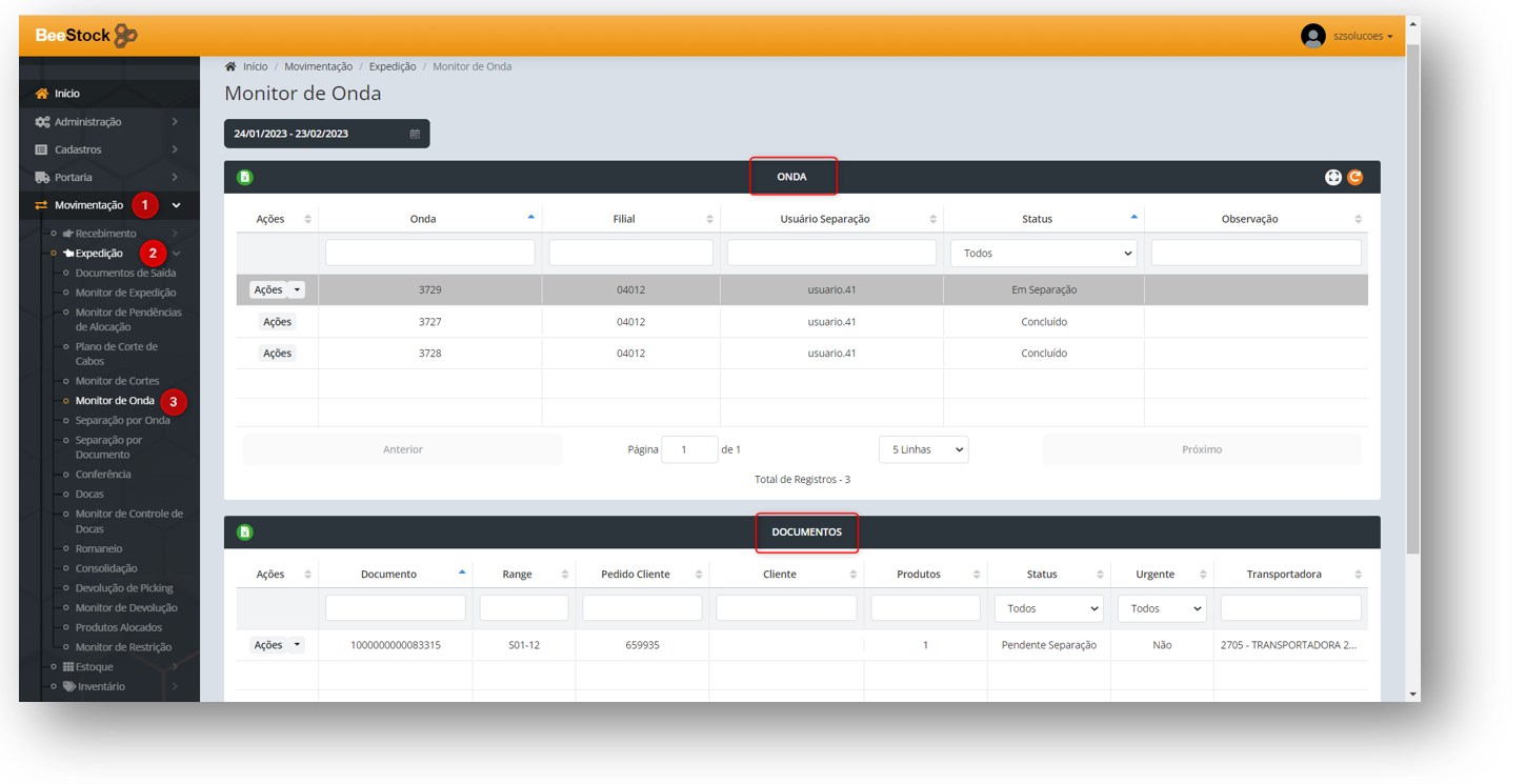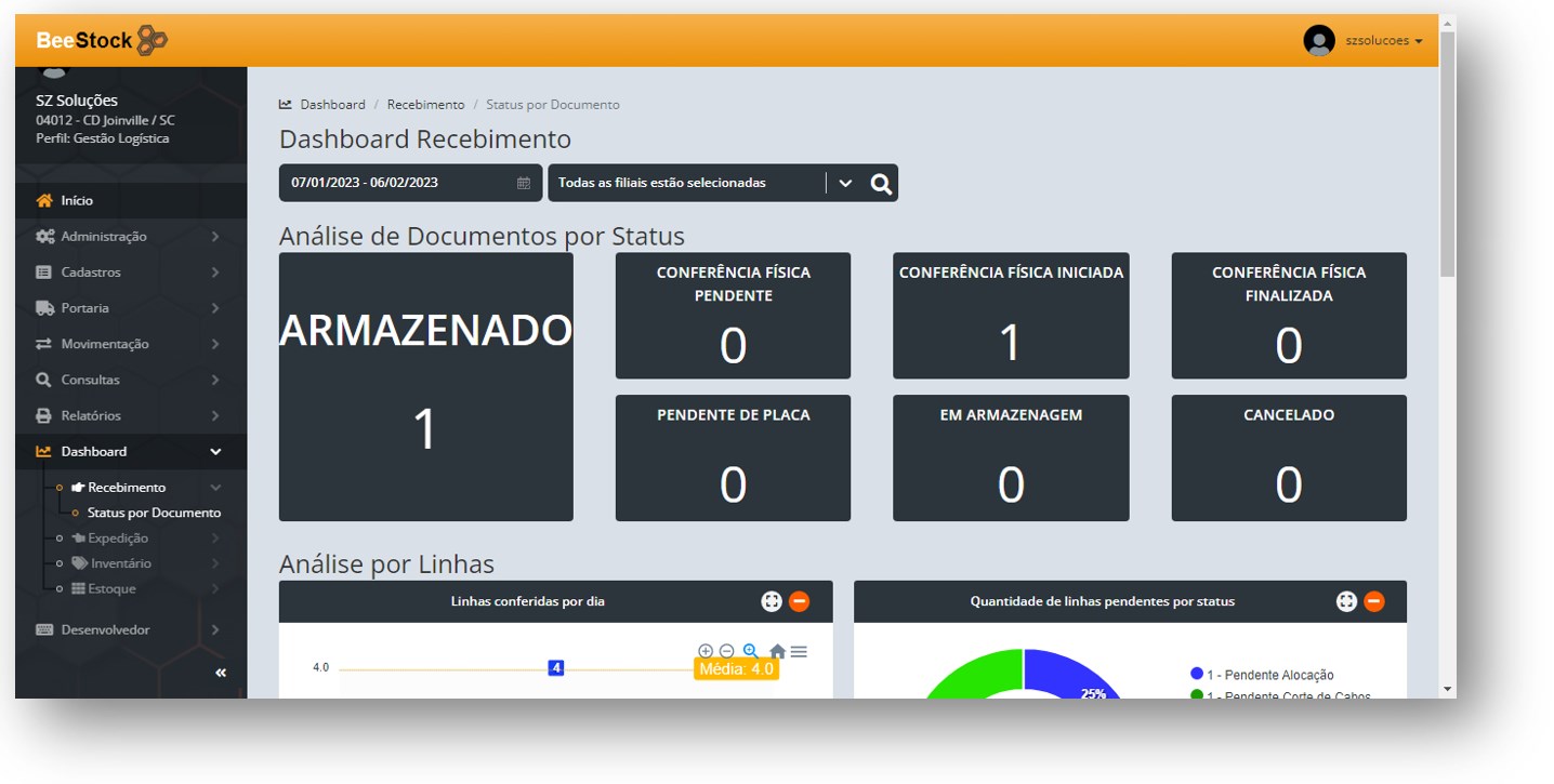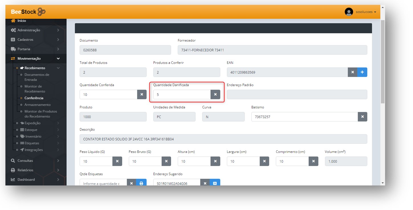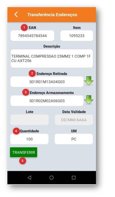 In this example, we see the receipt process, where an NFE moves from the REC warehouse to WMS and, after the receipt process, goes to the RV1 warehouse: