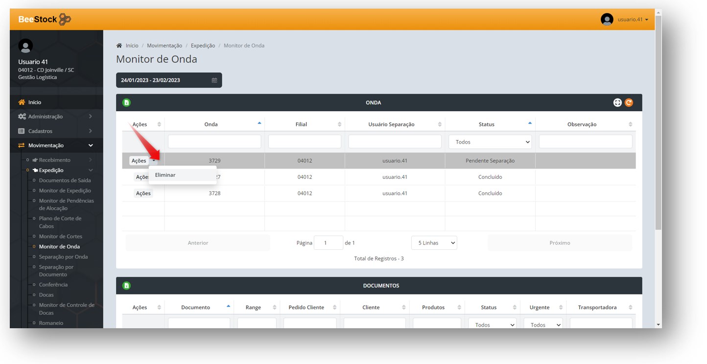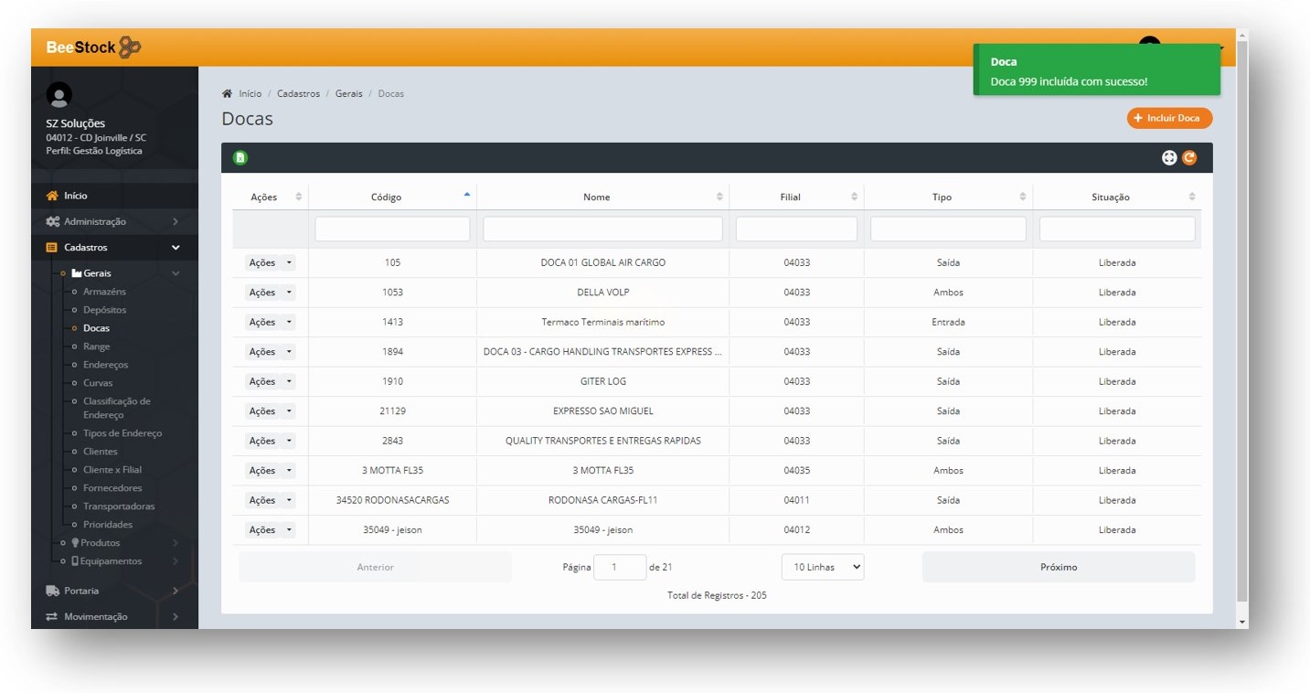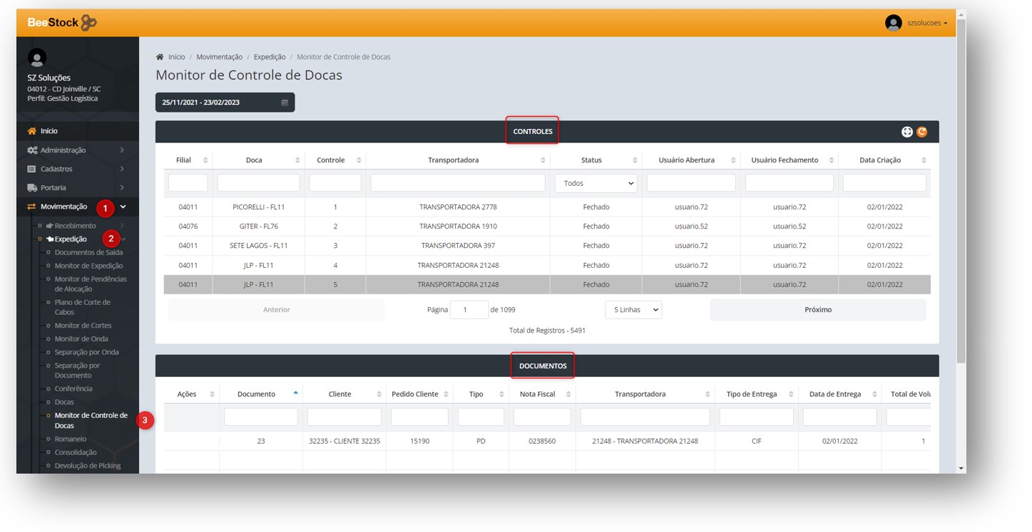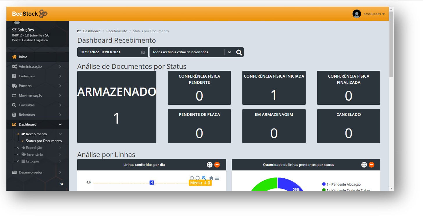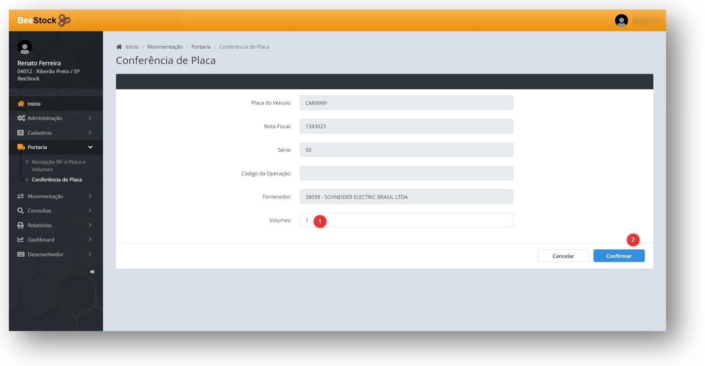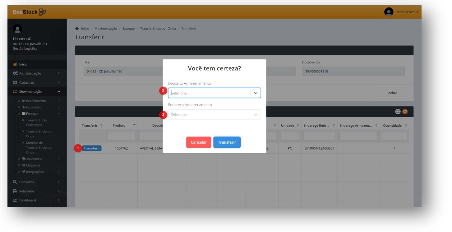 In this example, we see the receipt process, where an NFE moves from the REC warehouse to WMS and, after the receipt process, goes to the RV1 warehouse: