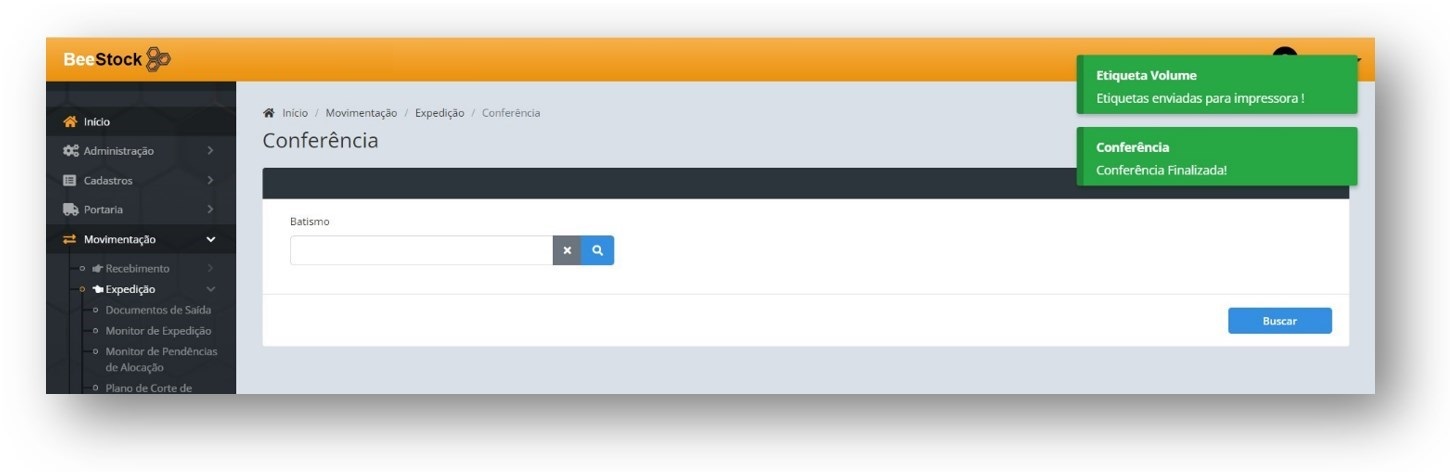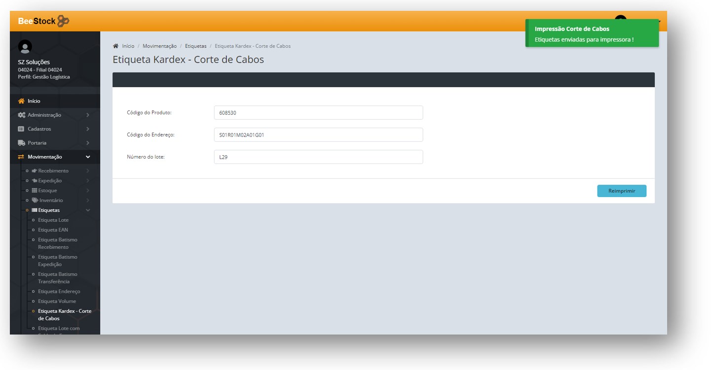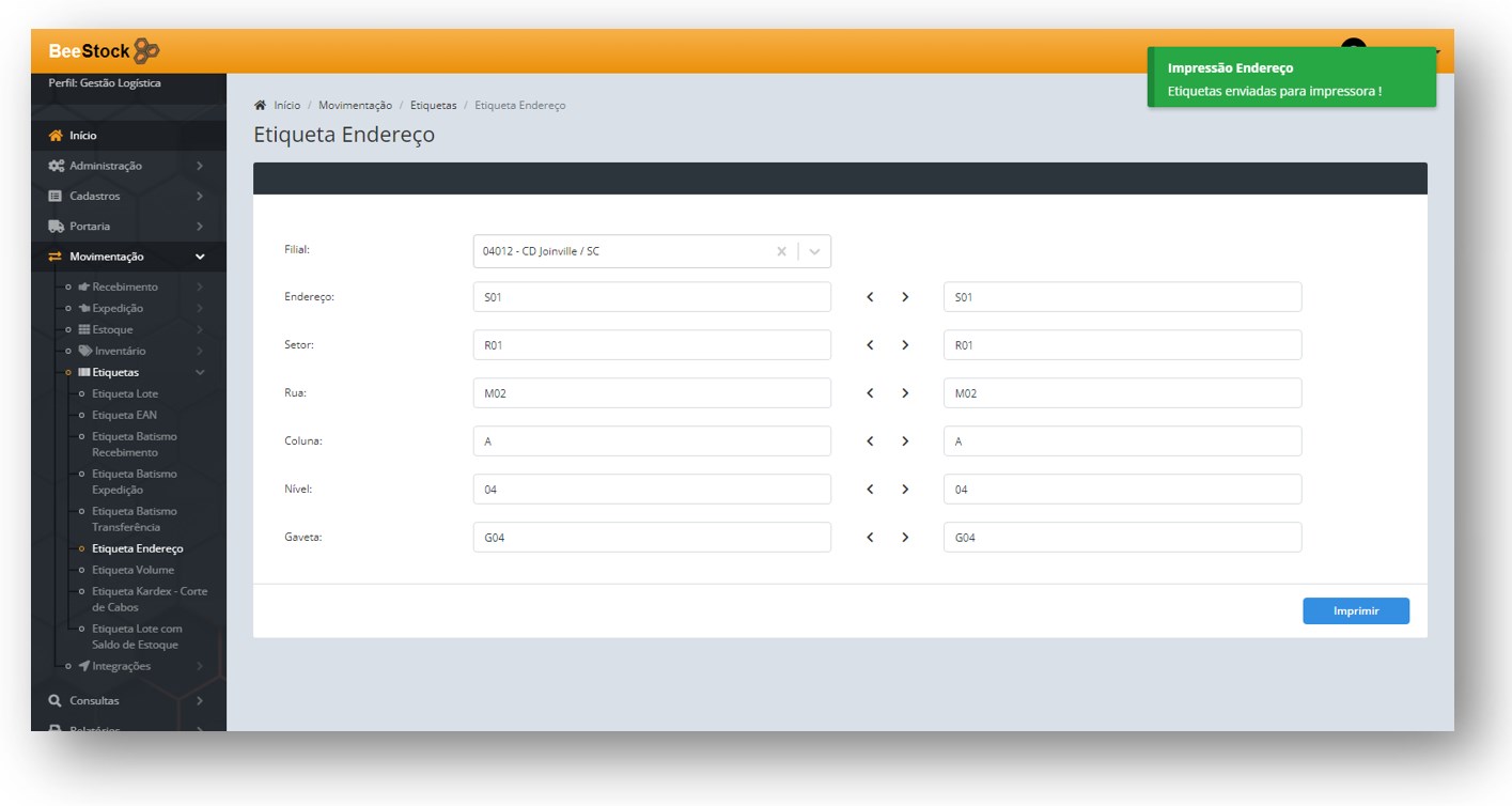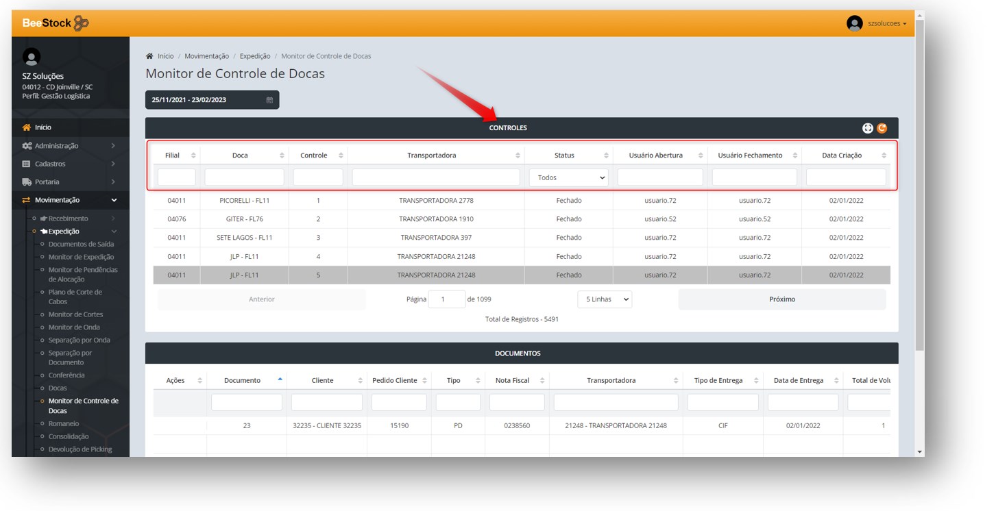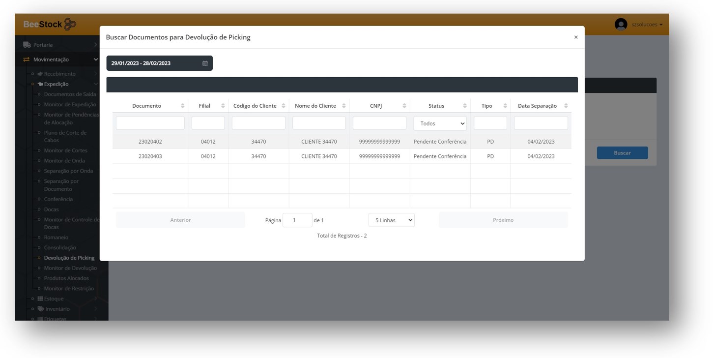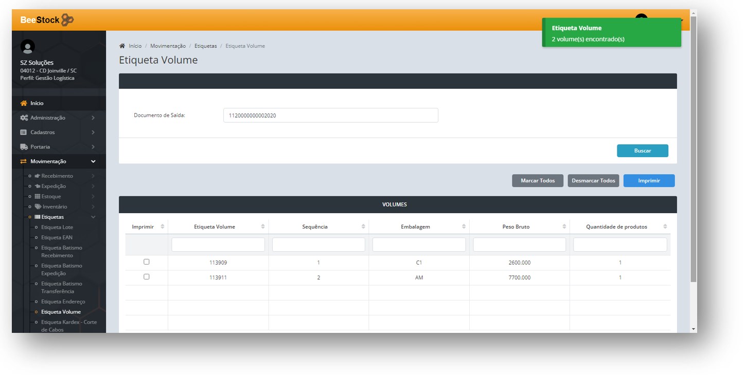 In this example, we see the receipt process, where an NFE moves from the REC warehouse to WMS and, after the receipt process, goes to the RV1 warehouse: