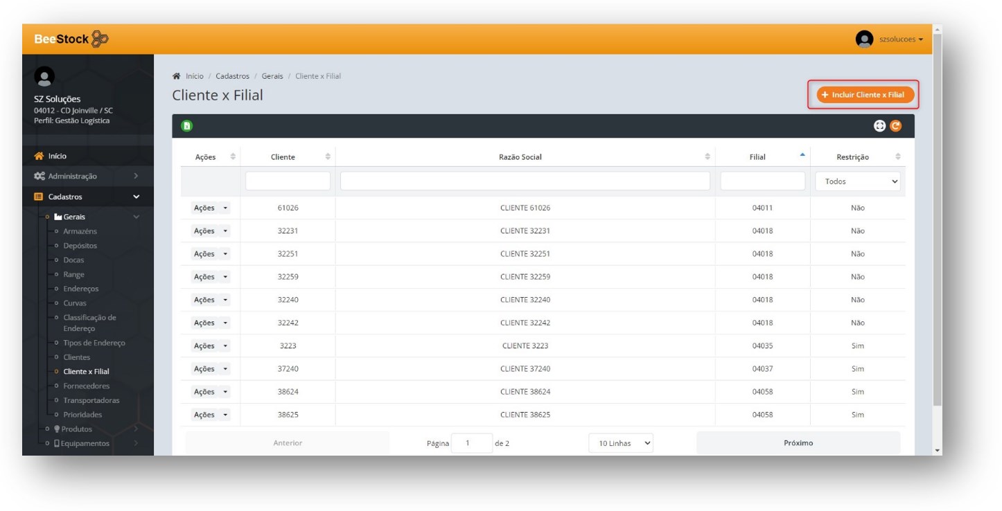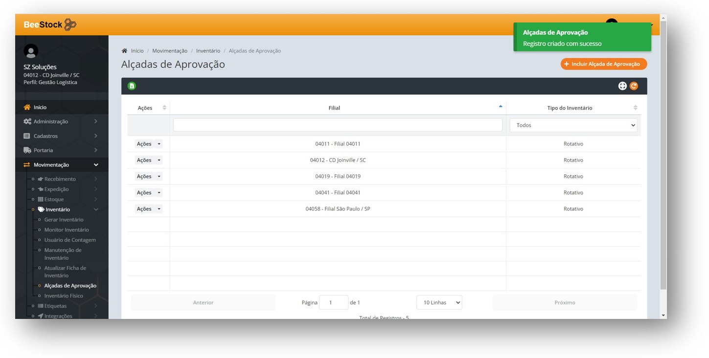 This screen will list all branches registered in the system, as well as their parameters for specific configurations per branch.
