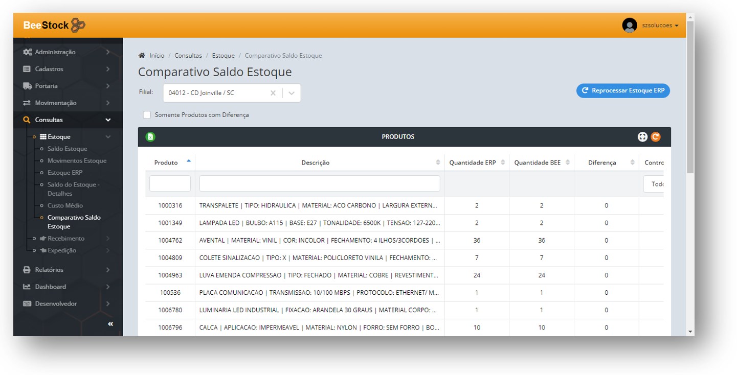 Located in the Inquiries > Inventory > Stock Balance Comparison menu, this screen lists the products and compares the balances between BeeStock® and the ERP.