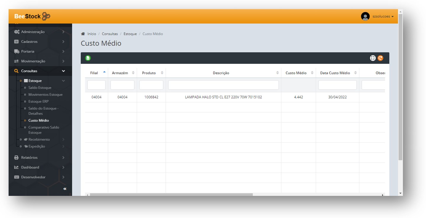 Located in the Inquiries > Inventory > Average Cost menu, this screen lists the average cost of the registered products.