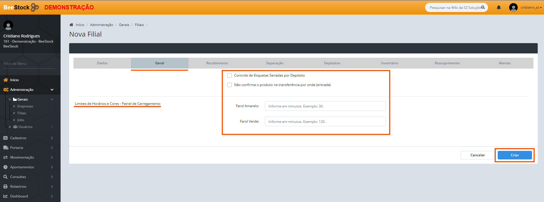 Também é possível informar Limites de Horários e Cores - Painel de Carregamento, preenchendo os campos: