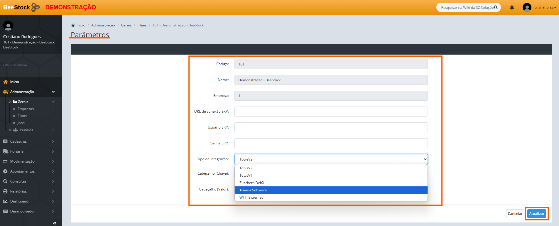 Preencha as informações e selecione o tipo de integração selecionando ERP: