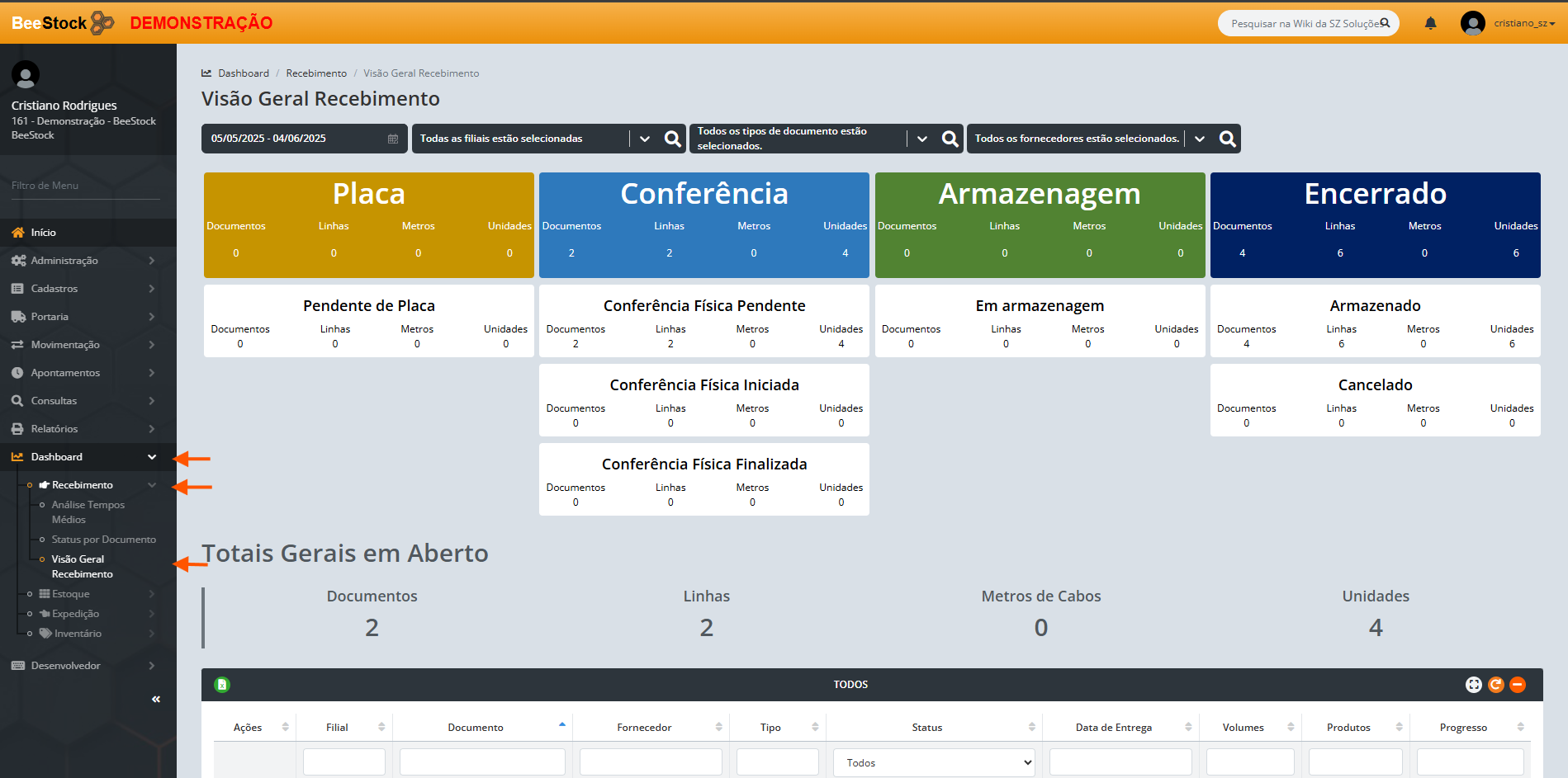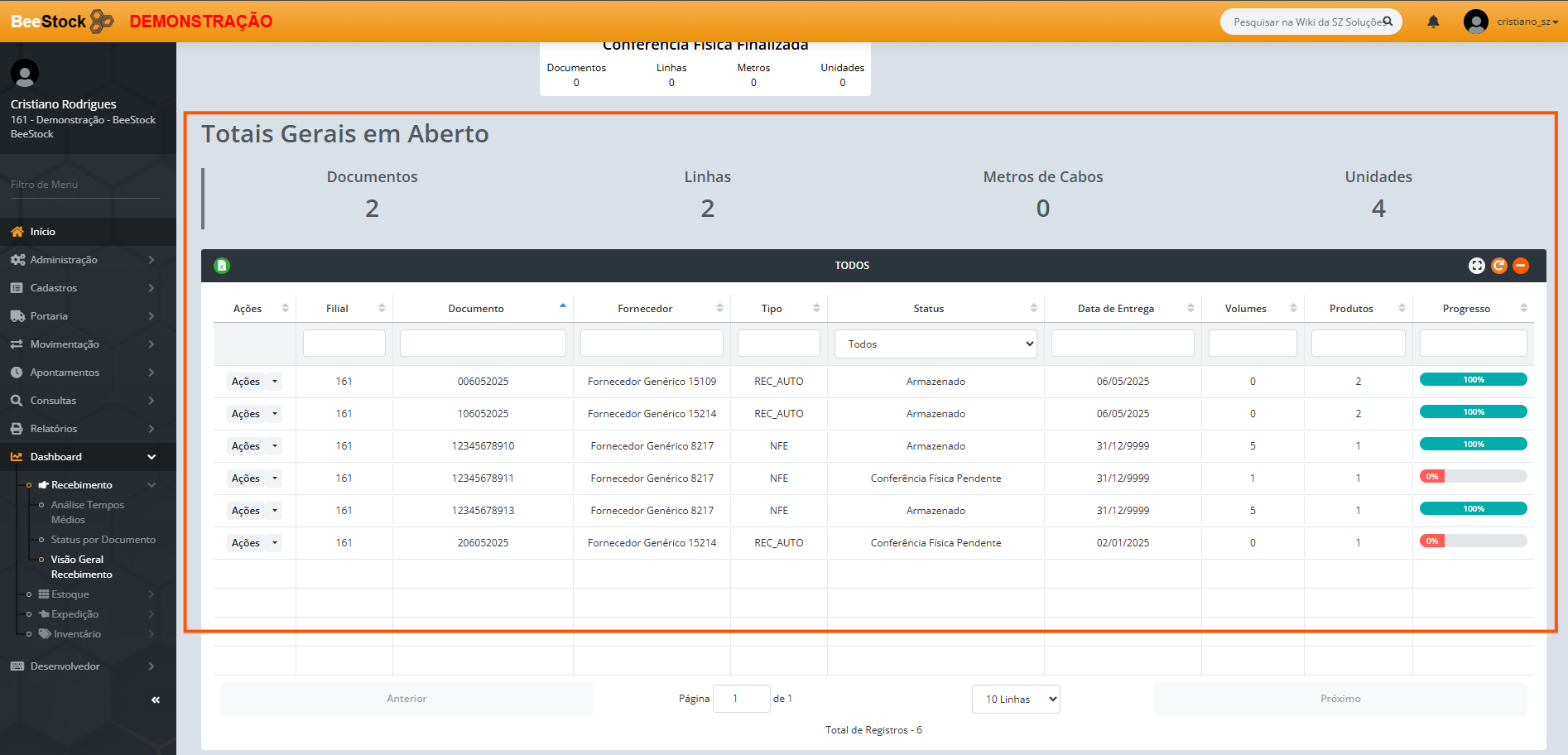 - Volumes: Quantidade total de volumes físicos recebidos.