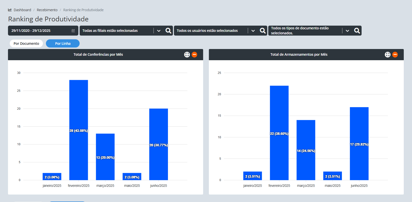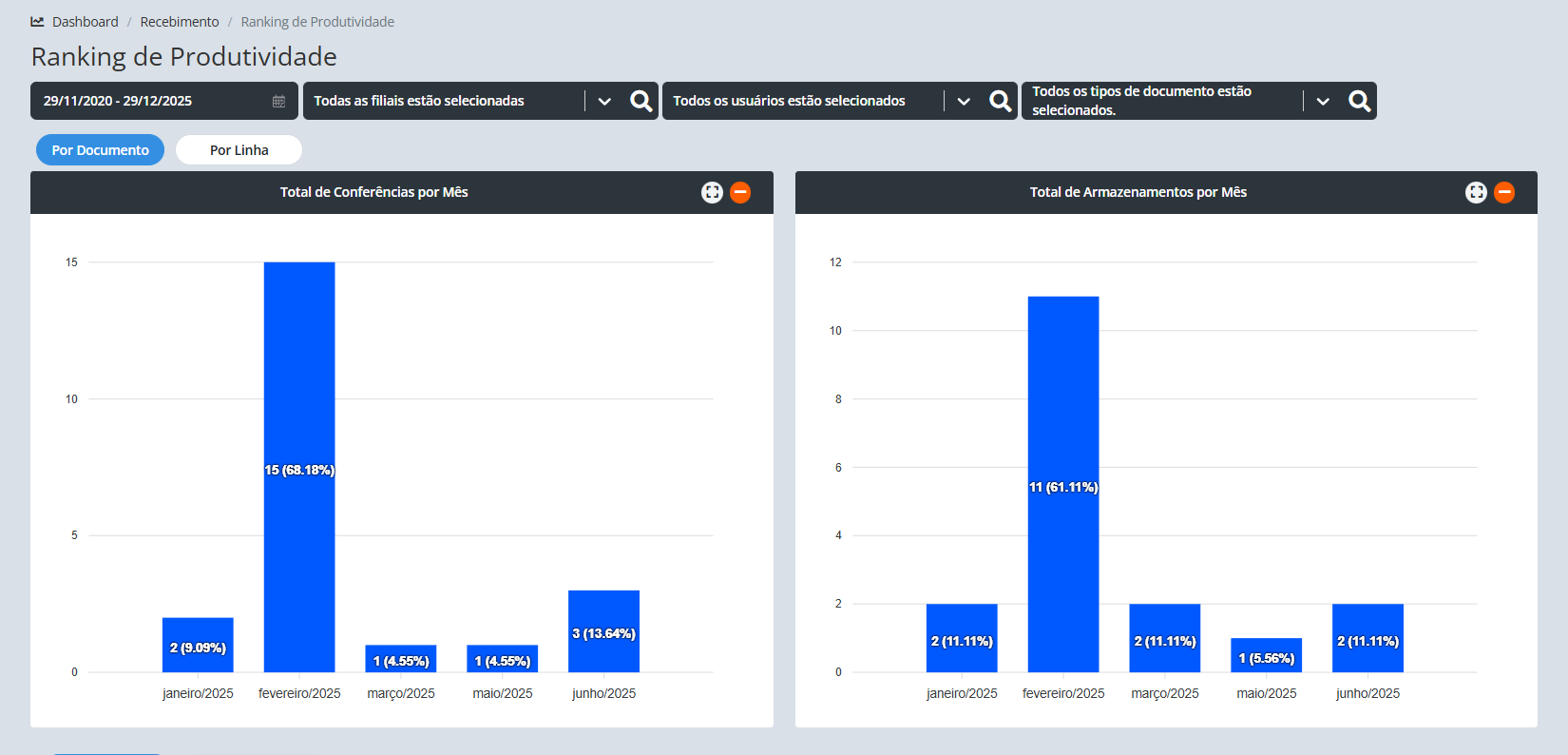 2. É possível alterar os campos para analisar os indicadores por Linhas ou Documentos como também alterar para ver os dados de Recebimento ou Armazenamento.