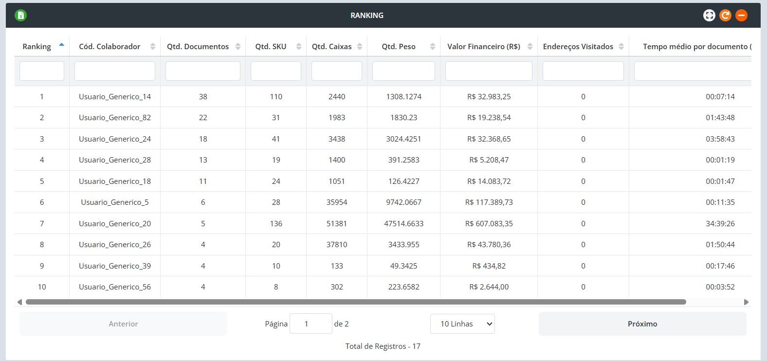 3. Ao realizar a consulta na Grid, é possível filtrar o Ranking de Conferentes há nível de Documentos, Linhas, Caixas, Pesos, Valor financeiro e Endereços visitados.