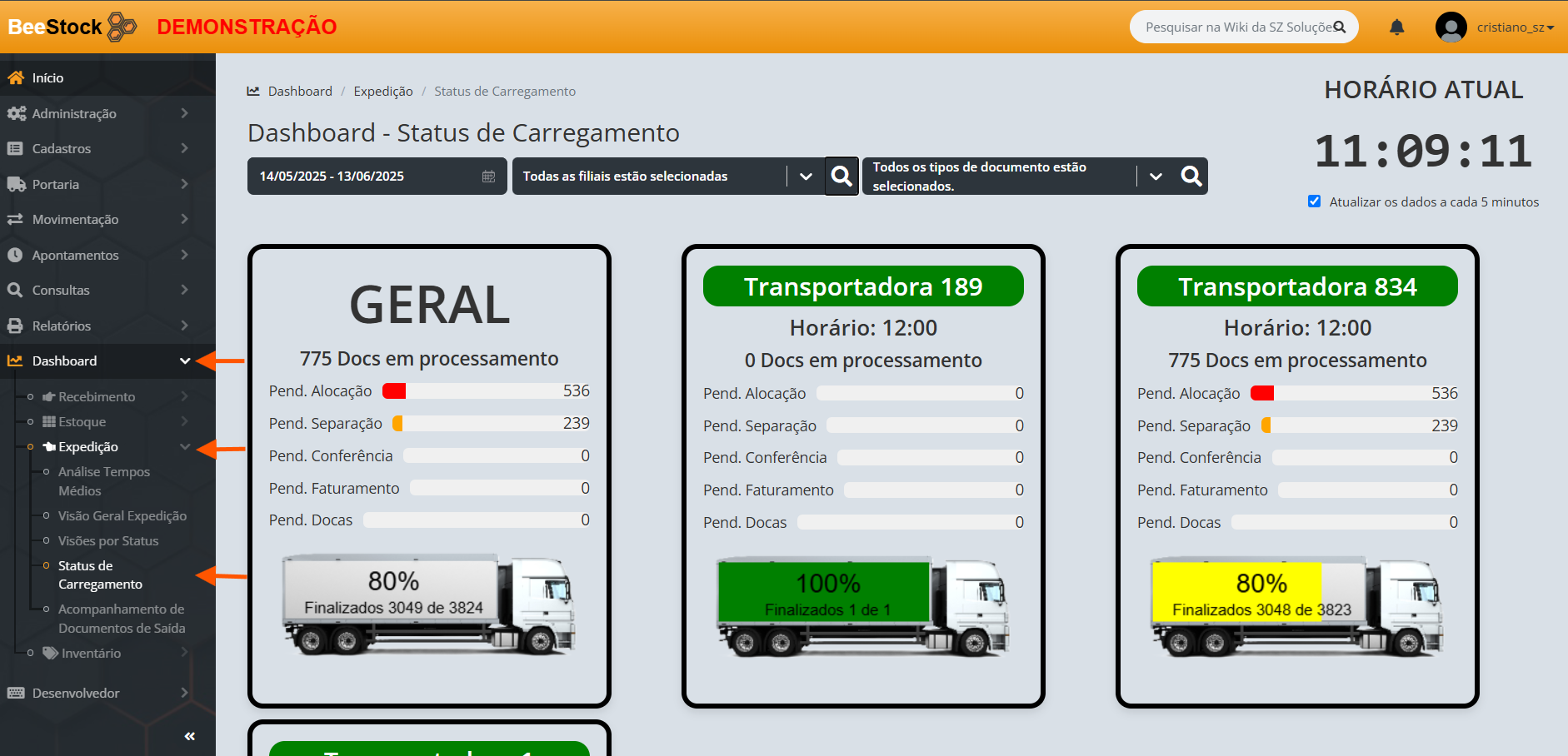 1. Acesse o menu Dashboard > Expedição > Status de Carregamento.