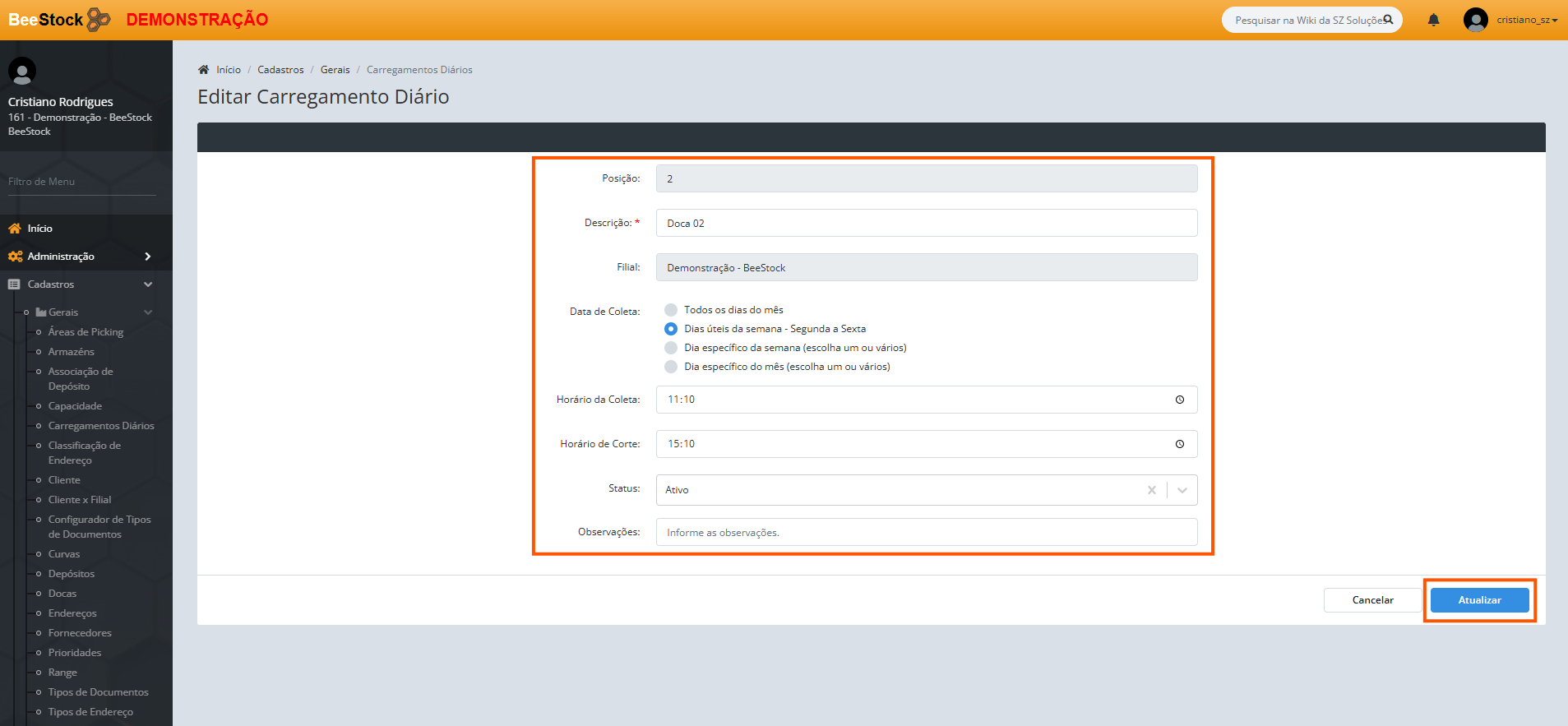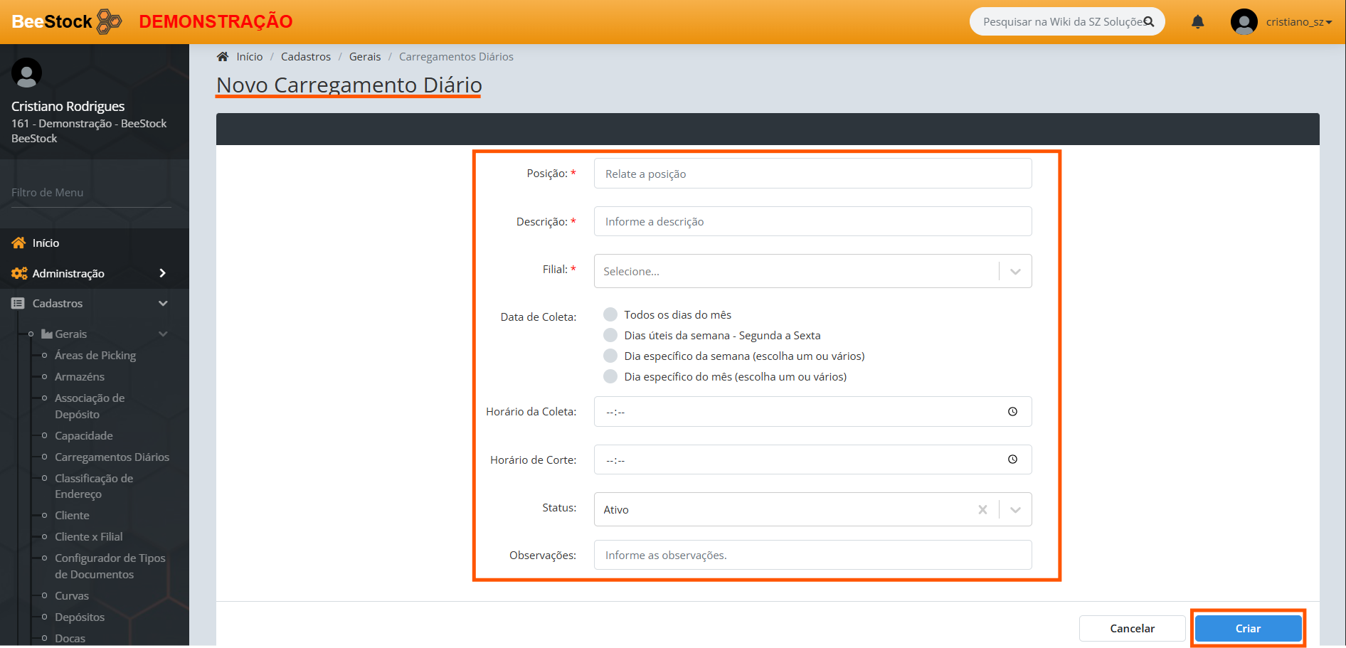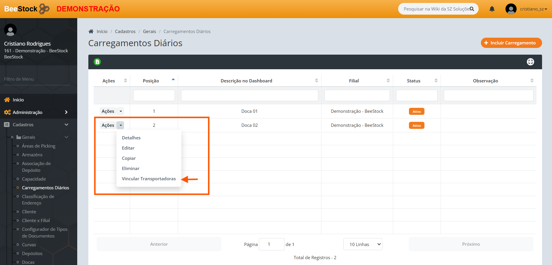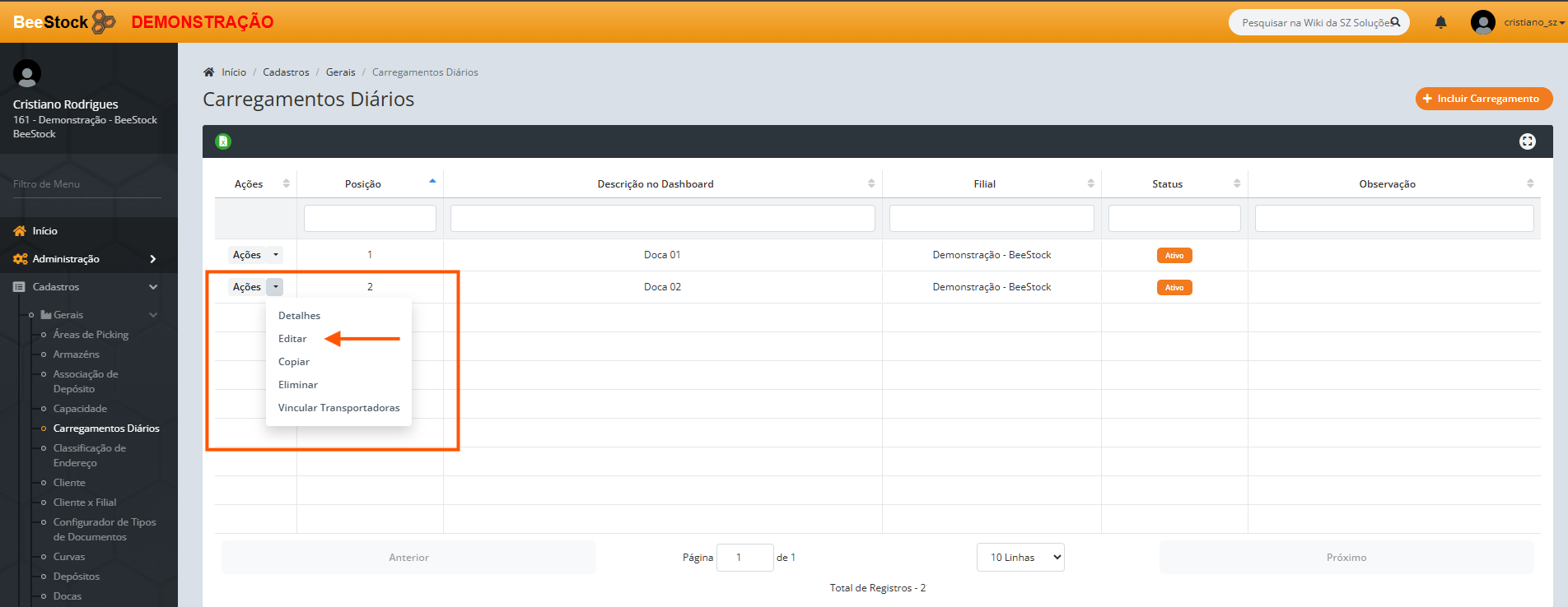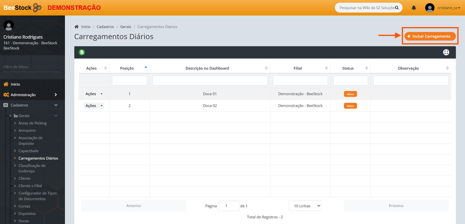 Agora vamos ver como adicionar estes carregamentos no cadastro Carregamentos Diários: