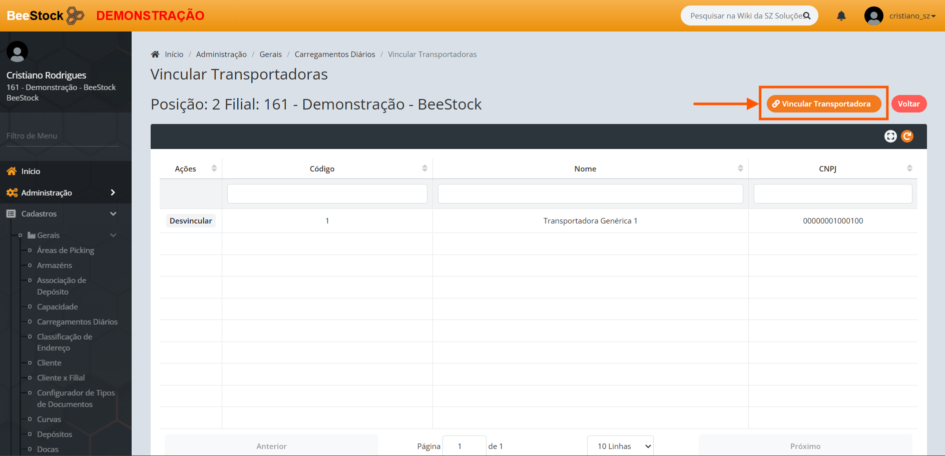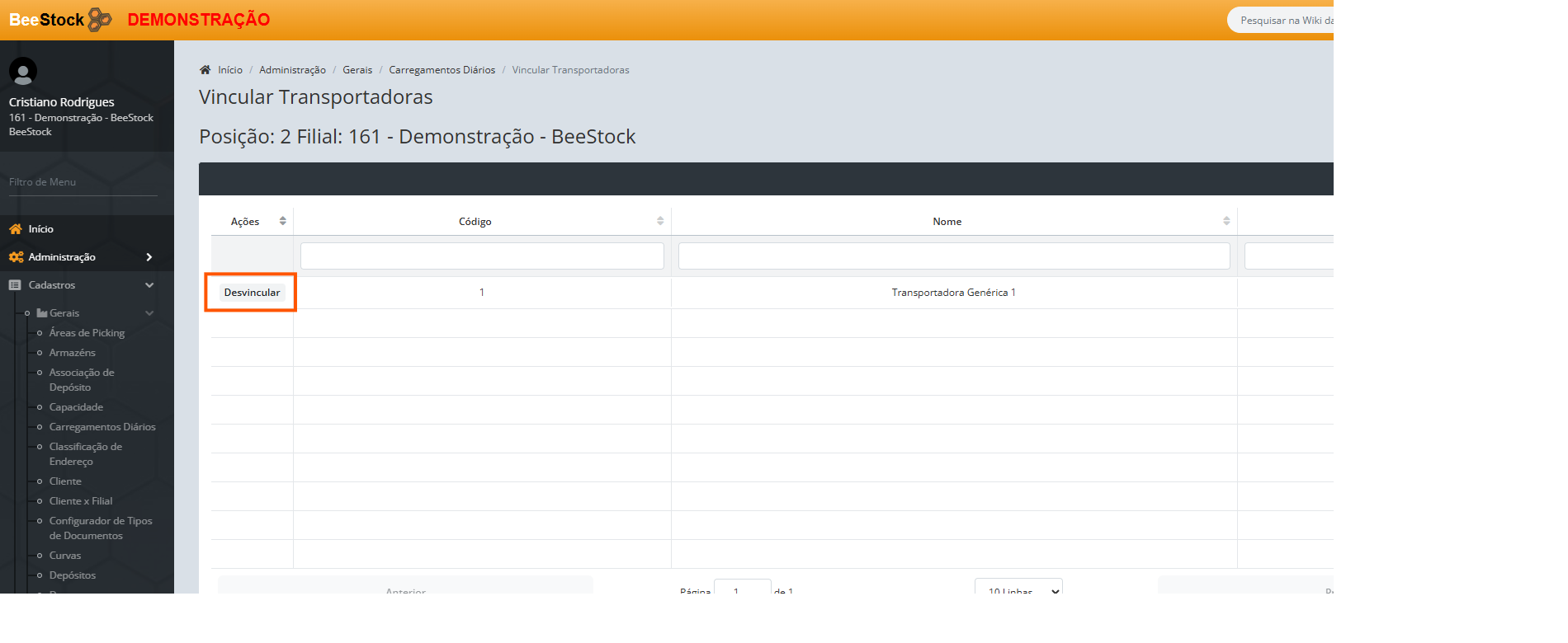 - A transportadora poderá ser desvinculada clicando no botão Desvincular.