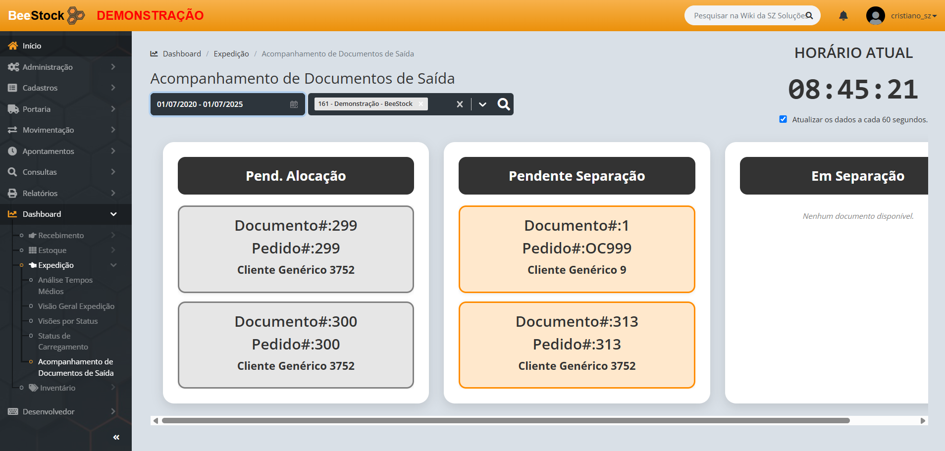 1. Acesse o menu Dashboard > Expedição > Acompanhamento de Documentos de Saída.