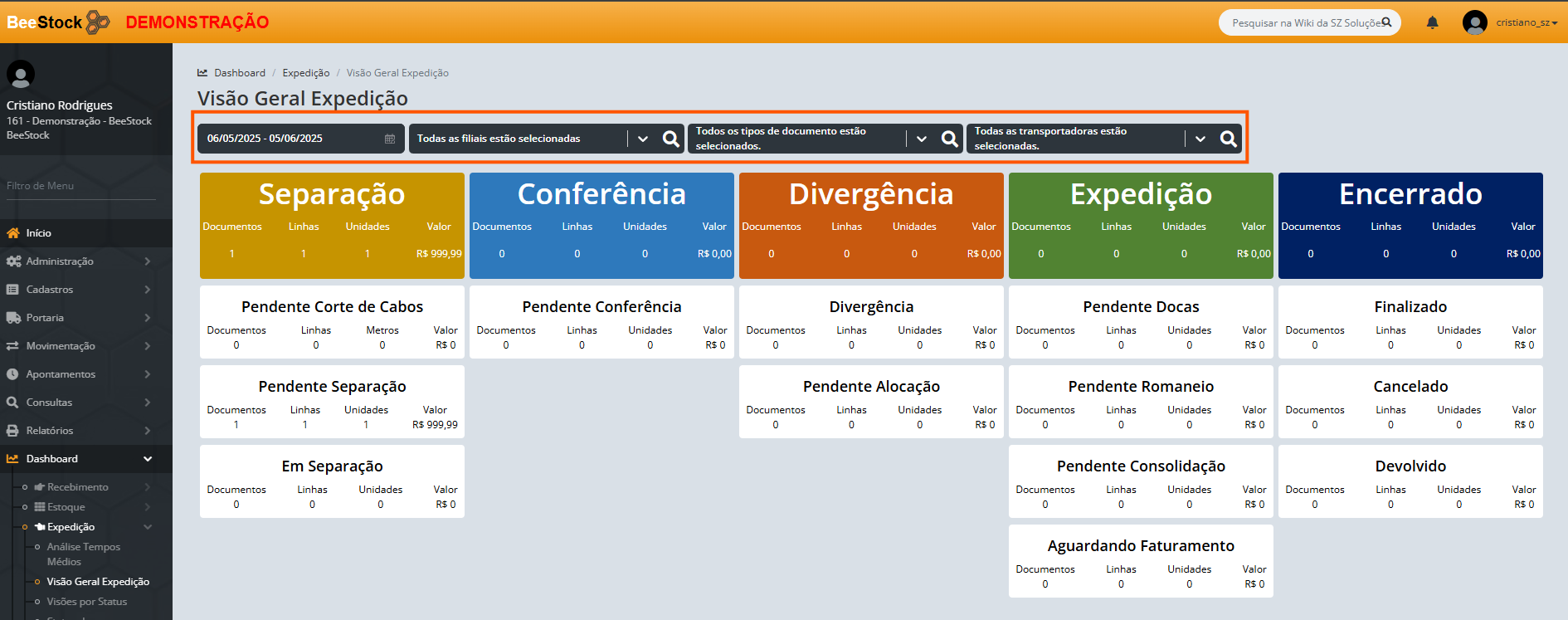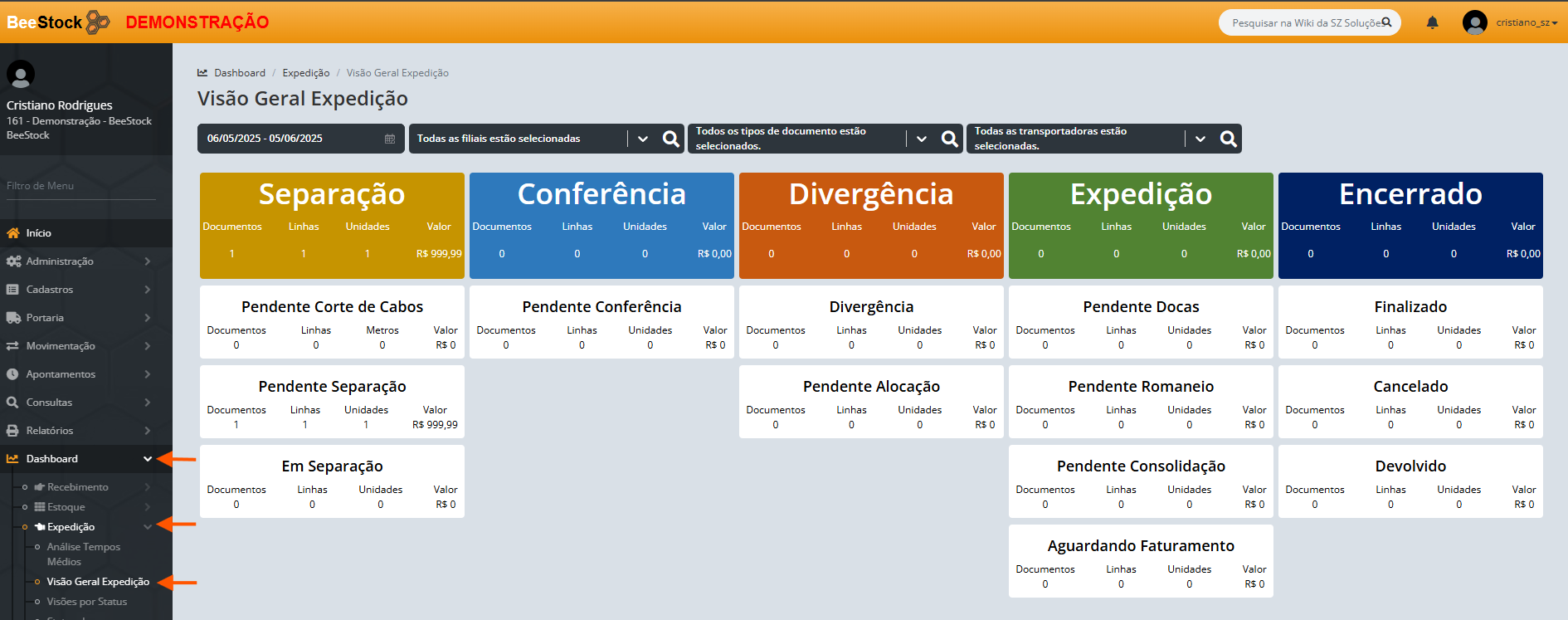 1. Acesse o menu Dashboard > Expedição > Visão Geral Expedição.