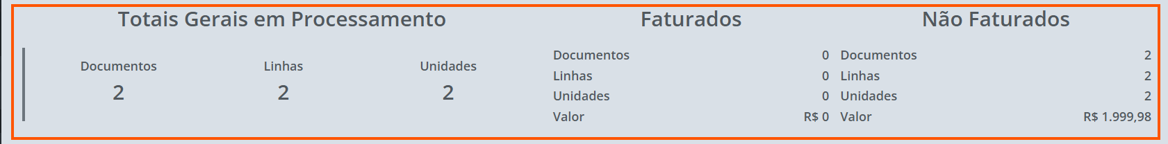 4. Poderá ser acompanhado também os Totais Gerais em Processamento , Faturados e Não Faturados mostrando: