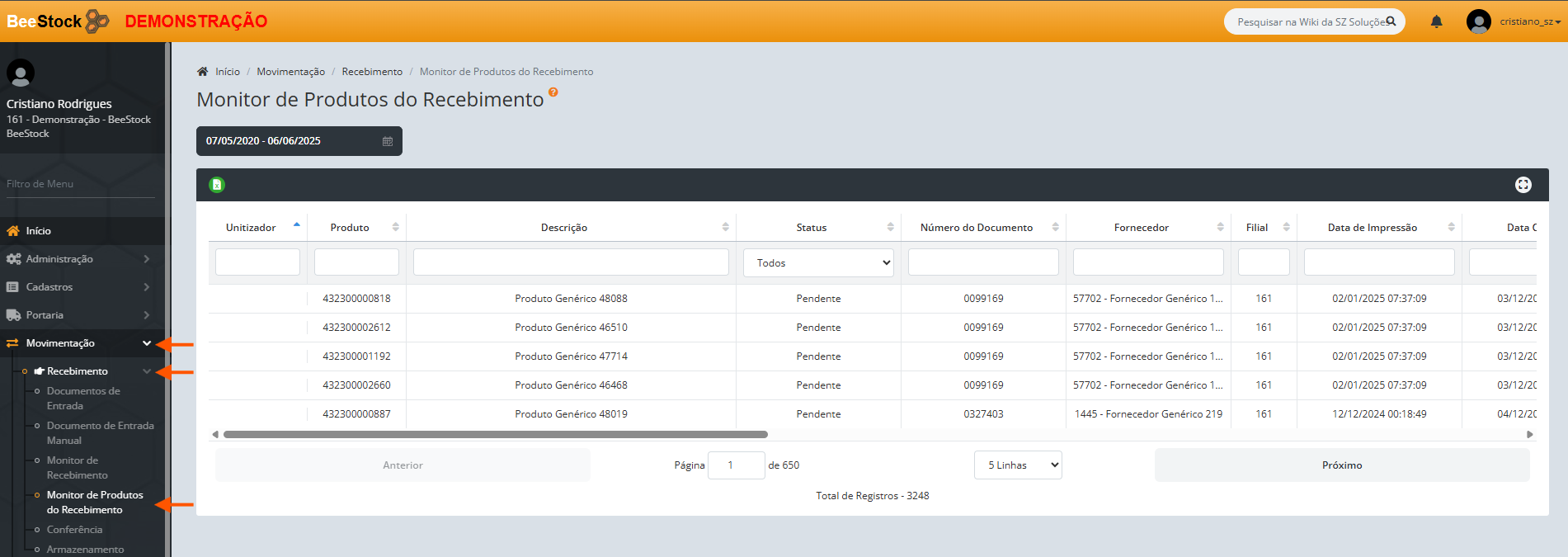 1. Acesse o menu Movimentação > Recebimento > Monitor de Produtos do Recebimento.