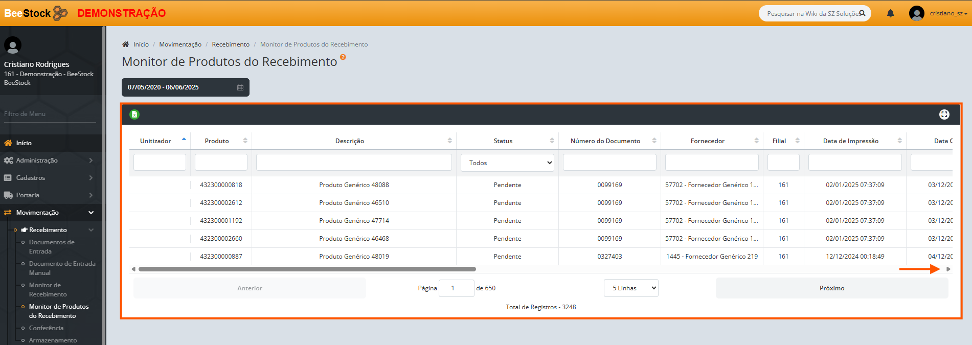 Localizado no menu Movimentação > Recebimento > Monitor de Produtos do Recebimento, a tela permite visualizar todos os produtos associados a documentos em processo de recebimento.