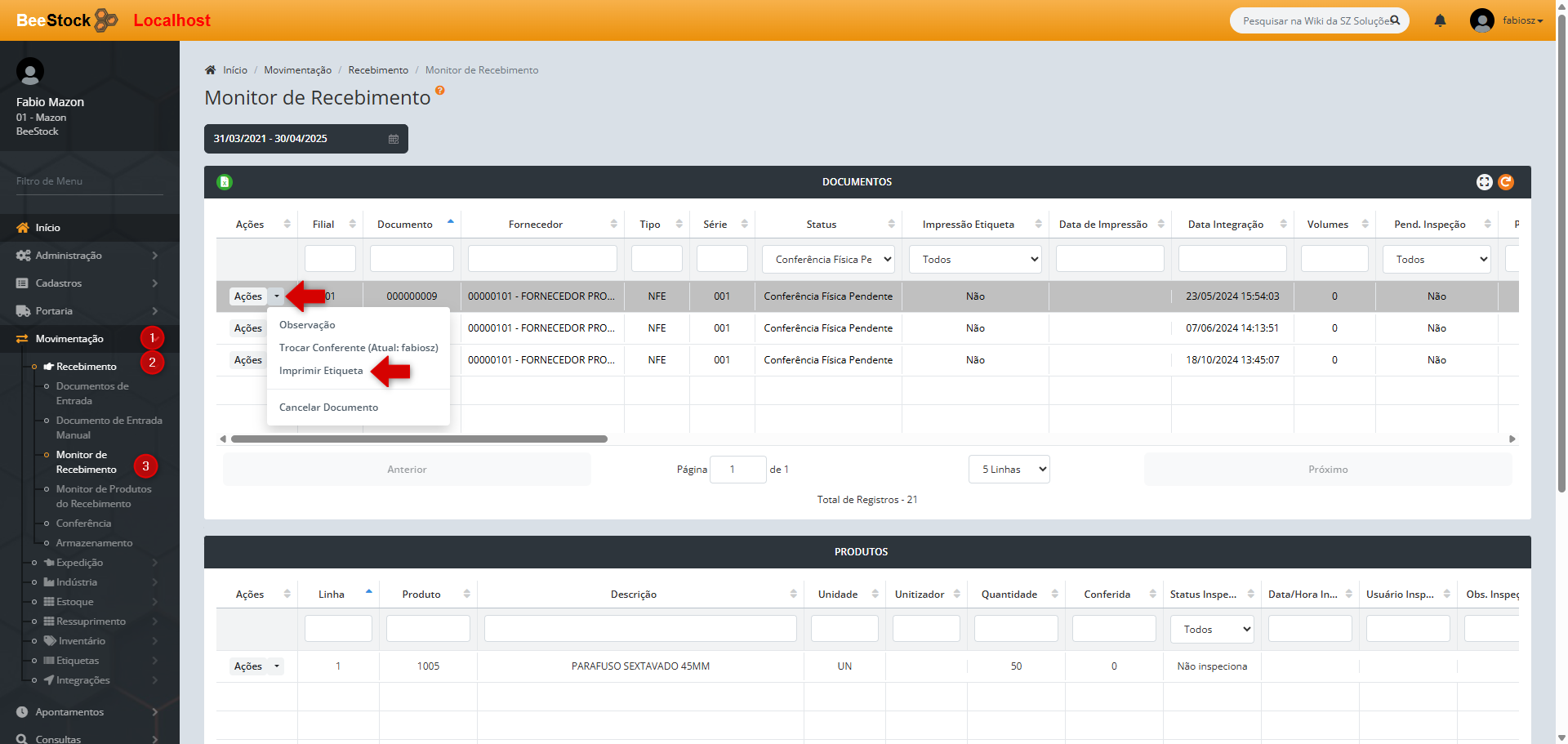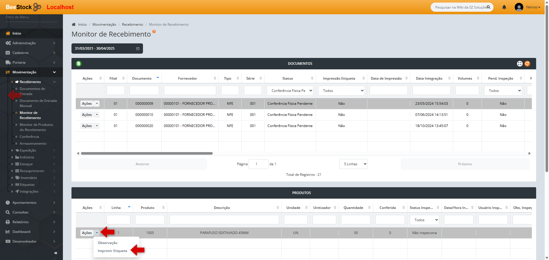 1. Na tela Monitor de Recebimento, clique no botão Ações > Imprimir Etiqueta ao lado do item desejado.
