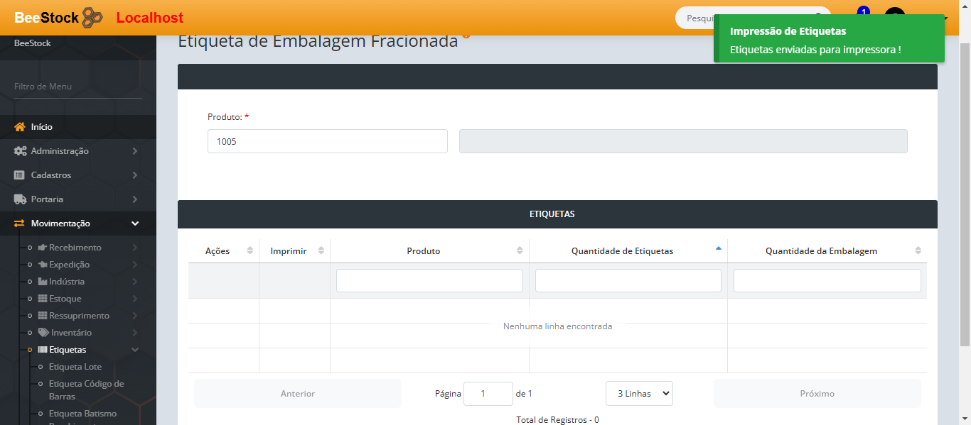 8. A mensagem de confirmação “Etiquetas enviadas para impressora!” será exibida.