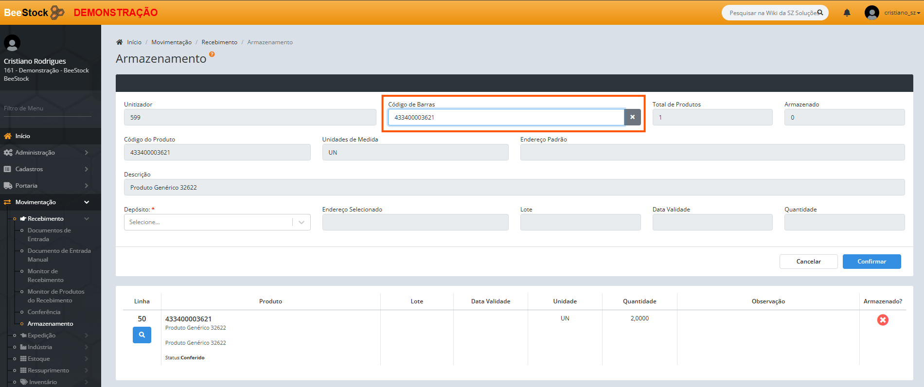 3. Na nova tela, insira o Código de Barras do produto que será armazenado: