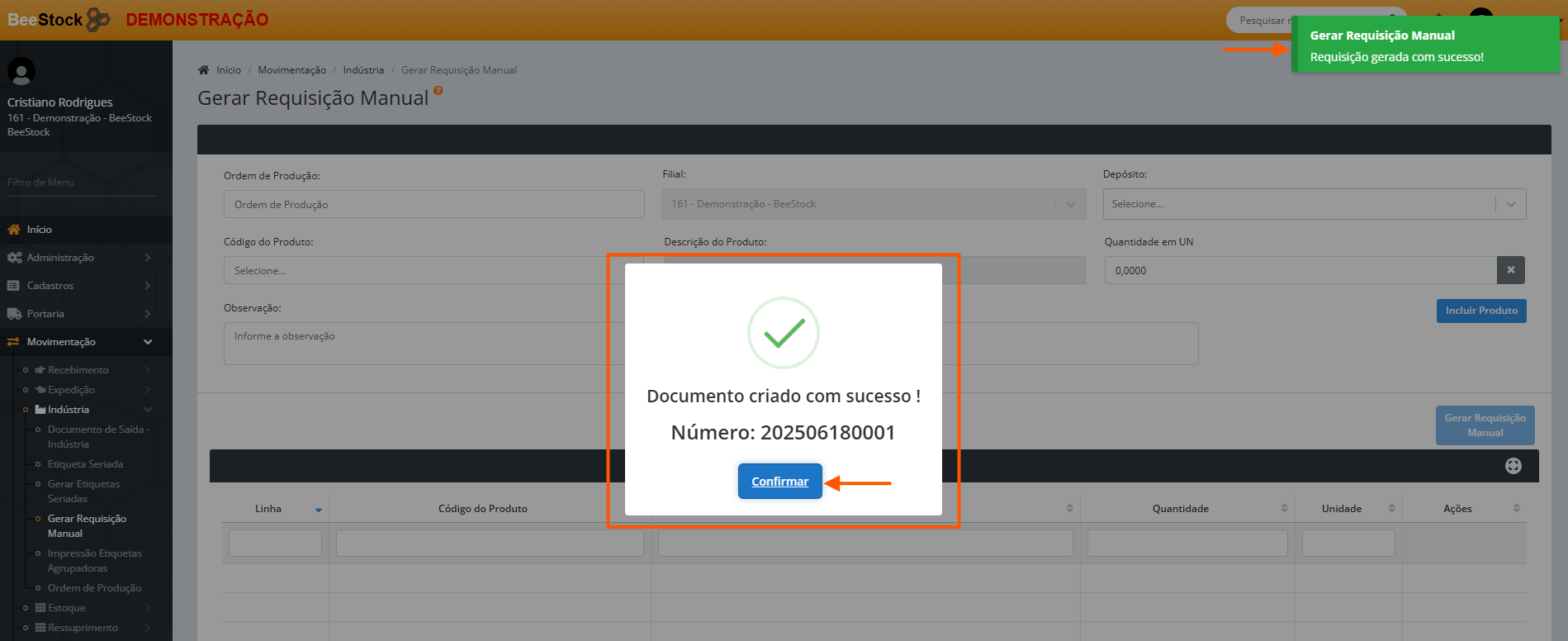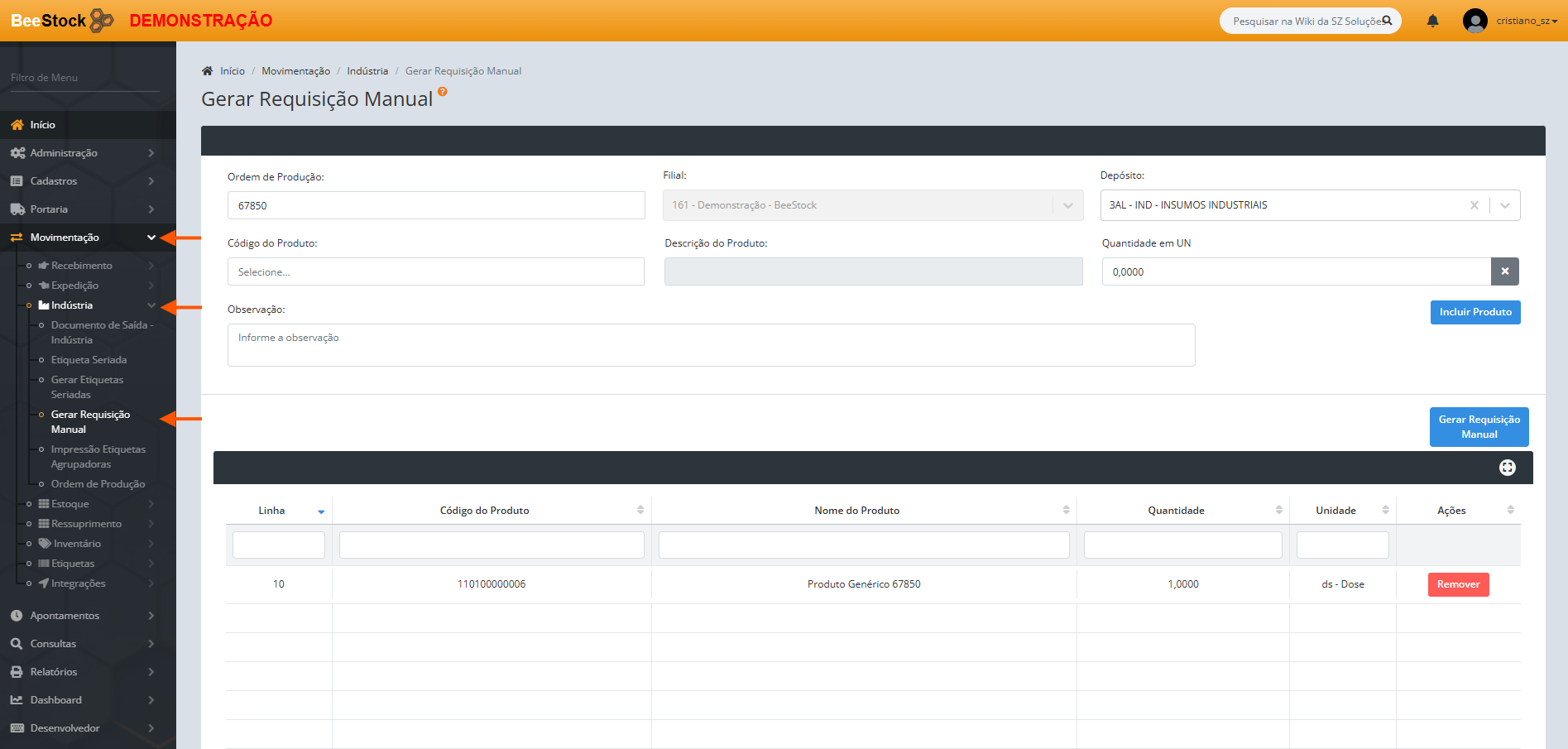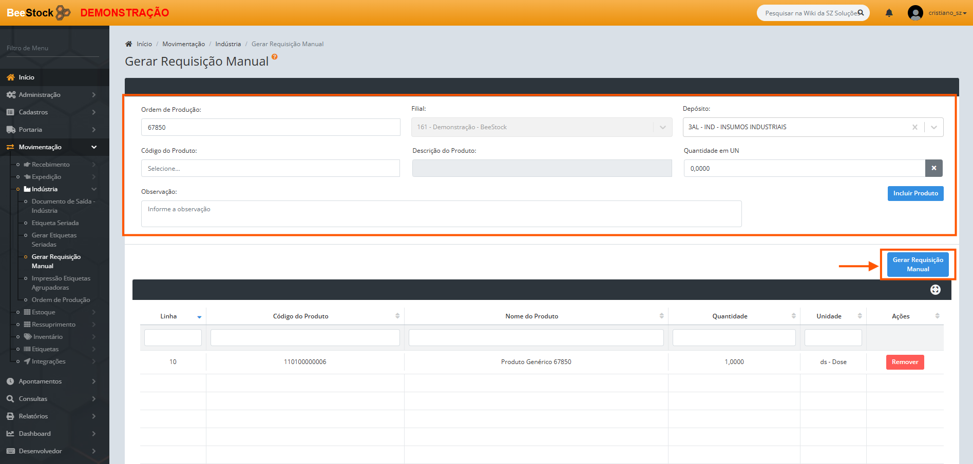 Localizado em Movimentação > Indústria > Gerar Requisição Manual, Aqui podemos Gerar Requisição Manual.