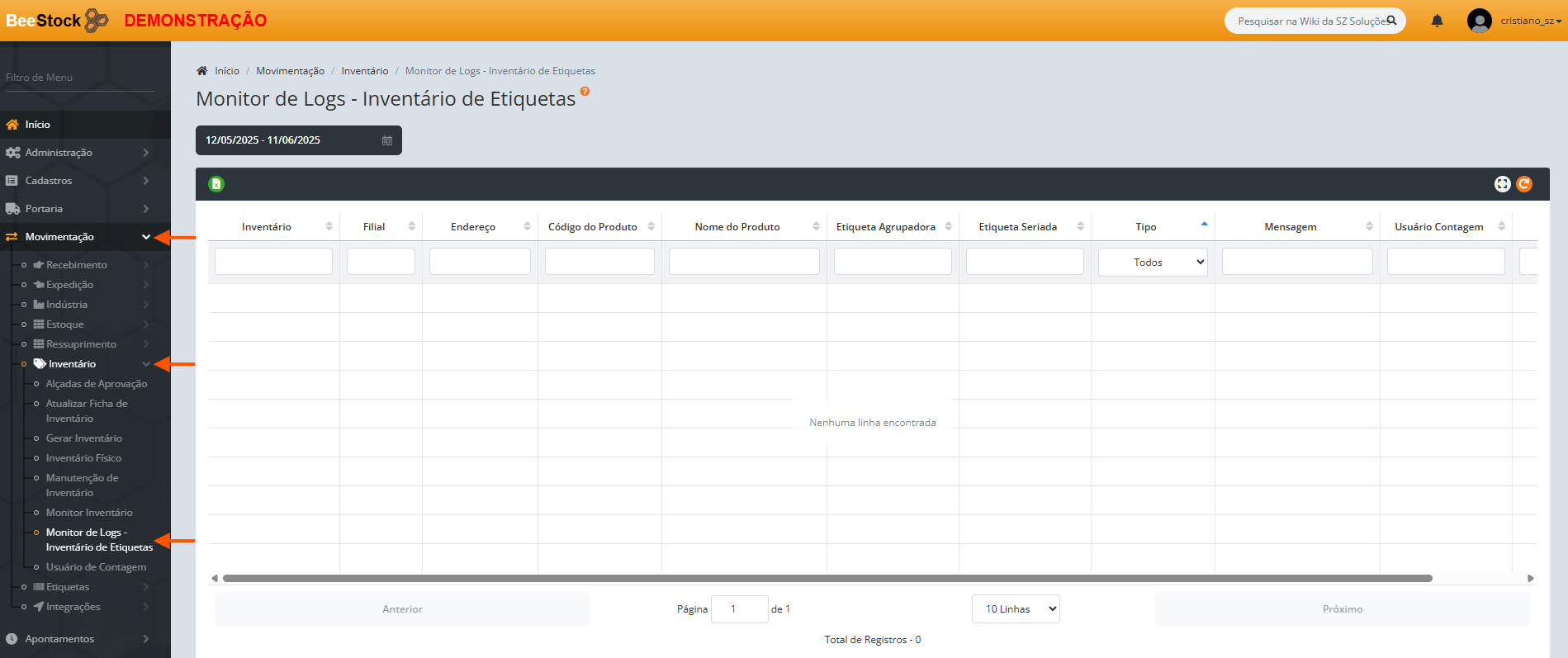 Localizado em Movimentação > Inventário > Monitor de Logs - Inventário de Etiquetas, aqui podemos acompanhar os logs do inventário de etiquetas.