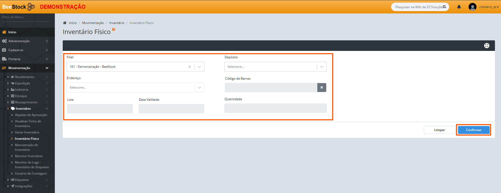 Para realizar um ajuste de inventário físico (apenas no WMS), deverão ser preenchidos os campos abaixo com informações válidas com saldo em estoque no WMS: