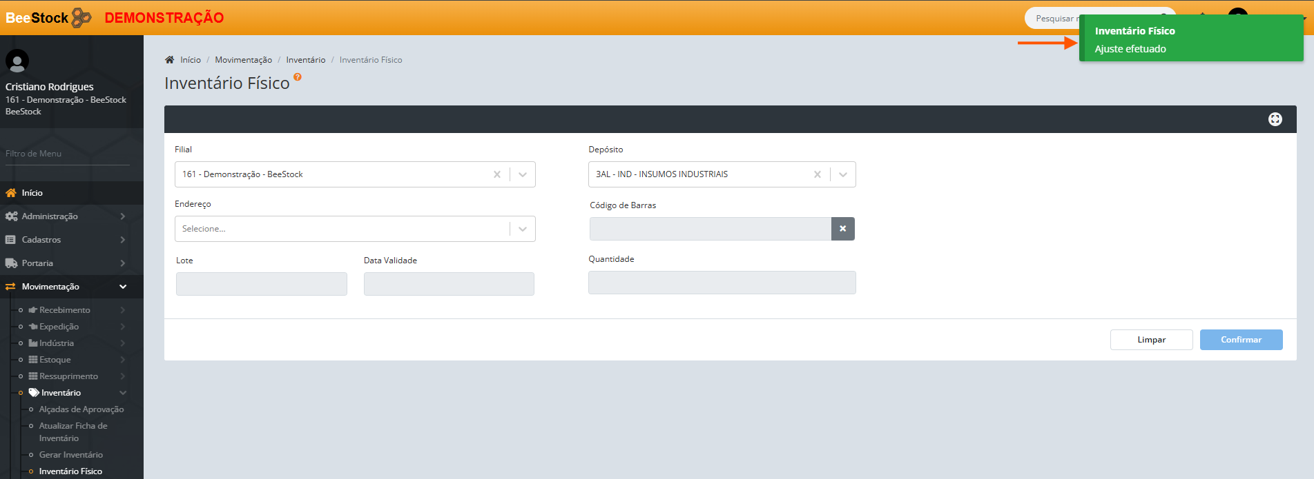 Ao clicar em Confirmar será apresentada a mensagem de confirmação Ajuste efetuado.