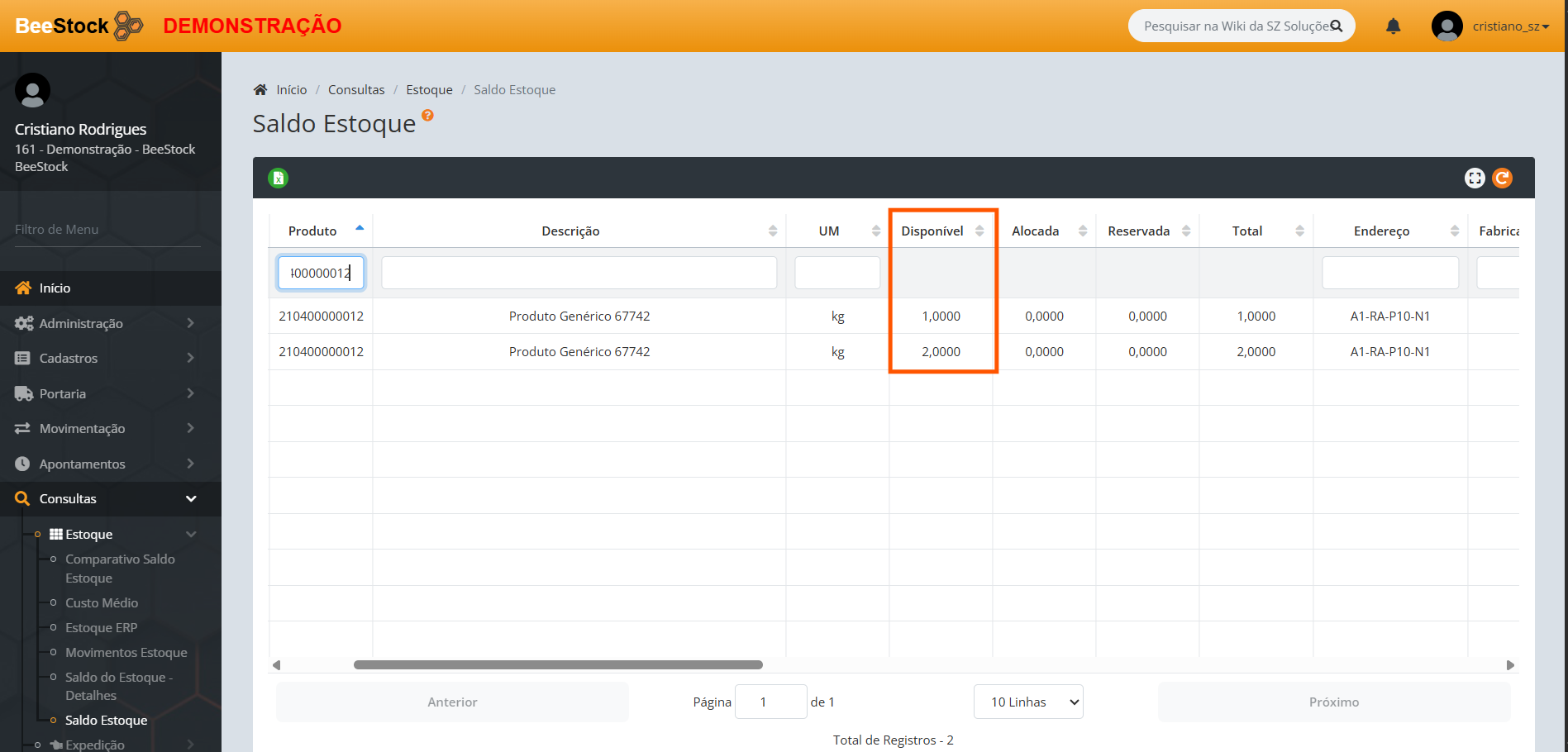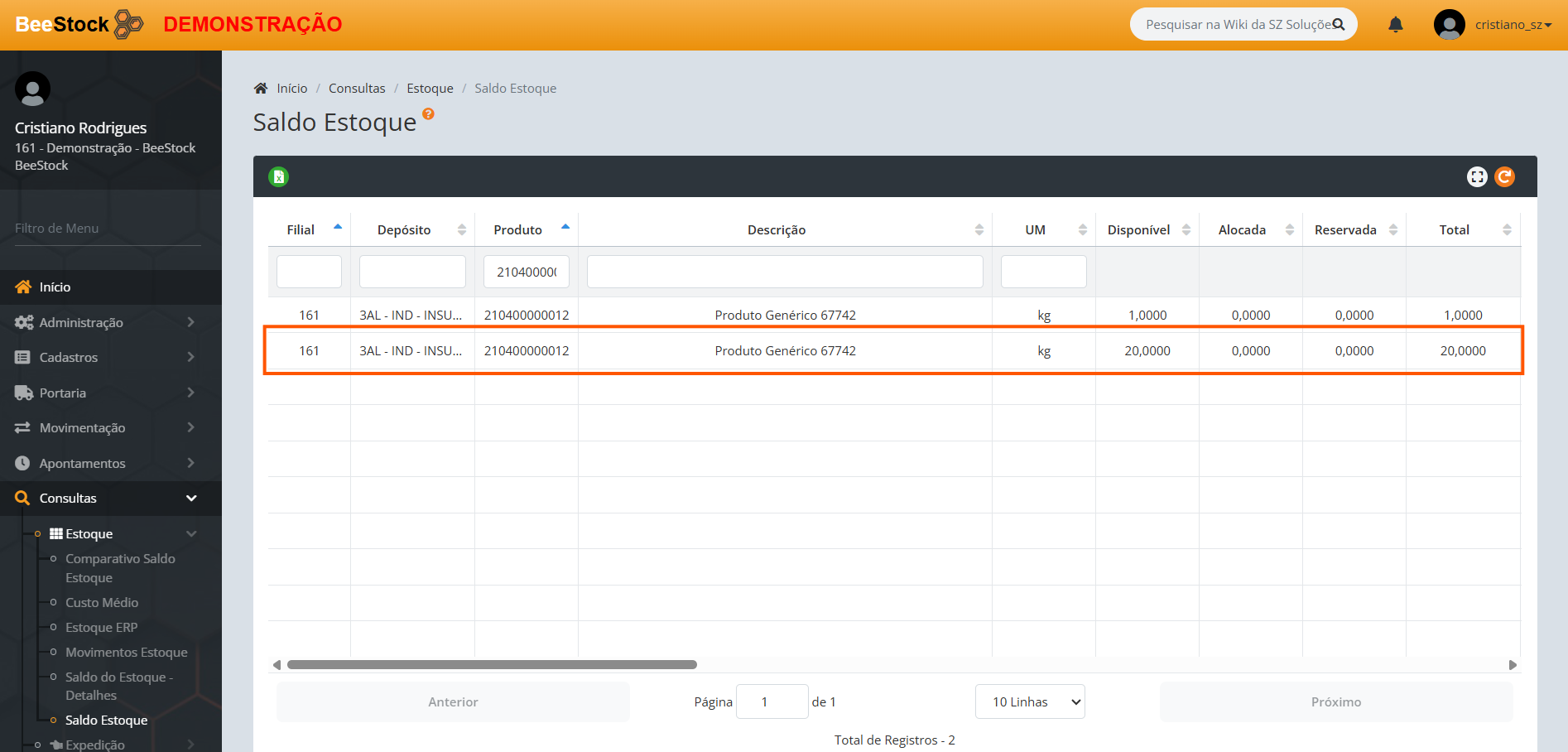 Para exemplificar segue saldo de antes da confirmação do inventário acima, onde o na tela Saldo Estoque o produto era de 2 Kg: