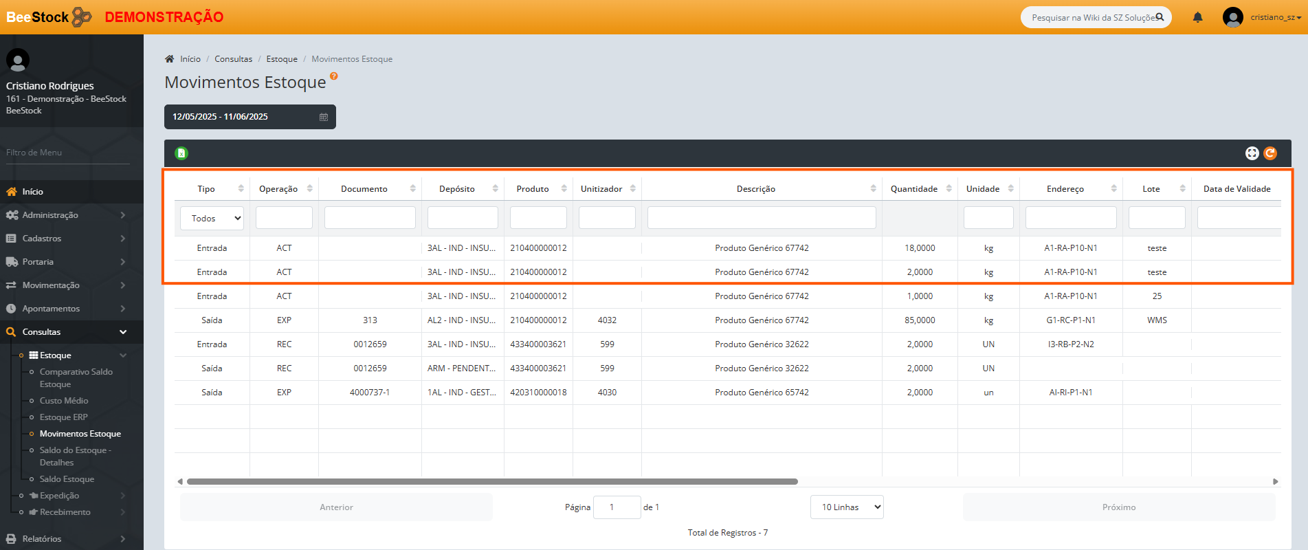 Onde foi realizada uma Entrada do tipo de Operação ACT (Acerto via inventário físico), adicionando 18 kilos do item ao endereço ajustado, deixando o saldo de 20 KG’s conforme realizado via inventário físico.