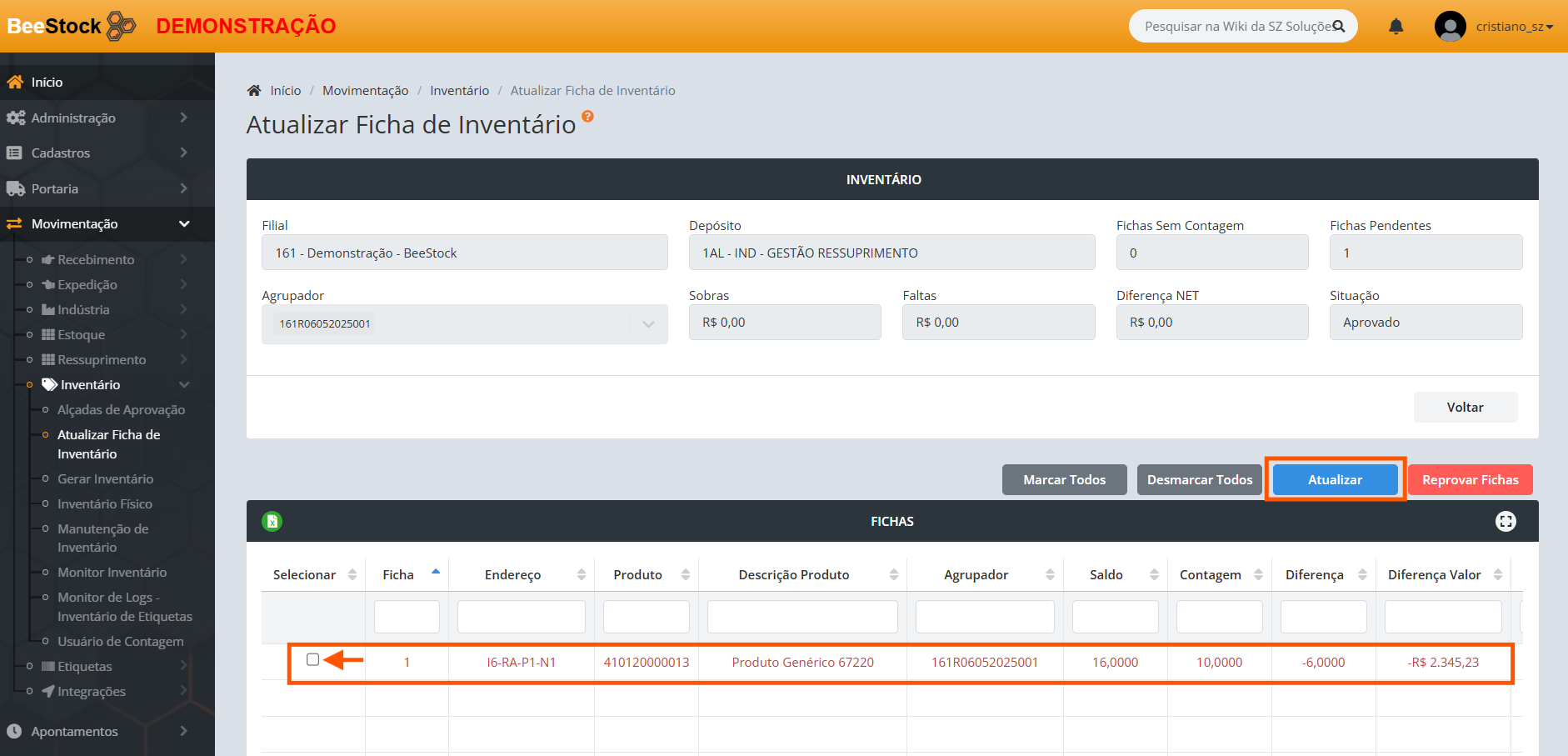 Localizado no menu Movimentação > Inventário > Atualizar Ficha de Inventário, nesta tela é possível realizar atualizações das fichas de inventário, para isso:
