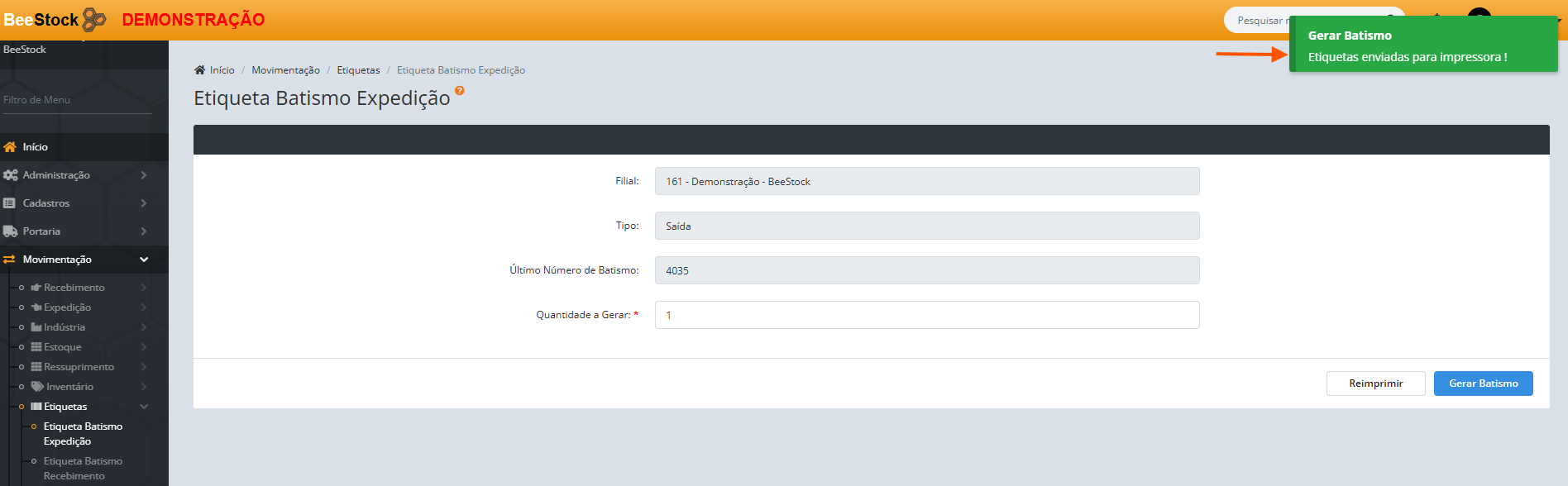5. Será apresentada a mensagem de confirmação Etiquetas enviadas para impressora!.