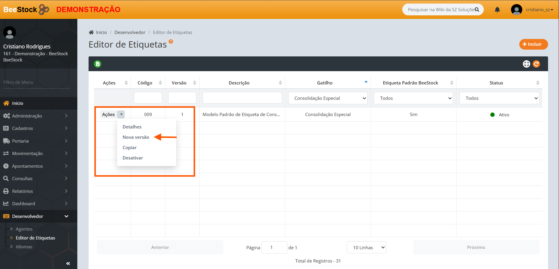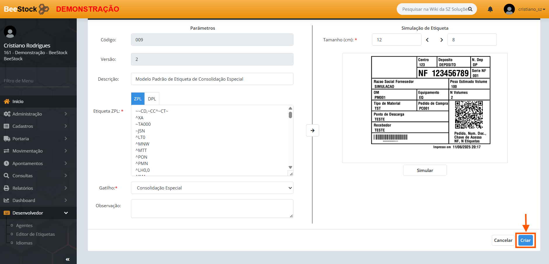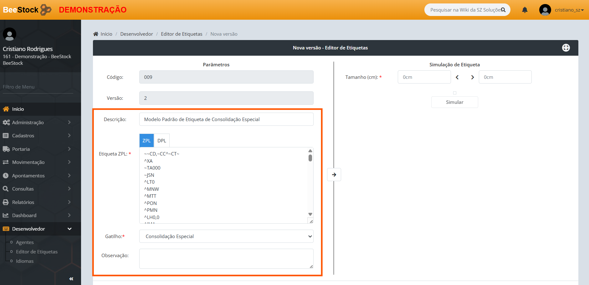 Localizado no menu Desenvolvedor > Editor de Etiquetas, nesta tela poderá ser criada etiqueta de consolidação.