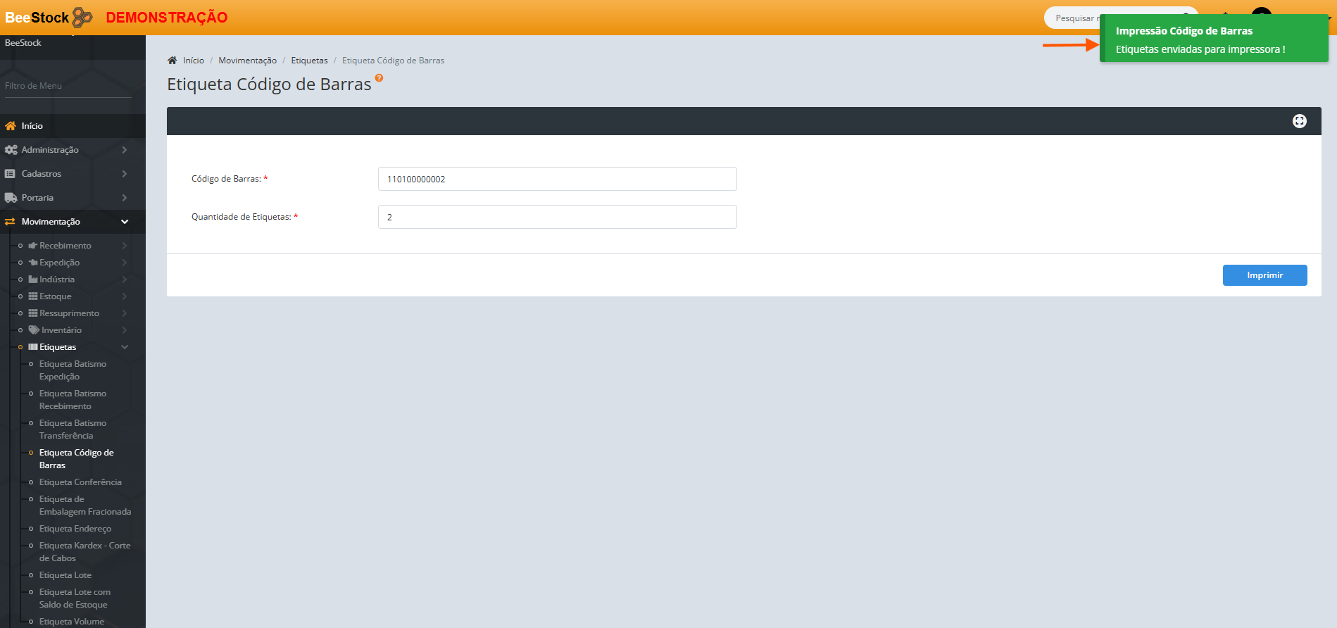 6. Será apresentada a mensagem de confirmação Etiquetas enviadas para impressora! após clicar em Prosseguir.