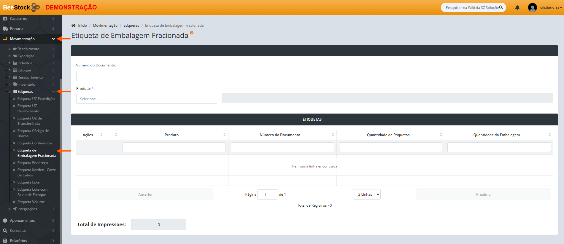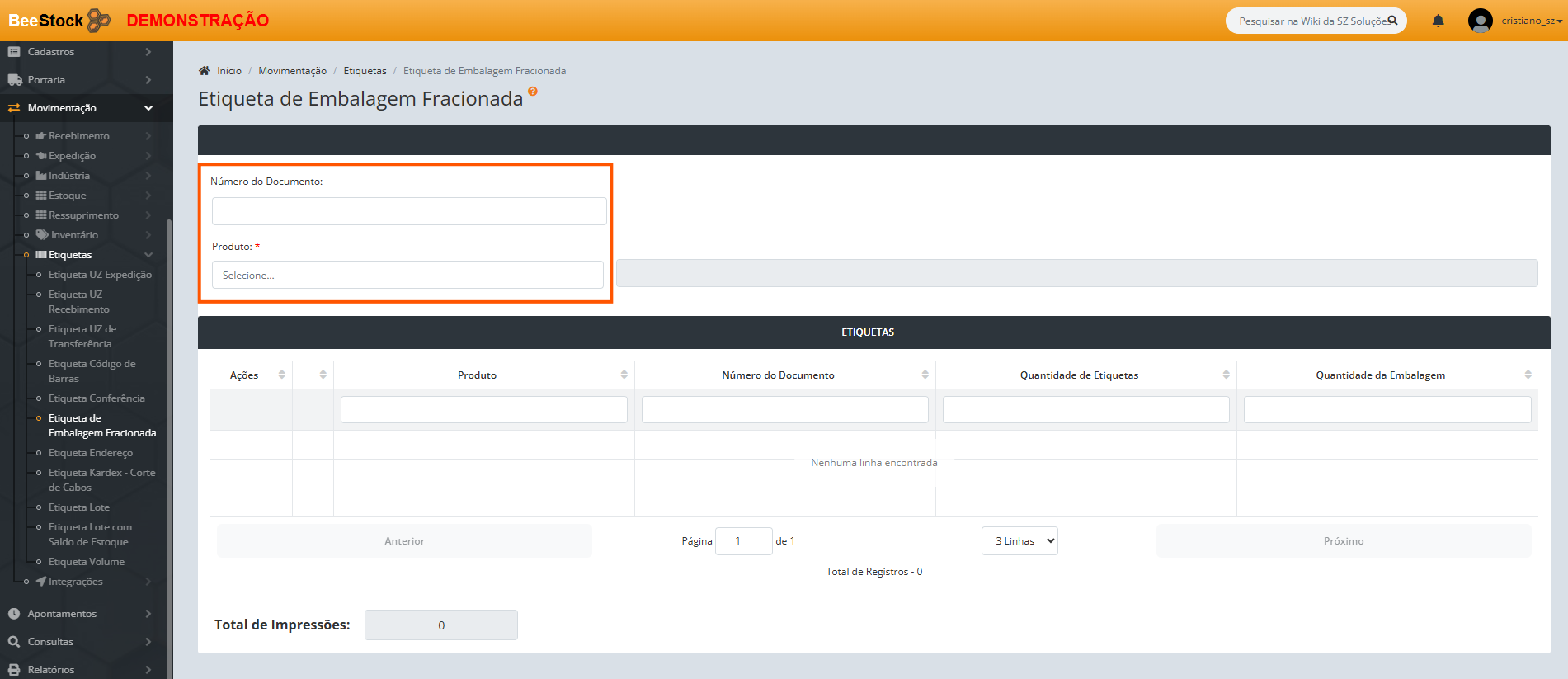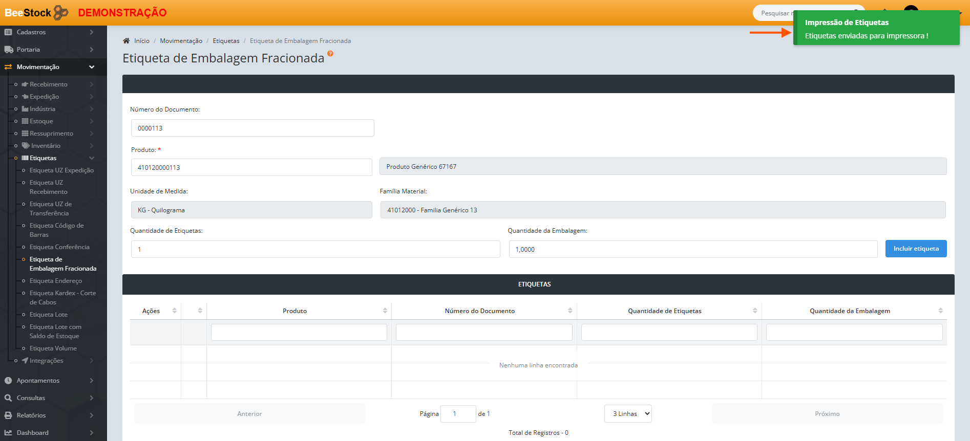 Localizado no menu Movimentação > Etiquetas > Etiqueta de Embalagem Fracionada, essa funcionalidade permite a impressão de etiquetas de embalagens de produtos com suas quantidades.