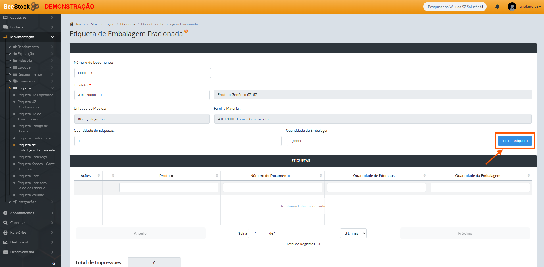 1. Na tela Etiqueta de Embalagem Fracionada preencha as informações e após clicar em Incluir Etiqueta: