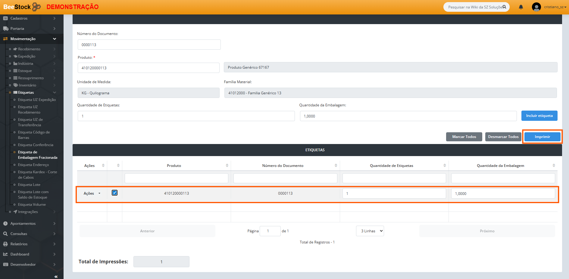 2. Selecionar etiqueta marcando o check-box e Clicar em Imprimir.