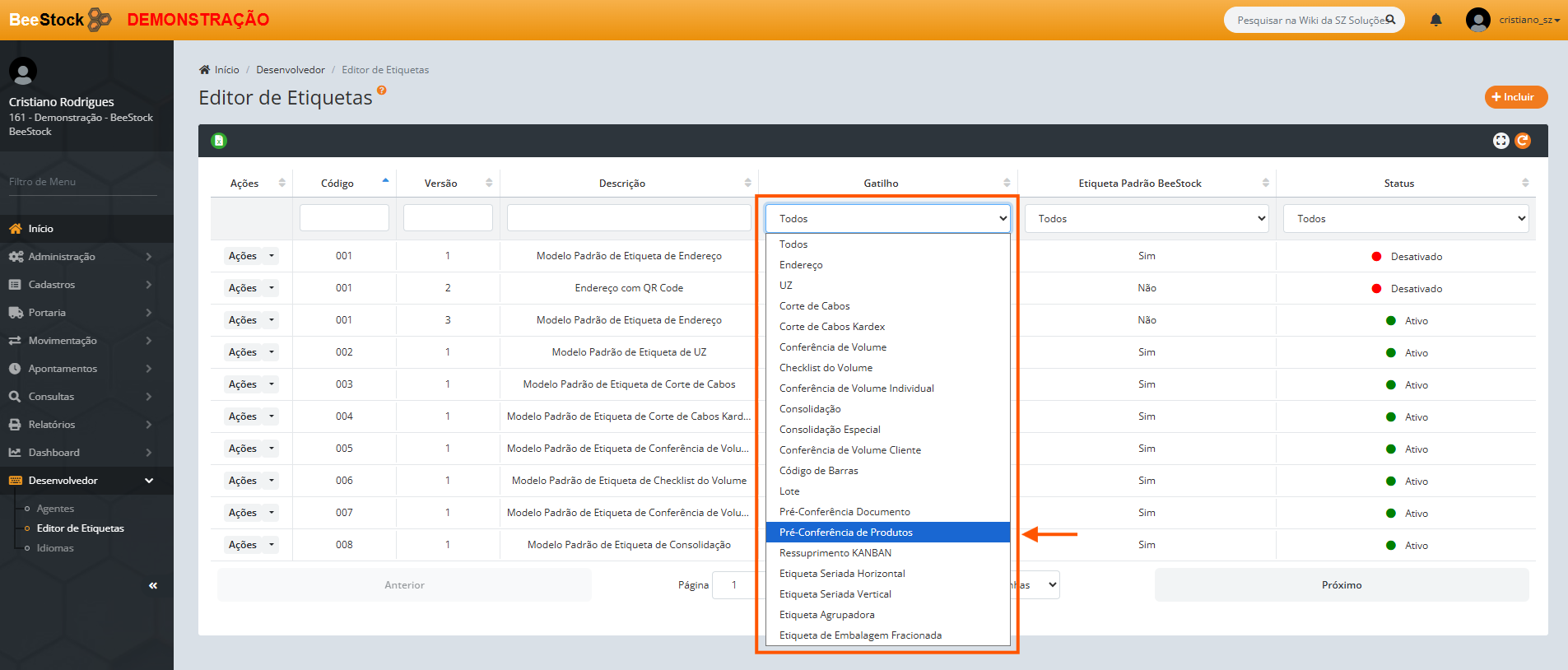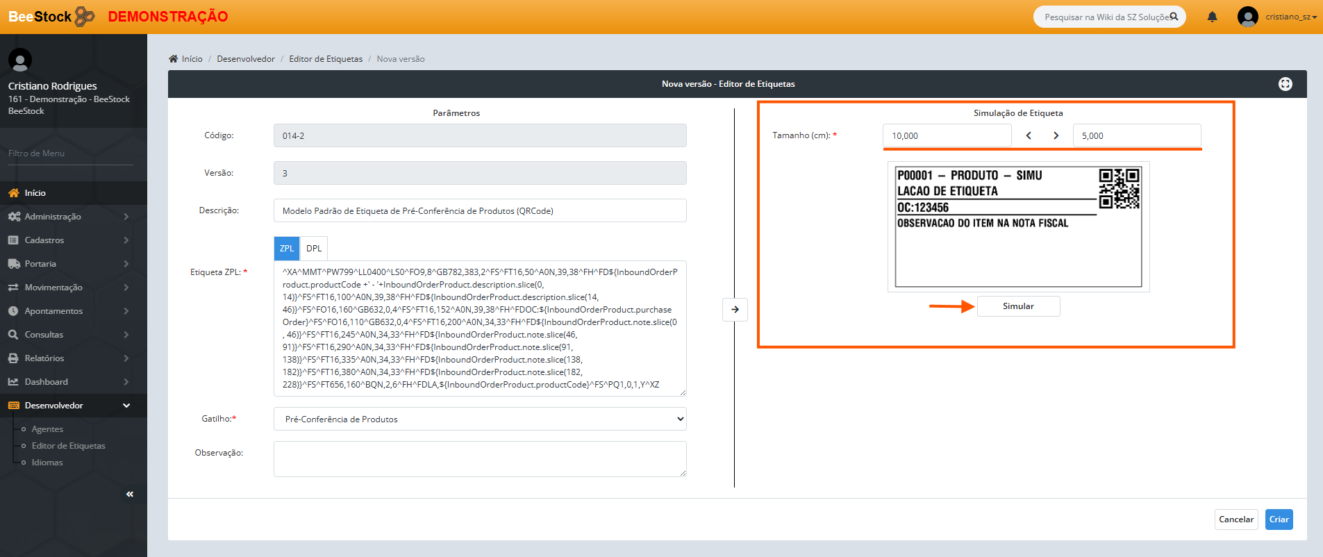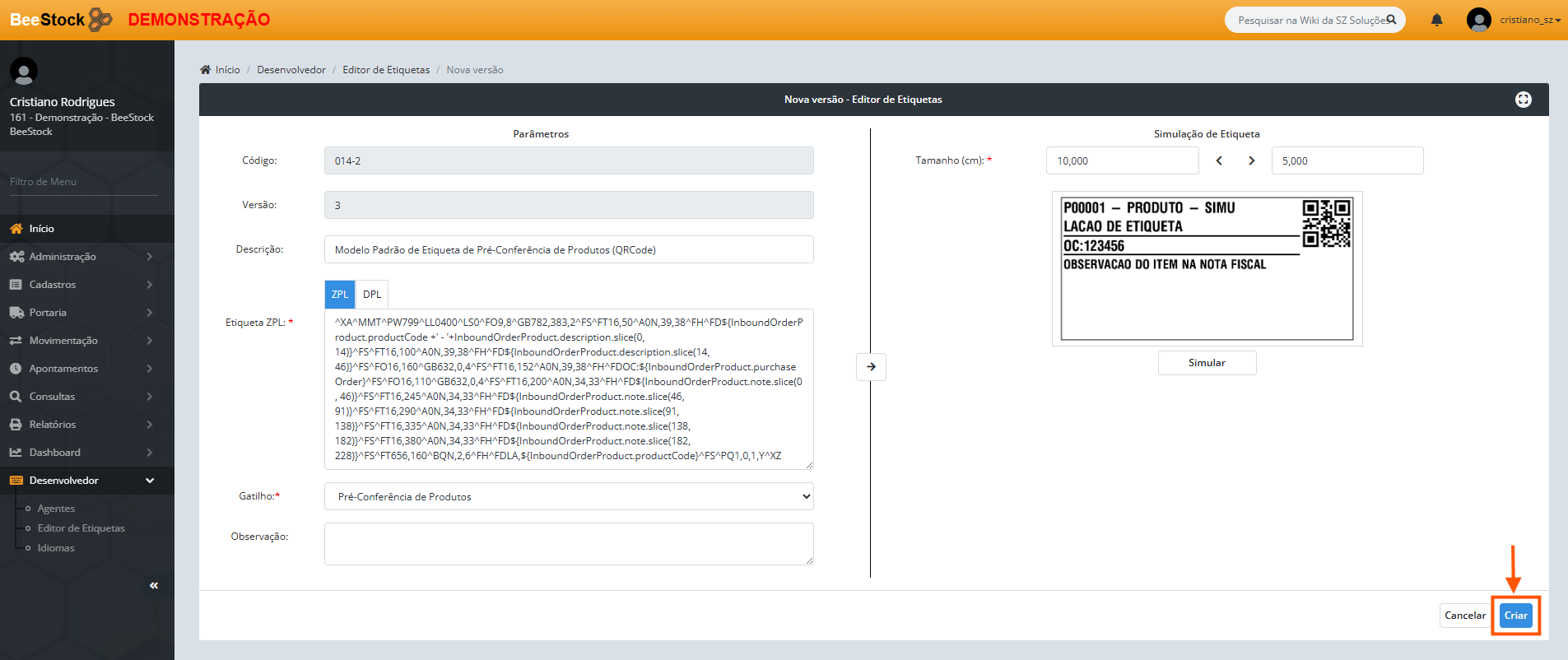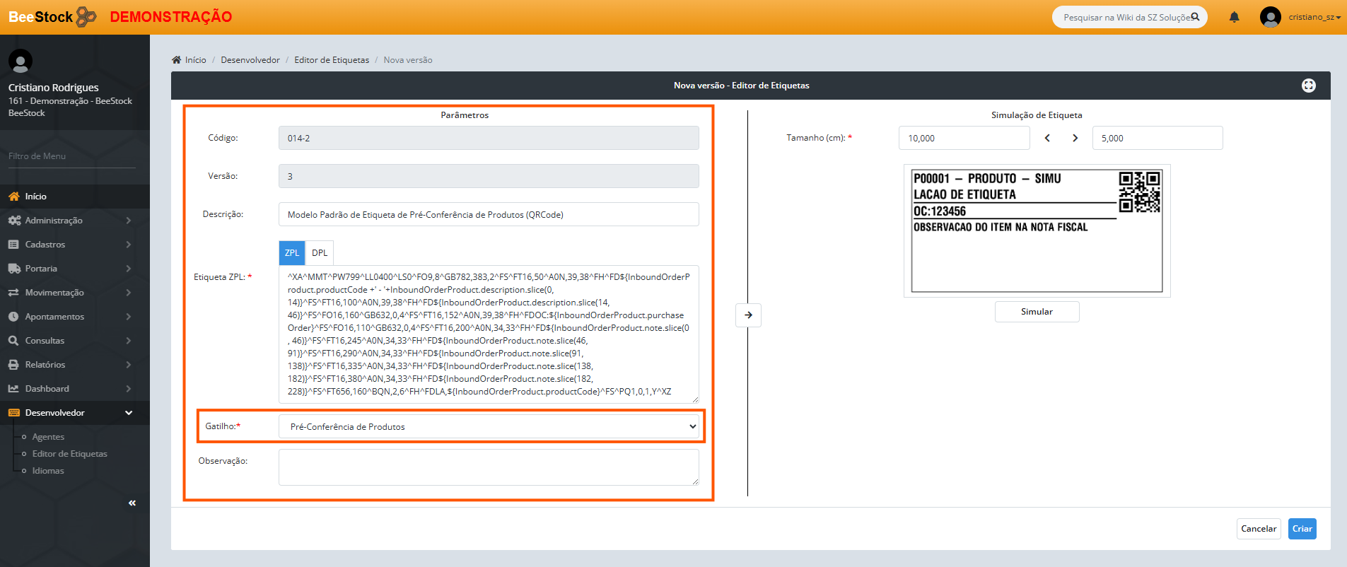 Localizado no menu Desenvolvedor > Editor de Etiquetas, nesta tela poderá ser criada etiqueta de Pré-Conferência de Produtos.