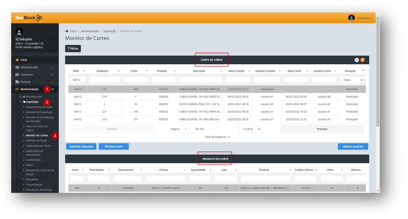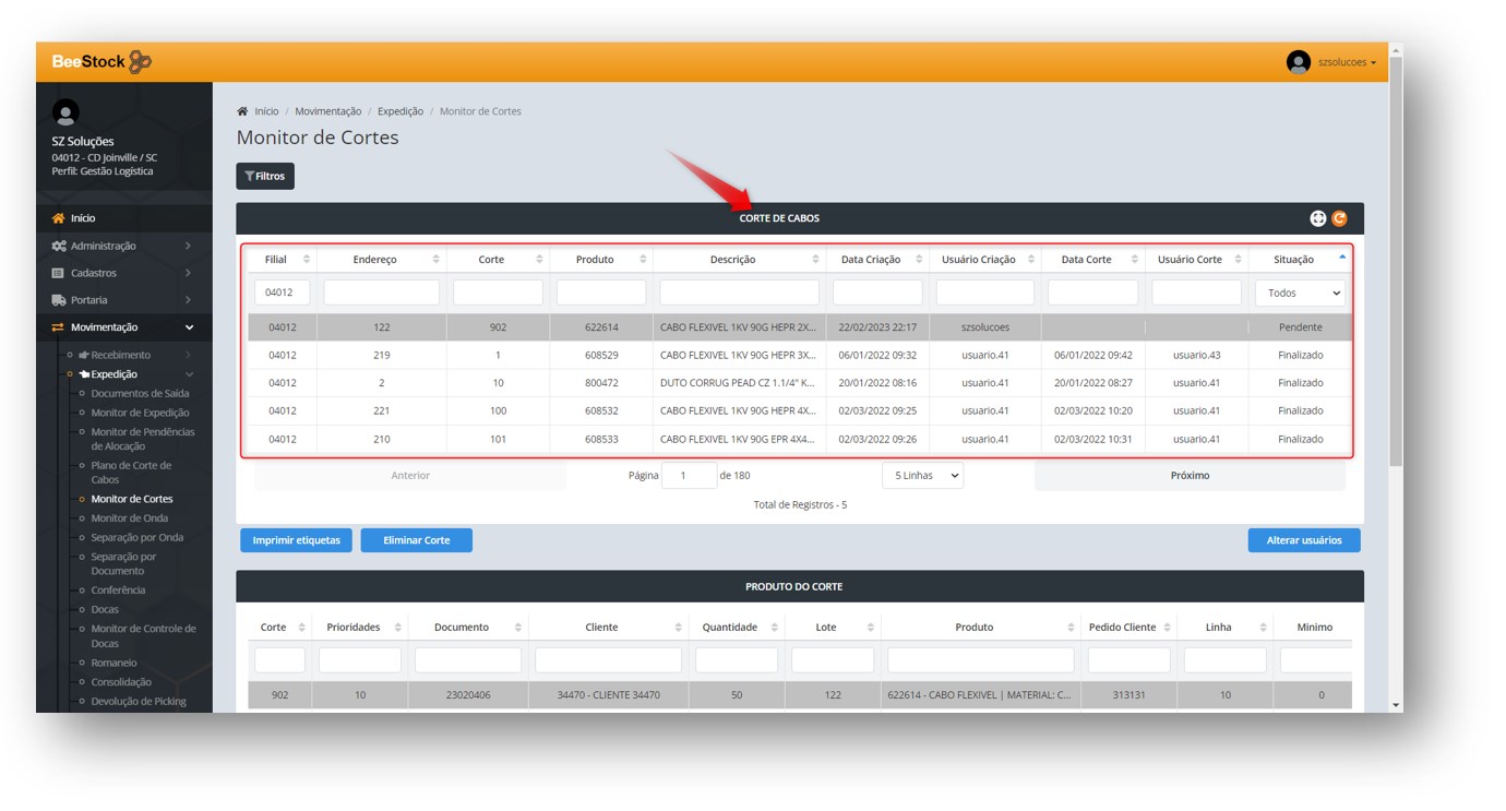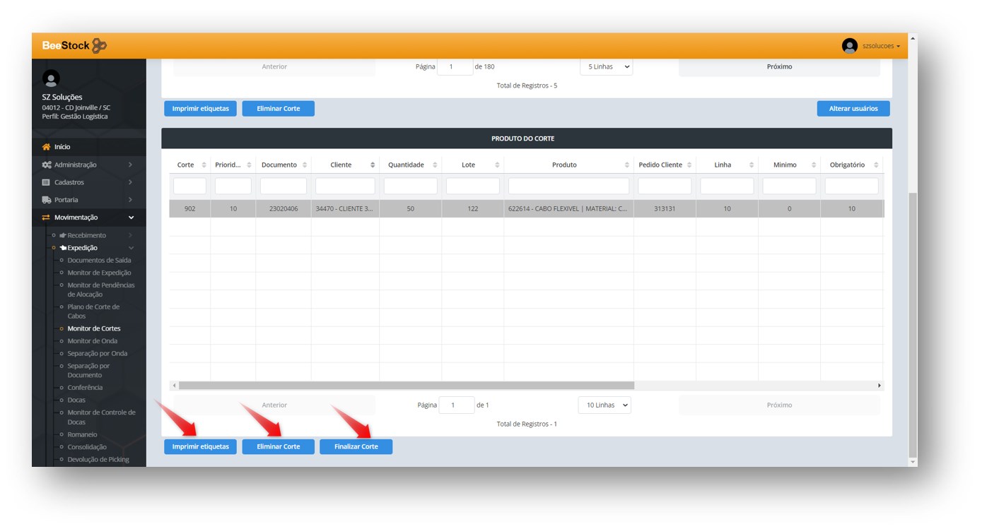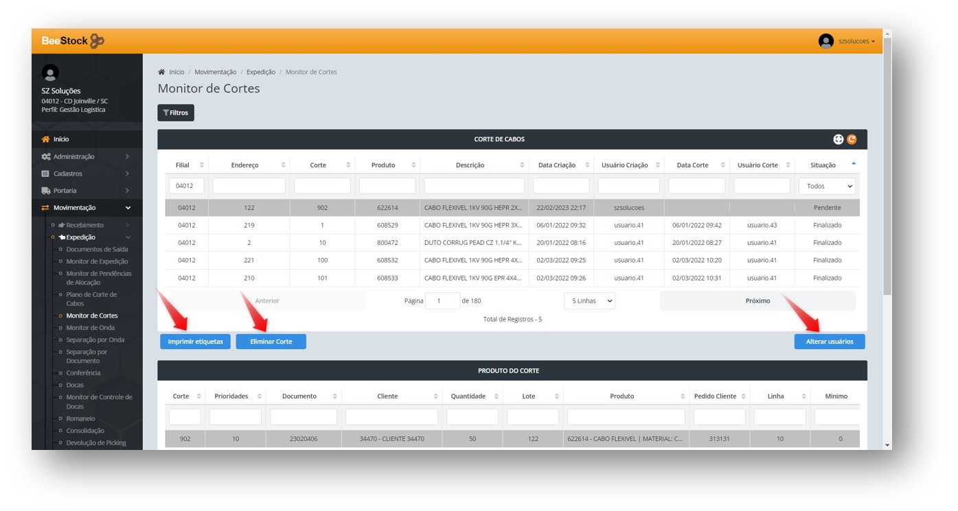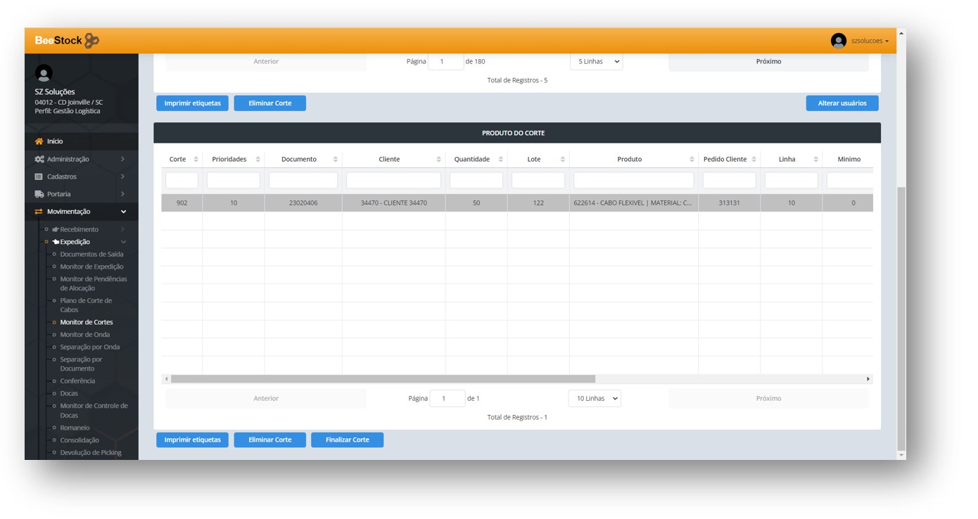Na aba de Corte de Cabos o usuário tem também a possibilidade de Imprimir Etiquetas, Eliminar o Corte e Alterar Usuários.