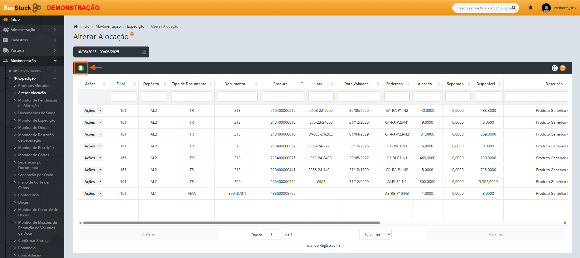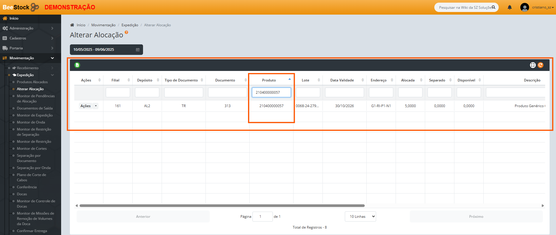 • Onde ao filtrar por exemplo apenas pelo Produto, será aplicado filtro exibindo todos os documentos de saída onde este produto consta com saldo alocado, conforme exemplo do filtro abaixo: